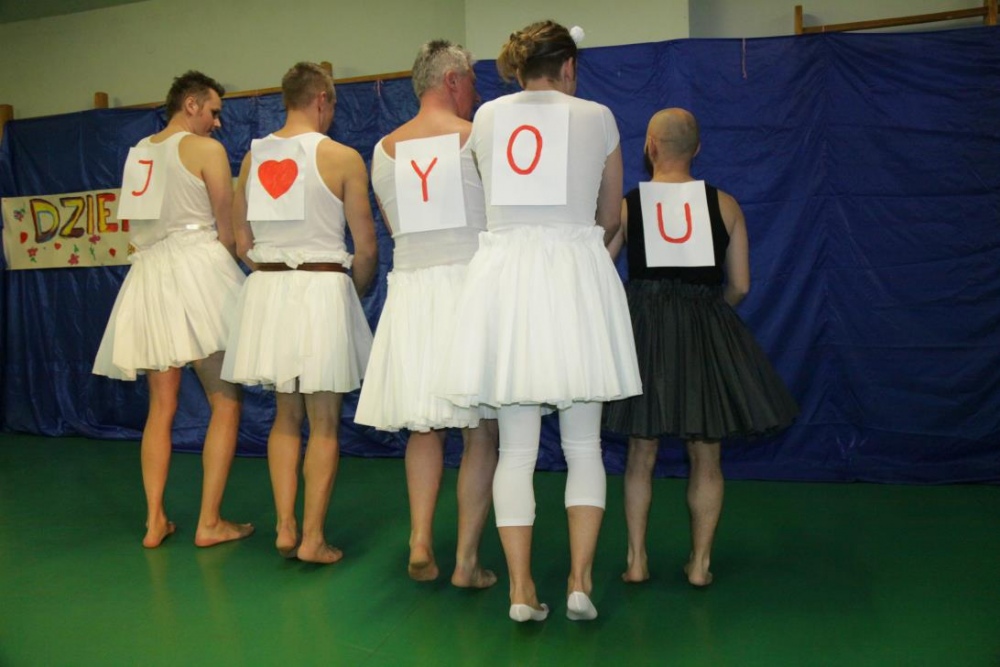 W czasie, gdy Panowie przygotowywali gwóźdź programu na scenie pojawili sie uczniowie kl. III i zaprezentowali występ do utworu "Ruda". Punktem kulminacyjnym imprezy był wsytęp byłej grupy Szpagat, która powiększyła skład i przekwalifikowała się na zespół baletowy wypełniając niszę rynkową. Zaprezentowany układ choreograficzny najwyższego światowego poziomu, z oryginalnym;) wyznaniem "I LOVE YOU" zrobił furrorę!!! Potem były jeszcze życzenia, kwiaty no i nie obeszło się bez kalorii...;)