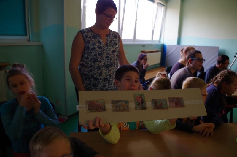 Tak jak zwykle było rozpoznawanie, nazywanie, liczenie, segregowanie i układanie wzorów. Tym razem uczniowie ćwiczyli te umiejętności z wykorzystaniem jesiennych leśnych skarbów tj. kolorowych liści, żołędzi, kasztanów, jarzębiny, bukowych orzeszków, szyszek itp. Uczestnicy konkursu przypomnieli sobie jak trzeba ubrać się na jesienny spacer, a także jakie zwierzęta można zobaczyć w lesie. Na pamiątkę wszystkim klasom zostały jesienne „ludziki”.
