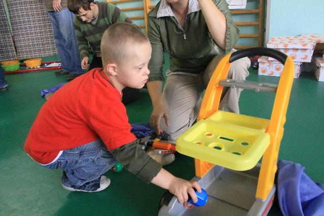 Chłopcy rywalizowali z sobą w różnych konkurencjach. Konkursowym zadaniem było między innymi jazda na jeździkach, wyścigi samochodami, zakręcanie i rozkręcanie śrubek, segregowanie narzędzi oraz rozpoznawanie ich z zamkniętymi oczyma, budowanie wieży z klocków, jedzenie na czas kiełbasek oraz kiślu. Chłopaki i Ci mali i Ci duzi świetnie się spisali!!!
