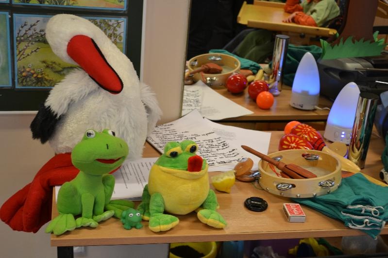 Celem lekcji było: integrowanie grup r-w, rozwijanie wrażliwości dotykowej, smakowej, wzrokowej, węchowej i słuchowej w oparciu o przedmioty i eksponaty naturalne oraz usprawnianie motoryki małej. Uczniowie doznawali smak i zapach cytryny, konwalii, bzu, stokrotek oraz bawili się zieloną chustą i dmuchali świeczkę.