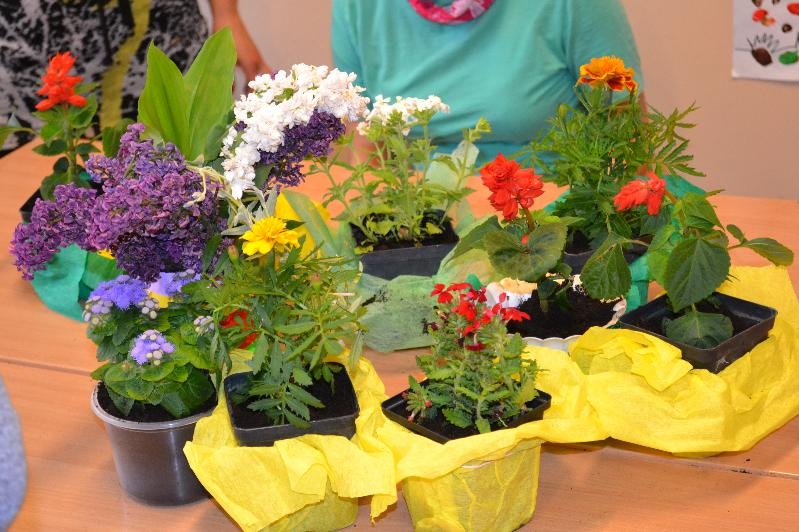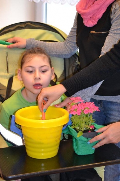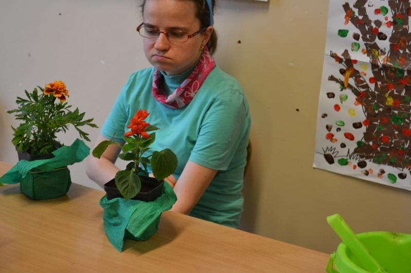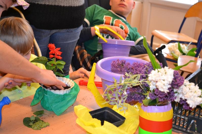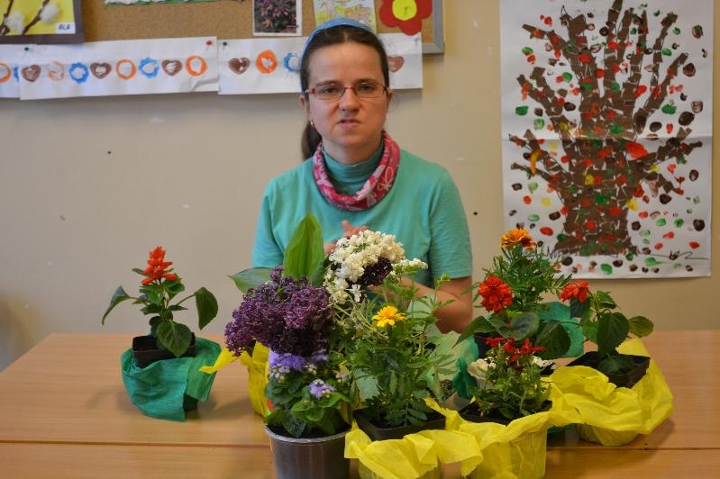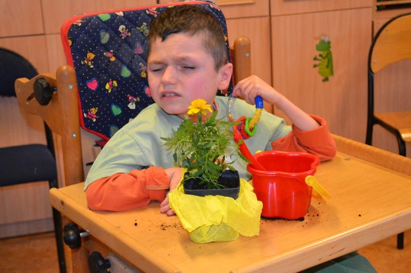 Niespodzianką dla wszystkich była wizyta Pani Wiosny z koszykiem pełnym kwiatów. Na zajęciach nie zabrakło także piosenek takich jak: „Wiosna w błękitnej sukience”, „Wiosenne porządki”, „Kle kle boćku”, „Żabka”, „Ogrodniczka”. Dzieci miały okazję przywitać się z bocianem i żabą oraz posłuchać ich odgłosów. Na zakończenie zajęć podopieczni oddziałów r-w mieszali ziemię oraz z pomocą nauczycieli i opiekunek posadzili i podlali kwiatki.