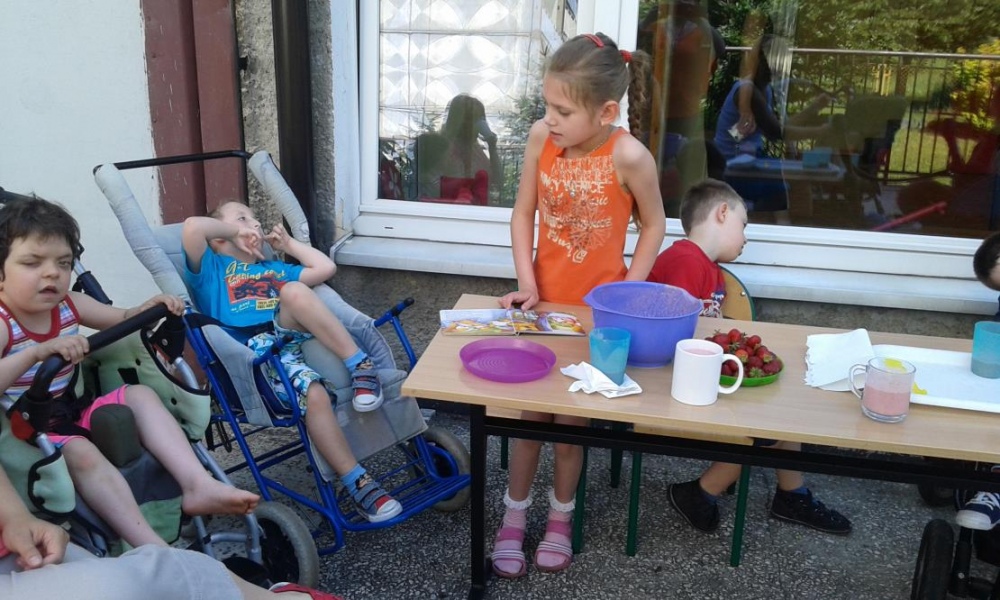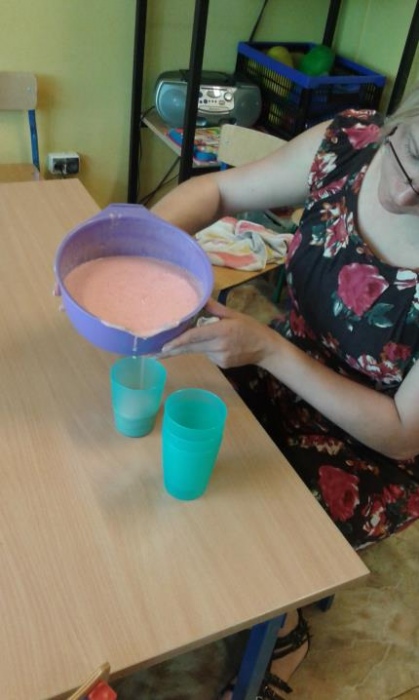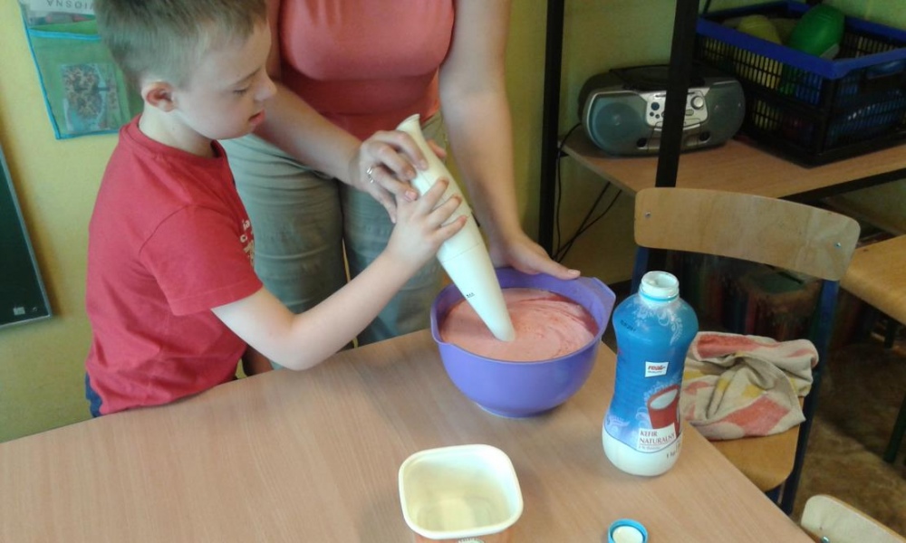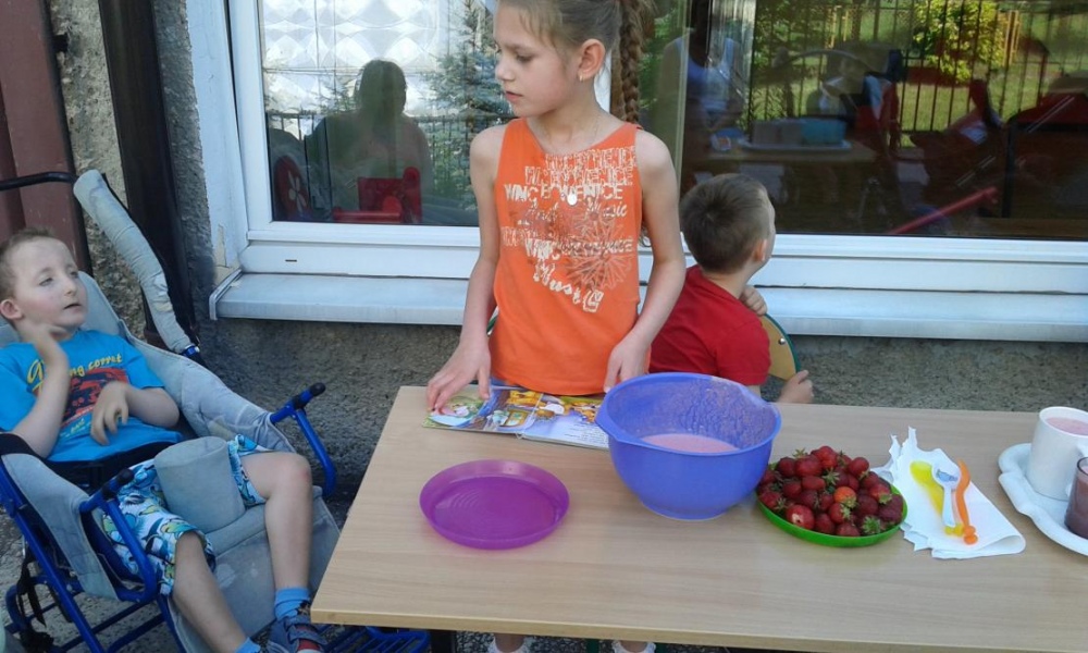 Zrobiliśmy pyszny koktajl truskawkowy, którym delektowaliśmy się na szkolnym tarasie .