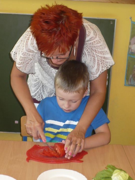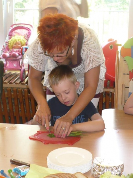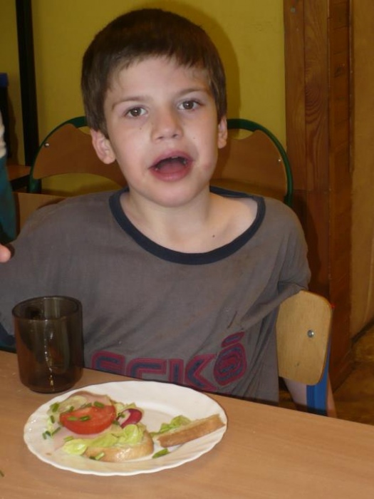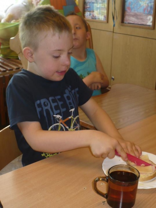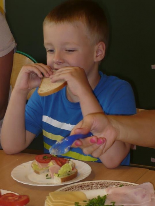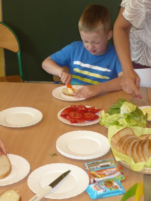 We miniony wtorek przedszkolaki wybrały się do pobliskiego sklepu po potrzebne artykuły do przygotowania zdrowego, drugiego śniadania. Przynieśli: rzodkiewki, pomidory, sałatę, ogórka, szczypiorek, chlebek oraz masło. Dzieci dokładnie umyły ręce oraz wszystkie warzywa i z wielkim entuzjazmem przystąpiły do robienia kanapek. Z pomocą pań kroiły, smarowały i jadły. To wiosenne drugie śniadanie było uroczystym zakończeniem programu w którym uczestniczyły przedszkolaki: Kubusiowi Przyjaciele Natury. Każde dziecko otrzymało medal z „Kubusiem” oraz książeczkę, natomiast Przedszkole otrzymało Certyfikat uczestnictwa w całorocznym programie.