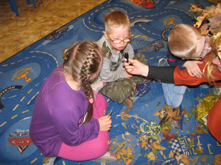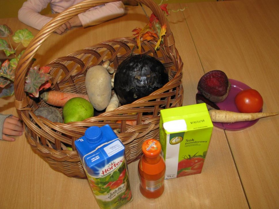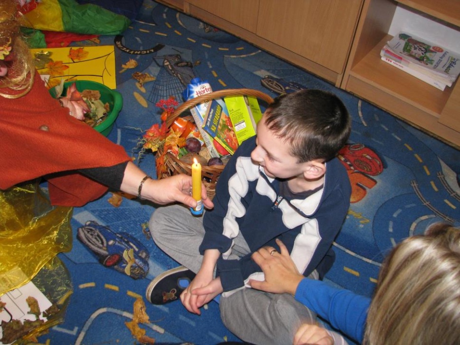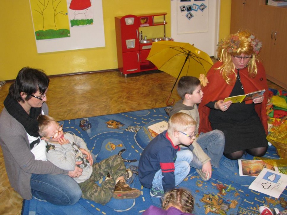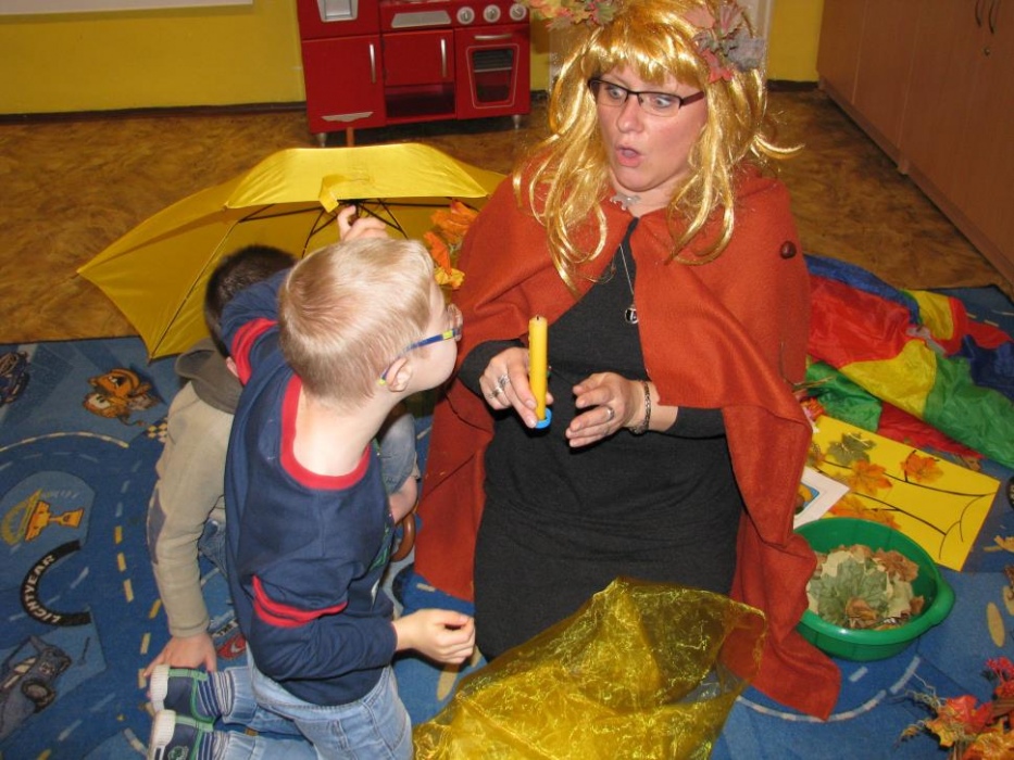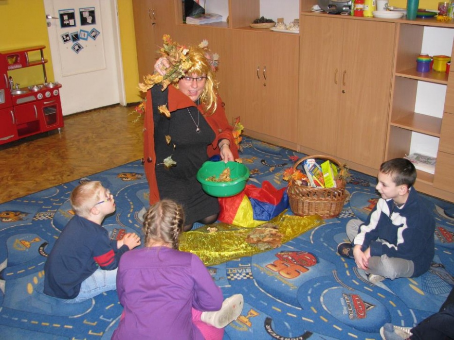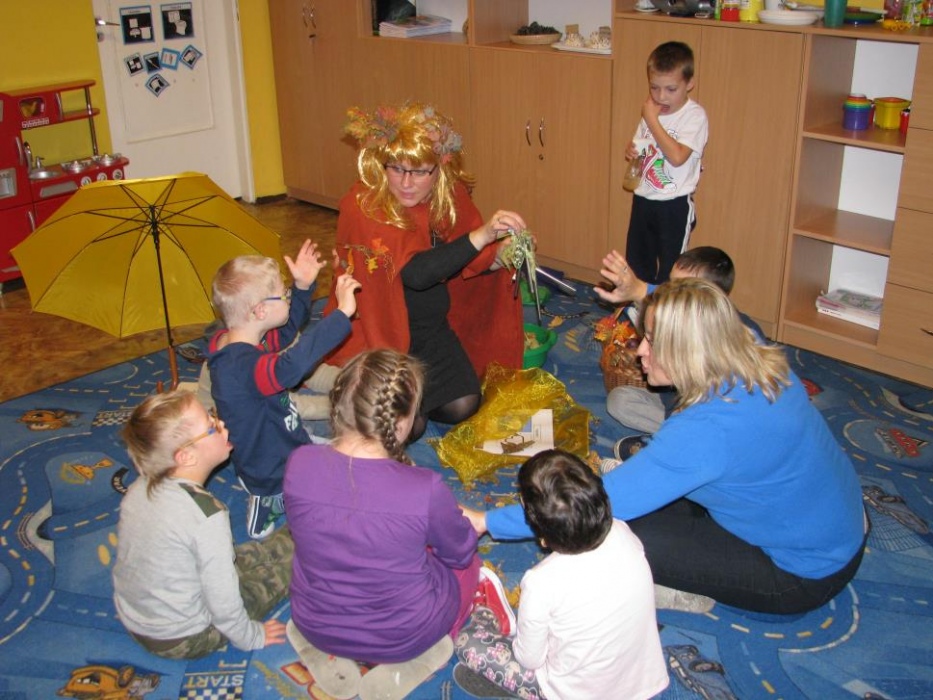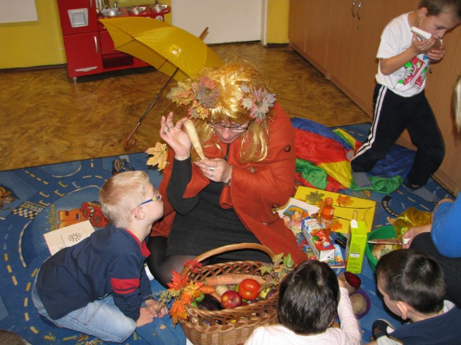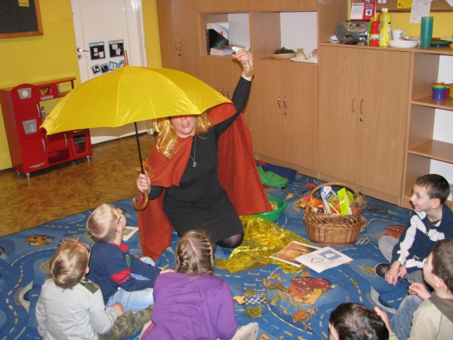 Dnia 21.11.2014 r do naszych przedszkolaków i kl.I a przyszedł gość specjalny - Pani Jesień, która zaprosiła wszystkie dzieci do wspólnej zabawy śpiewając piosenkę „Jestem Jesień z wielkim koszem…”. Pani Jesień pokazała nam ,że w czasie jej pory roku występują różne zjawiska atmosferyczne jak deszcz ,przed którym chowaliśmy się pod parasolem, wiatr ,który naśladowaliśmy i stukające o szyby kropelki deszczu ,przeczytała wiersz „Na straganie ” J.Brzechwy, po którym dzieci odgadywały nazwy warzyw i..owoców znajdujących się w koszu, które potem smakowaliśmy (jedząc owoce,warzywa i pijąc soki z nich zrobione) mogliśmy razem z..Jesienią pójść na jeżykowy spacer w rytm bębenka. Było także czarowanie i..rozpoznawanie po dotyku i..smaku darów jesieni. Dzieci mogły także wykazać się plastycznie dekorując jesienne drzewo kolorowymi liśćmi, malować kropki na kapeluszach muchomorów wykorzystując tu przez prowadzących elementy metody Bon Depart a po wszystkim mogliśmy wykazać się swoją zręcznością w zabawie z balonami