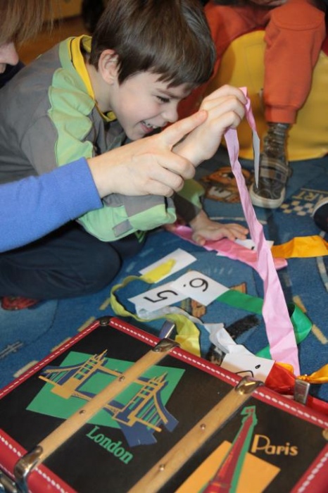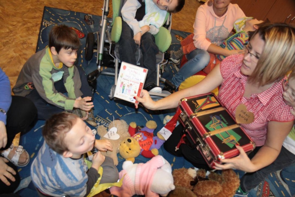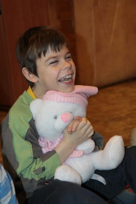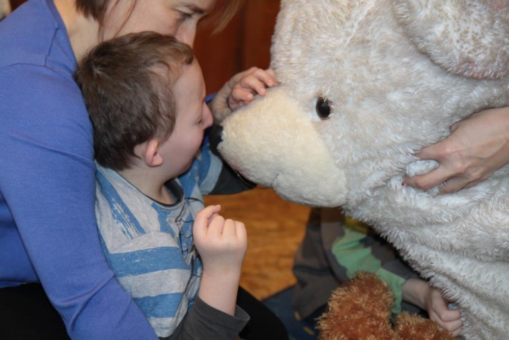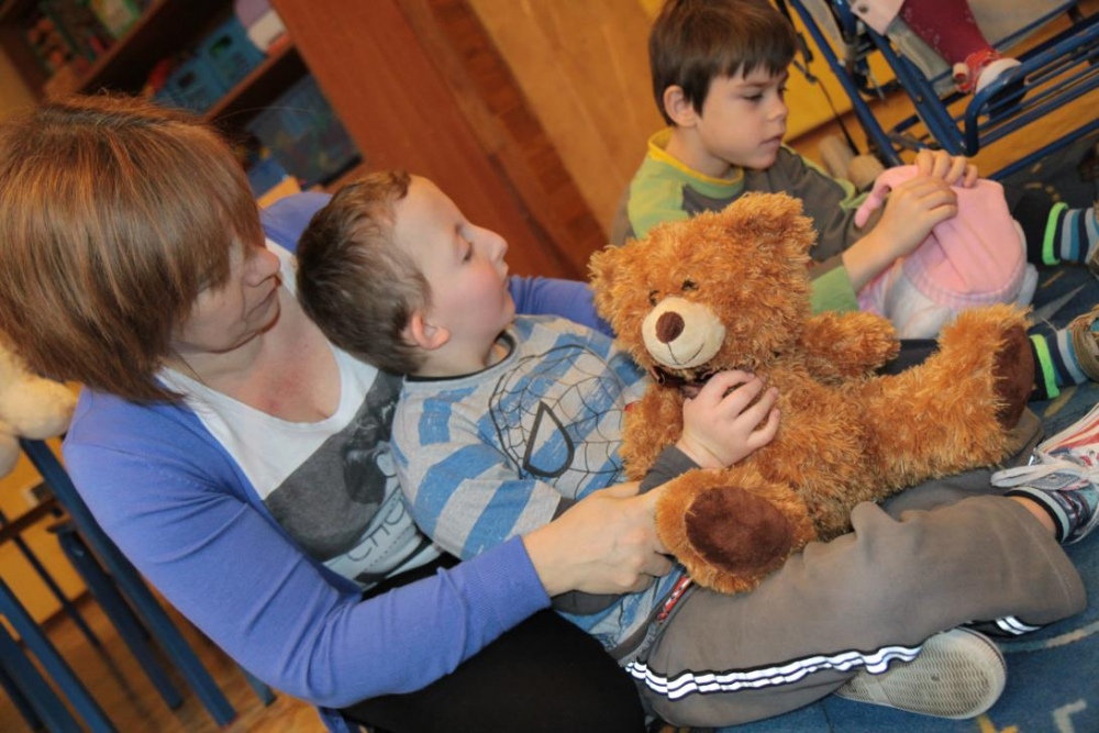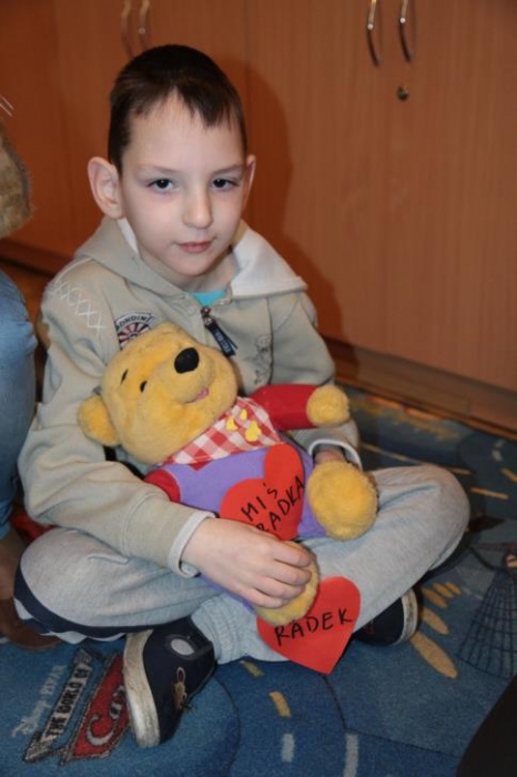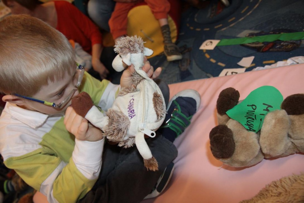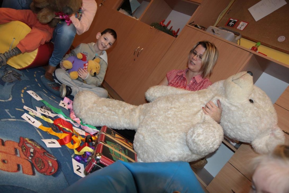 Okazało się, że najmłodsze klasy postanowił odwiedzić również Pluszowy Miś Podróżnik, który ze swojej podróżnej walizki wyczarował dla wszystki misiowe zabawy. Było szczególne misiowe powitanie, podczas którego dzieci prezentowały wszystkim swoje misie. Podczas misiowej zabawy ruchowej dzieci zamienieły sie w niedźwiadki i naśladowały misiowe zwyczaje w trakcie opowieści. Była też znana misiowa zabawa kołowa "Stary niedźwiedź", poszukiwania ukrytego w sali pluszaka oraz smakowanie misiowego co nieco czyli miodku. Podróżnik prezentował też zebranym swój specjalny "mówiący" misiowy album, w którym na fotografiach można było rozpoznać znane pluszowe misie.
