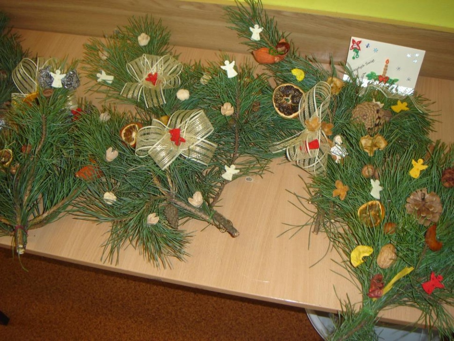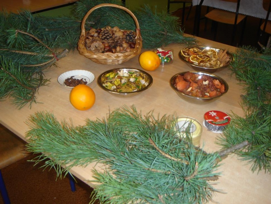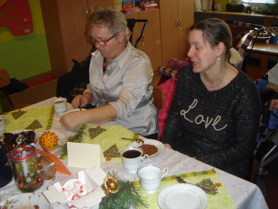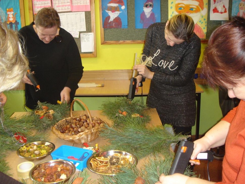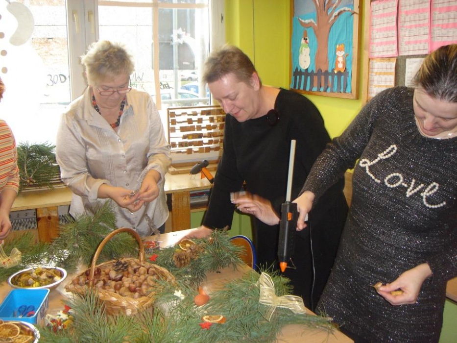 11 grudnia odbyło się w I i II oddziale rewalidacyjno – wychowawczym świąteczne spotkanie rodziców połączone z warsztatami. Celem było robienie świątecznych stroików oraz integracja rodziców. Mamy tworzyły stroiki z naturalnych elementów. Do ozdabiania gałązek sosny wykorzystały suszone plastry pomarańczy, cytryny i jabłka, szyszki, orzechy, kasztany, laski cynamonu i pachnący susz kwiatowy. Uczniowie z pomocą nauczyciela wbijali goździki do pomarańczy, które były ozdobą naszego stołu. Przy stole dominował świąteczny nastrój wypełniony zapachem ciasta piernikowego, cynamonu i świątecznymi melodiami. Mamy zabrały piękne stroiki do domu.