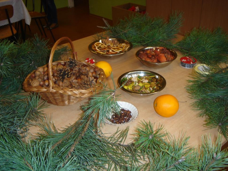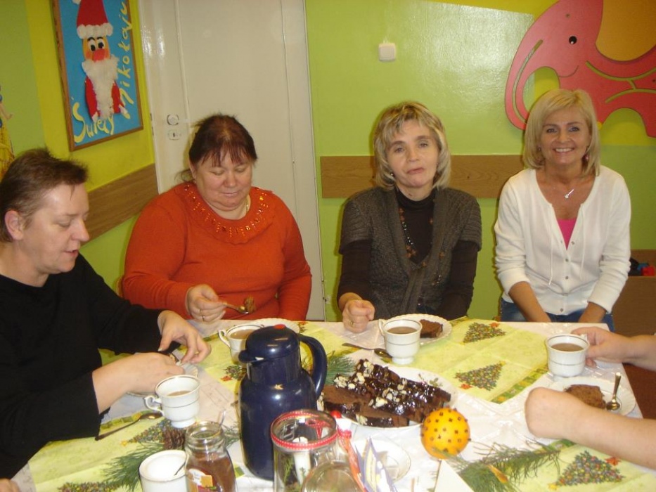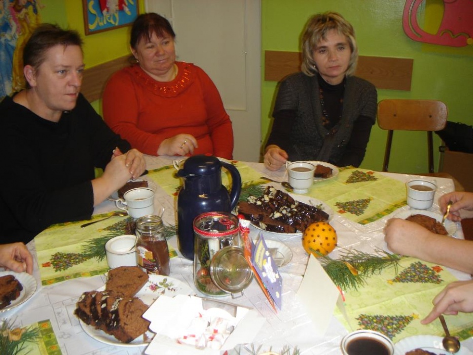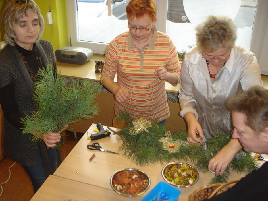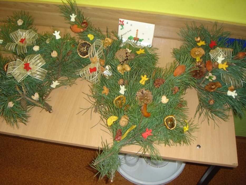 11 grudnia odbyło się w I i II oddziale rewalidacyjno – wychowawczym świąteczne spotkanie rodziców połączone z warsztatami. Celem było robienie świątecznych stroików oraz integracja rodziców. Mamy tworzyły stroiki z naturalnych elementów. Do ozdabiania gałązek sosny wykorzystały suszone plastry pomarańczy, cytryny i jabłka, szyszki, orzechy, kasztany, laski cynamonu i pachnący susz kwiatowy. Uczniowie z pomocą nauczyciela wbijali goździki do pomarańczy, które były ozdobą naszego stołu. Przy stole dominował świąteczny nastrój wypełniony zapachem ciasta piernikowego, cynamonu i świątecznymi melodiami. Mamy zabrały piękne stroiki do domu.
