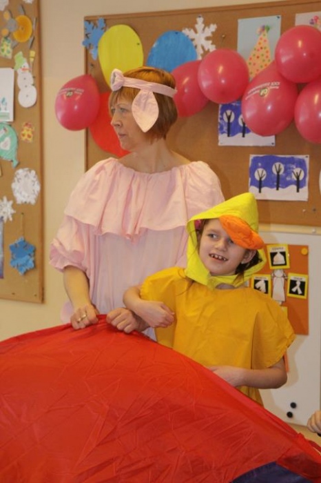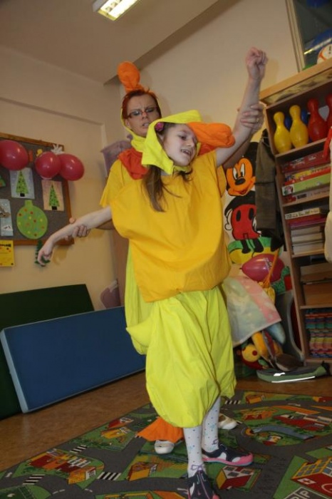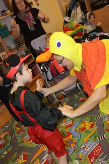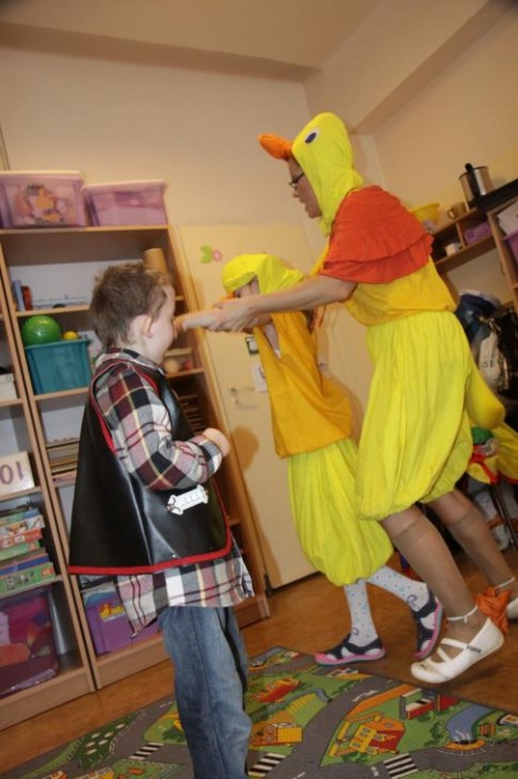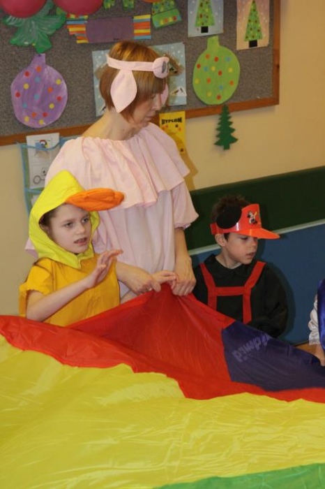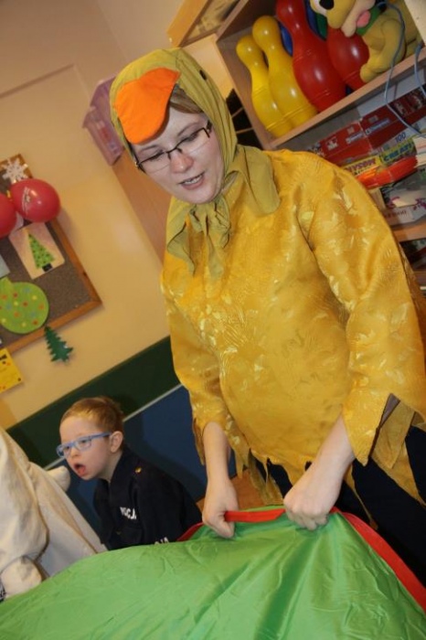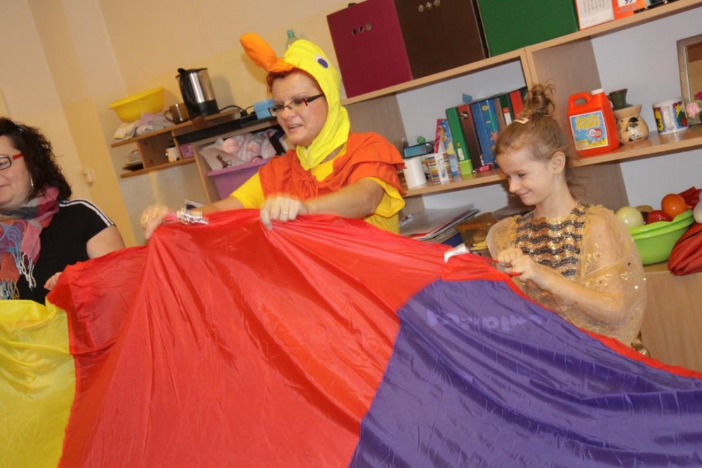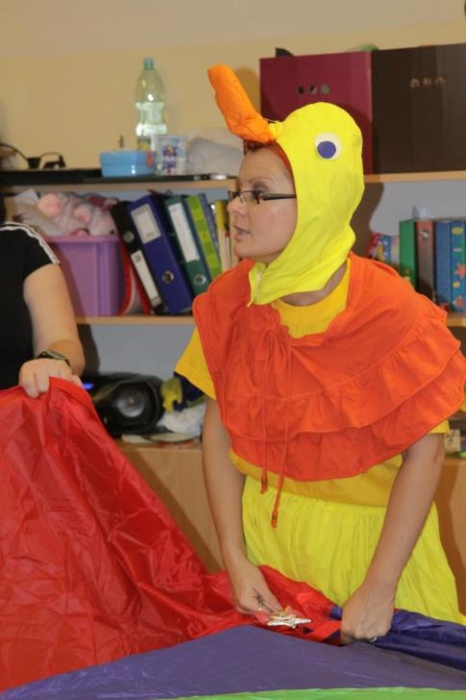 Świetnie bawiliśmy się z chustą Klanzy oraz Kaczuszką, która nauczyła dzieci swojej ulubionej piosenki, która okazała się prawdziwym hitem - „Ta kaczuszka dziubek ma…”. Były ulubione zabawy m.in. „Rolnik”, „Pociąg”, „Mucholot”. Ogromną frajdę sprawiła uczestnikom niespodzianka bańkowa i poczęstunek.
