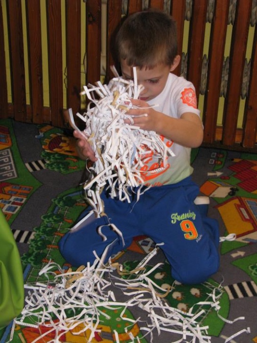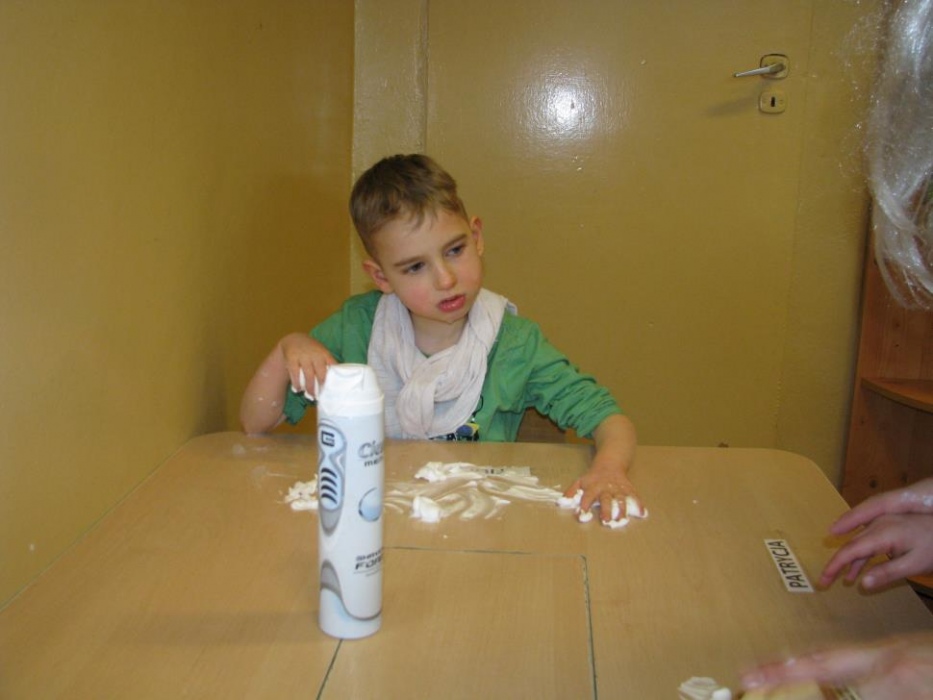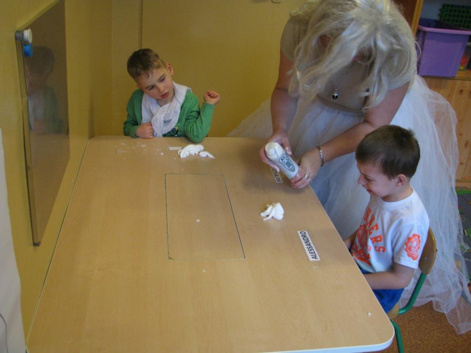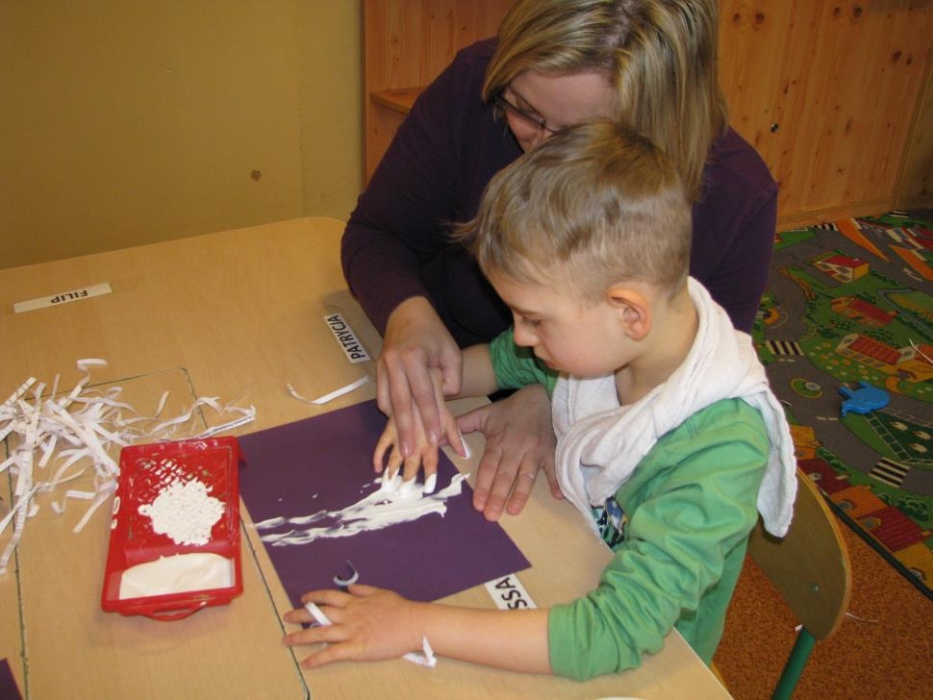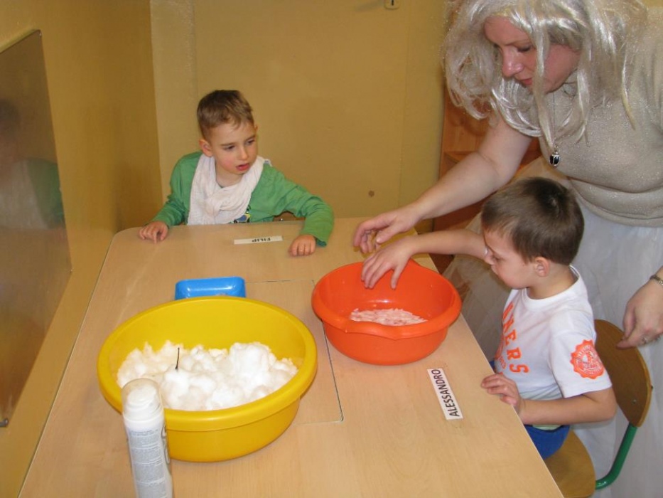 Dnia 30.01.2015 r do naszych przedszkolaków przyszedł gość specjalny - Pani Zima, która zaprosiła dzieci do różnych eksperymentów . Pani Zima pokazała nam ,że w czasie jej pory roku występują różne zjawiska atmosferyczne jak śnieg i lód, zimno -ciepło i że zima wcale nie jest taka zła jak mówią o tym słowa piosenki „ Hu Hu Ha nasza zima zła”. Przedszkolaki prócz eksperymentów z lodem ,śniegiem, płatkami mydlanymi zalanymi ciepłą wodą oraz pianką do golenia mogły wykazać się plastycznie wykonując „ Zimowy krajobraz” malowany palcami oraz ozdabiając kontur bałwana przyklejając guziki, „marchewkowy nos” i kapelusz. Na koniec wspólnie z Panią Zimą bawiły się w ścinkach imitujących śnieg. Po pożegnaniu Pani Zimy przedszkolaki poszły na śniegowy spacer:)