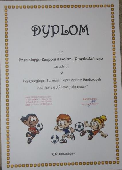 Dnia 25 lutego uczniowie klasy III a i IIIc SP wzięli udział w Integracyjnym Turnieju Gier i Zabaw pod hasłem „Cieszmy się razem” organizowanym przez Zespół Szkolno-Przedszkolny nr 1 w Rybniku. W zawodach nasi uczniowie rywalizowali z rówieśnikami z innych szkół. Współzawodnicząc podczas trudnych konkurencji sportowych świetnie się bawiliśmy i mieliśmy okazję zawrzeć nowe znajomości. Nagrodą za udział w zawodach jest zaproszenie wszystkich uczestników w dniu 01.06.2015r. do Rybnickiego Centrum Kultury na dwie bajki pt.: „Bajka o wężu” i „Zabawa w Śpiącą Królewnę”.