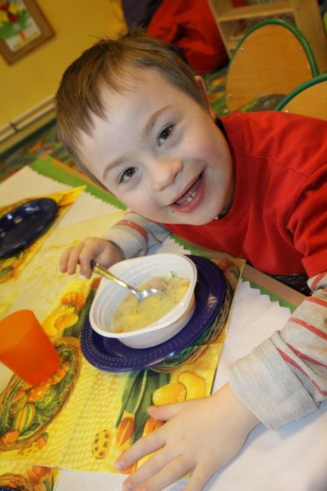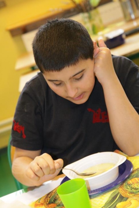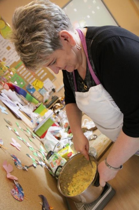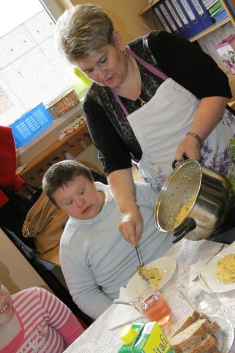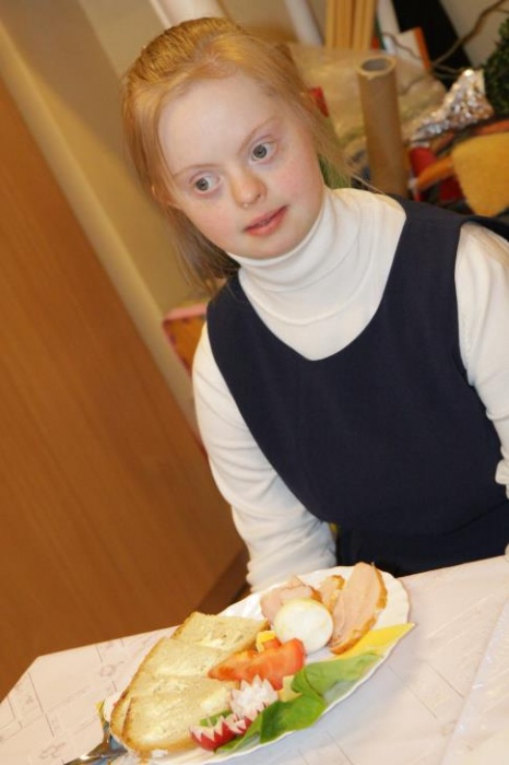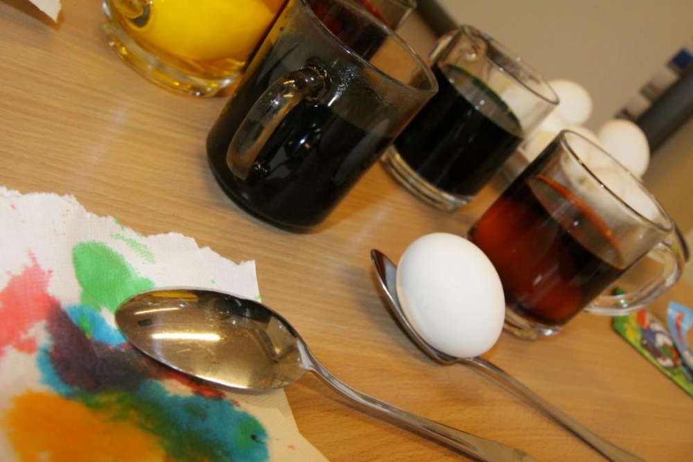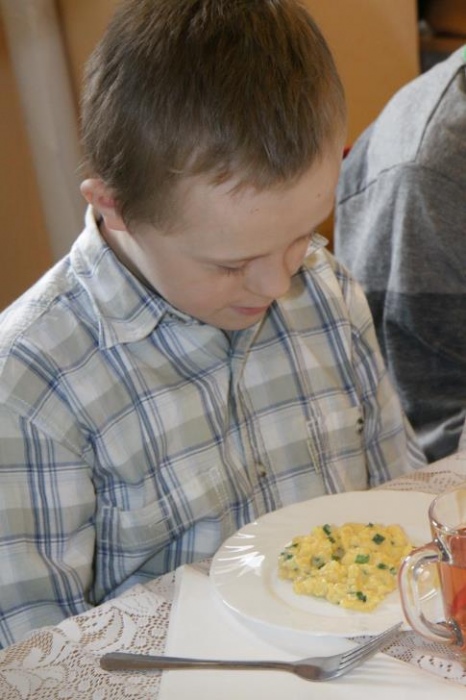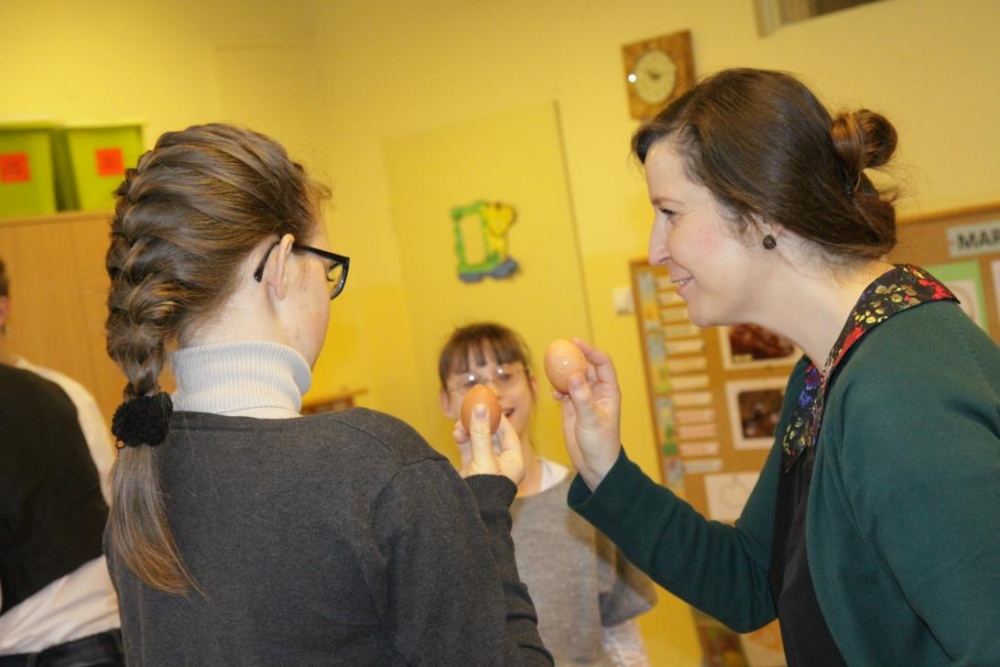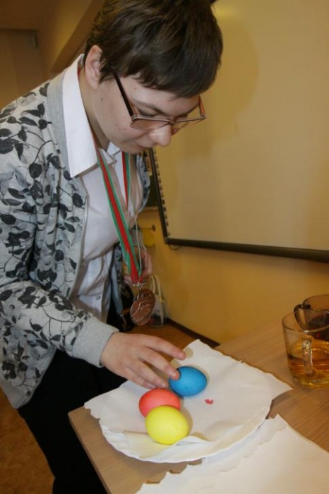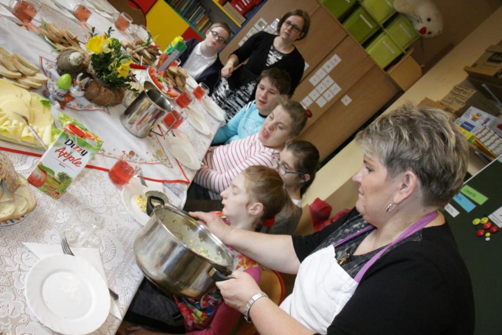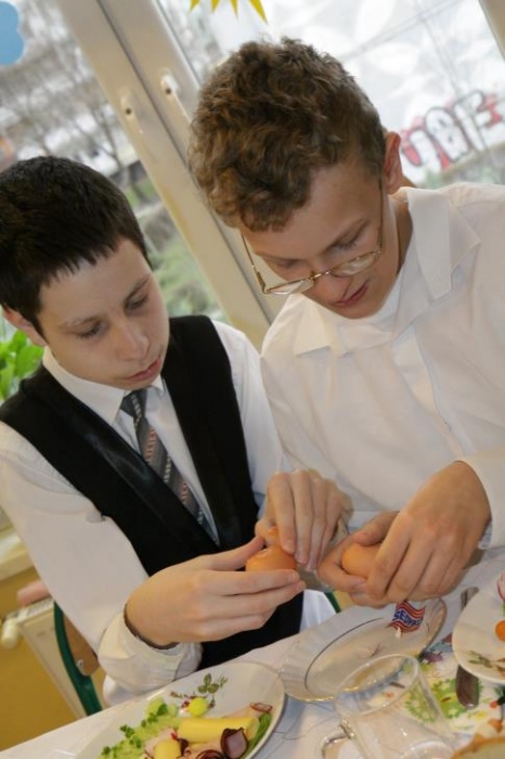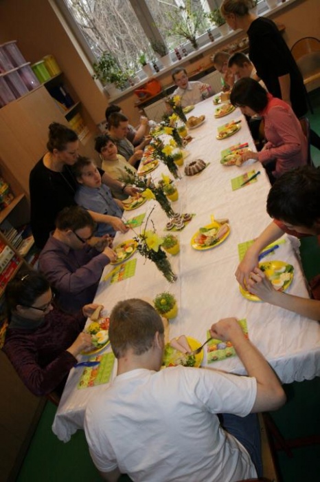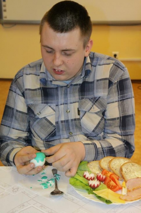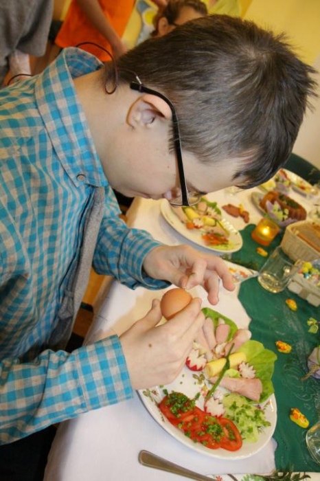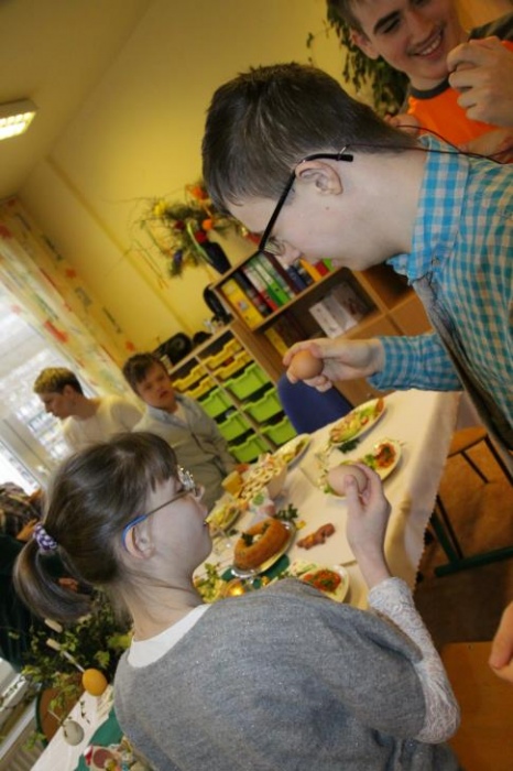 Potem był czas na świąteczne życzenia, które w jednej z klas połączono z tradycyjnym "stukaniem się jajkami". Uczniowie mieli okazję potrenować niezwykle trudną sztukę obierania jajek, a klasy III SP miały możliwość obserwować, jak powstaje przepyszna jajecznica. Potem wszyscy przystąpili do spożycia smakowitych i niezwykle kolorowych, różnorakich potraw. Były wędliny, jajka pod różną postacią, wielkanocne baby, baranki , zajęce, no i żurek.