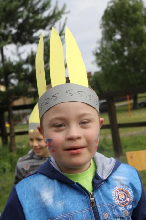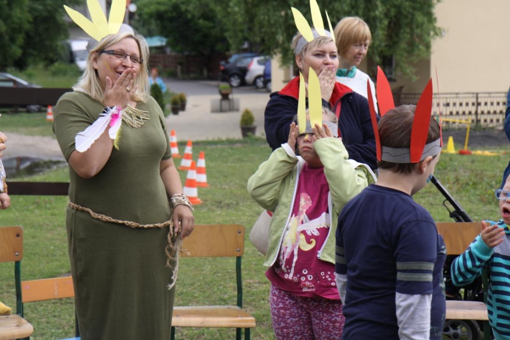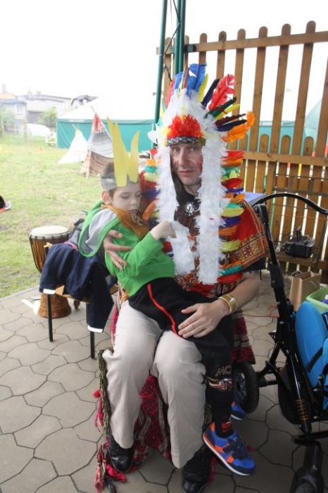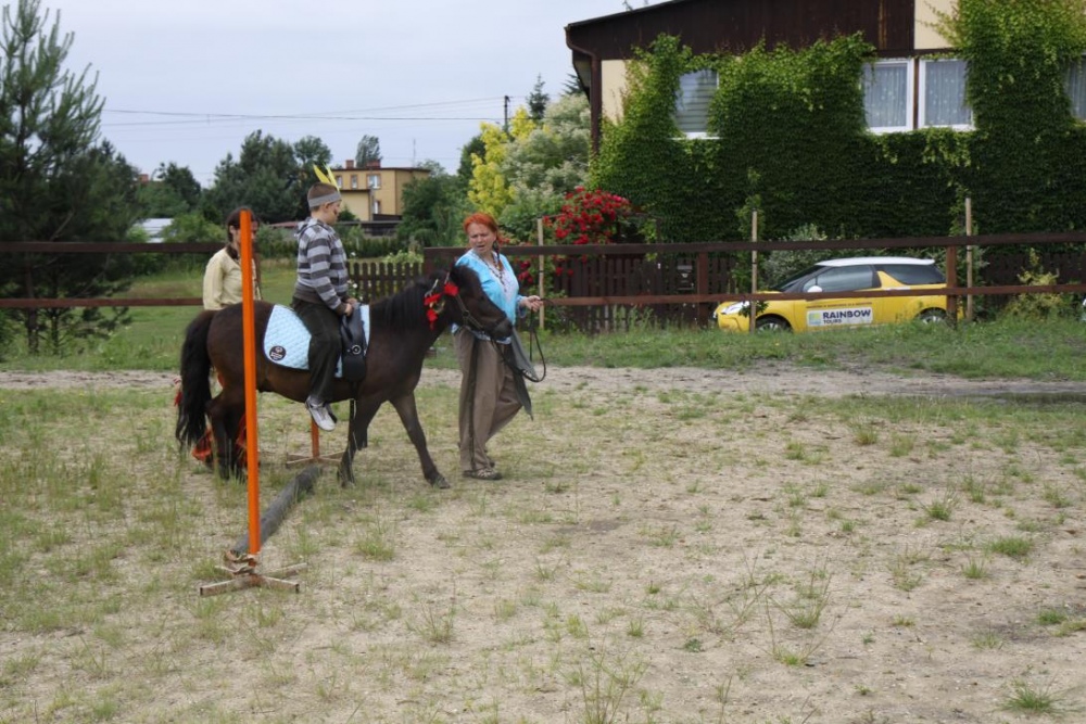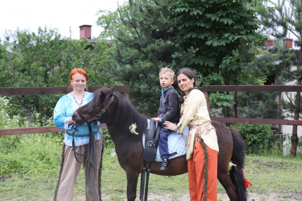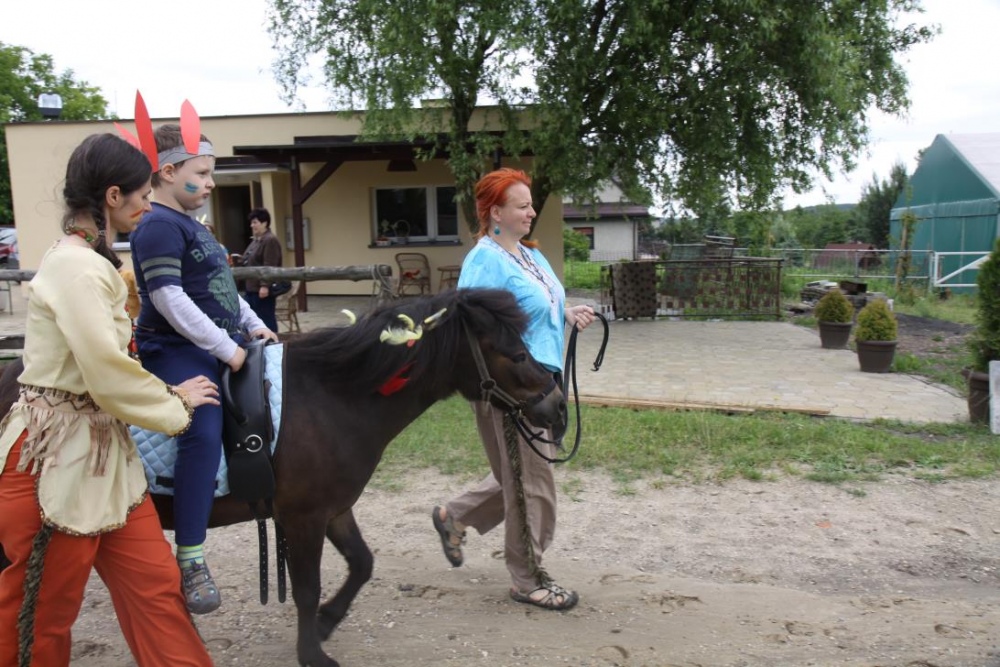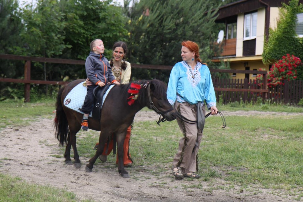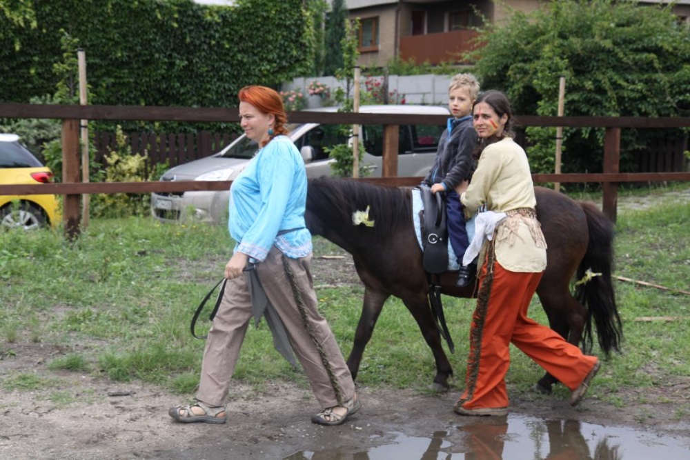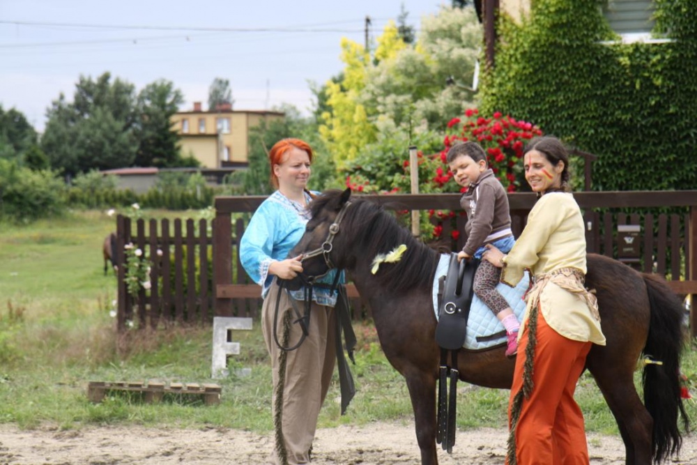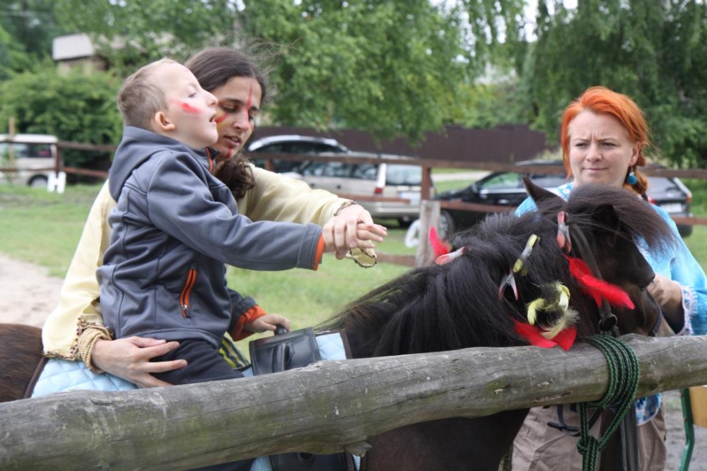 Przybyłych powitała Szara Sowa - szamanka plemienia, wyznaczona przez wodza do sprawdzenia indiańskich umiejętności naszych kandydatów. Było poszukiewnie piór, ozdabianie pióropuszy, malowanie twarzy. Nie obeszło się bez indiańkich okrzyków, pląsów, śpiewu i gry na instrumentach. Wszystkiemu bacznie przyglądał sięprzybyły na impezę Wódz Indiański. Dwa rywalizujące plemiona: Zółtych oraz Czerwonych Piór stoczyły nawet bitwę, po której mali indianie, z pomocą baniek mydlanych trenowali, "palenie fajki pokoju". Na zakończenie indiańskich zadań była oczywiście jazda na koniu, którą cały rok uczestnicy zajęć hipoterapii trenowali. Kilkoro uczniów musiało również sprostać niełatwemu zadaniu - przygotowaniu konika Kajtka do jazdy. Wszytkie dzieci rewelacyjnie poradziły sobie z tymi najtrudniejszymi próbami.