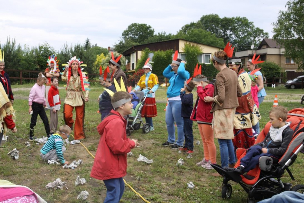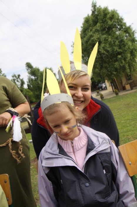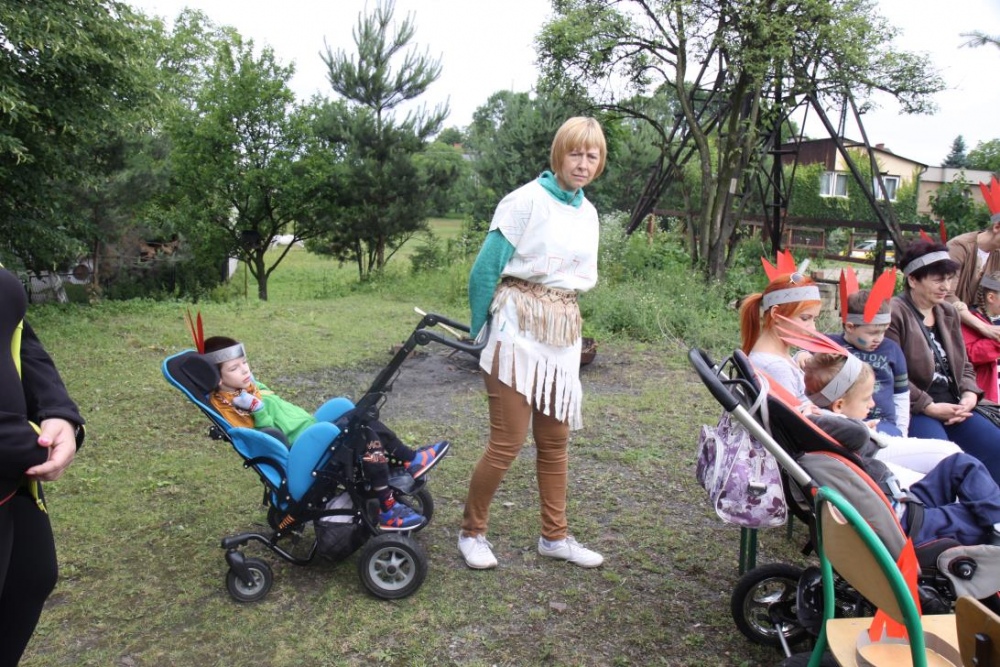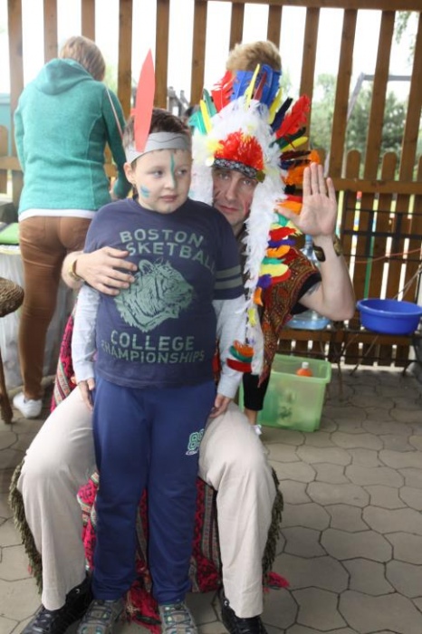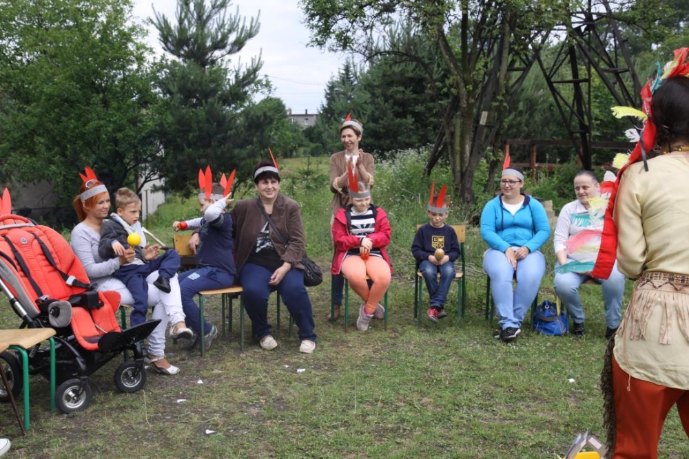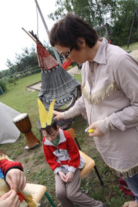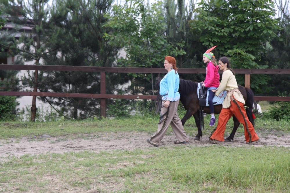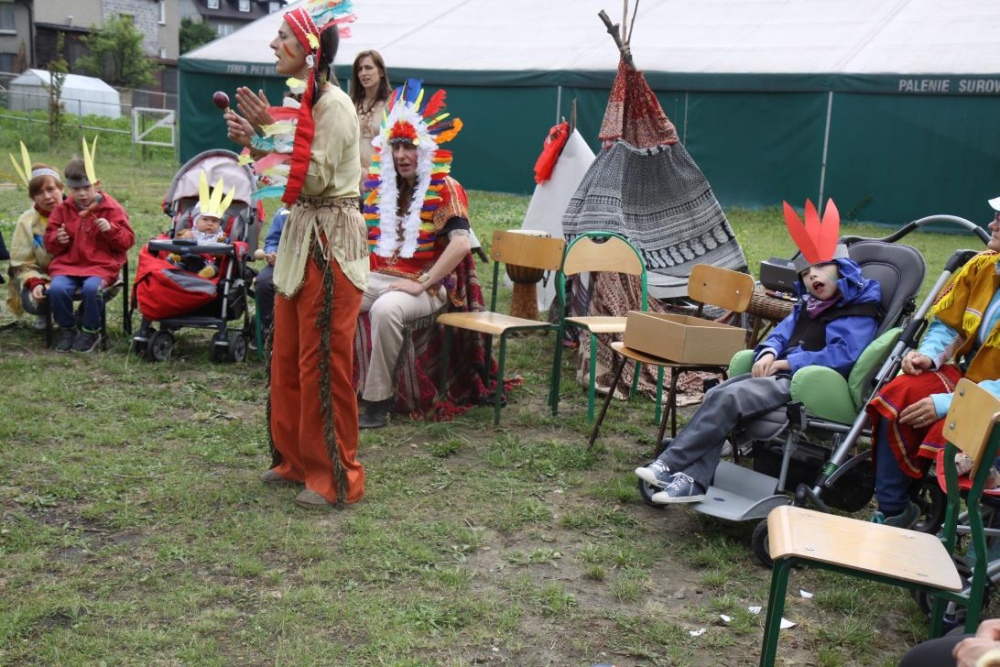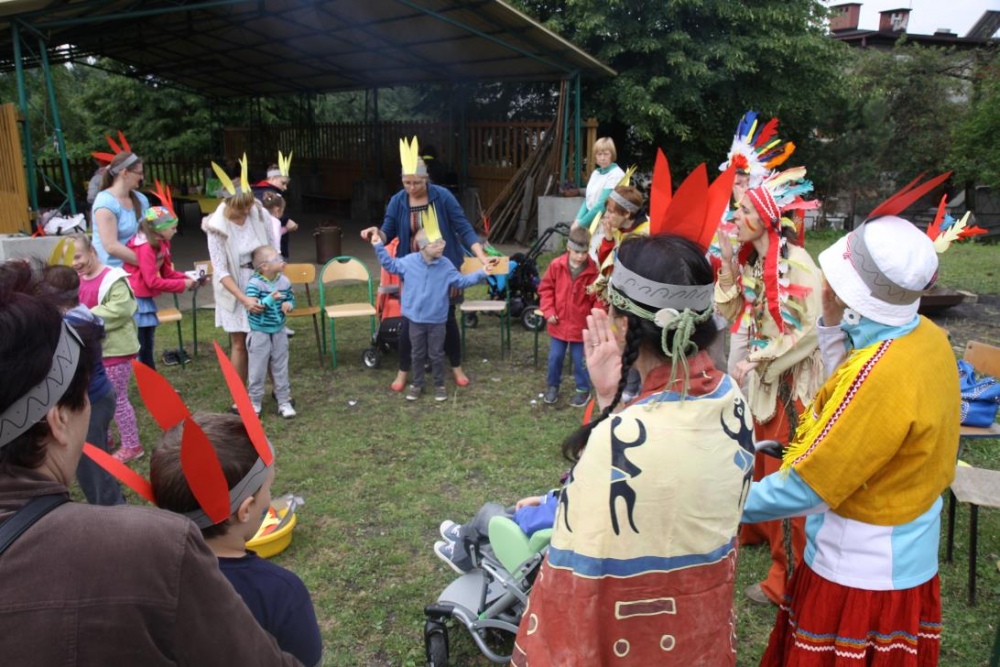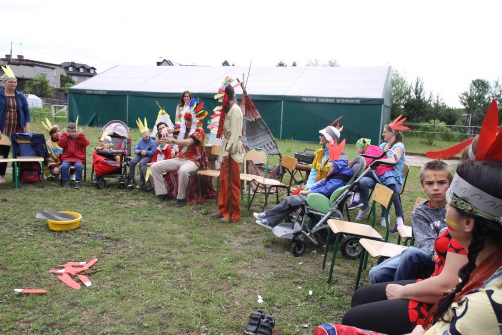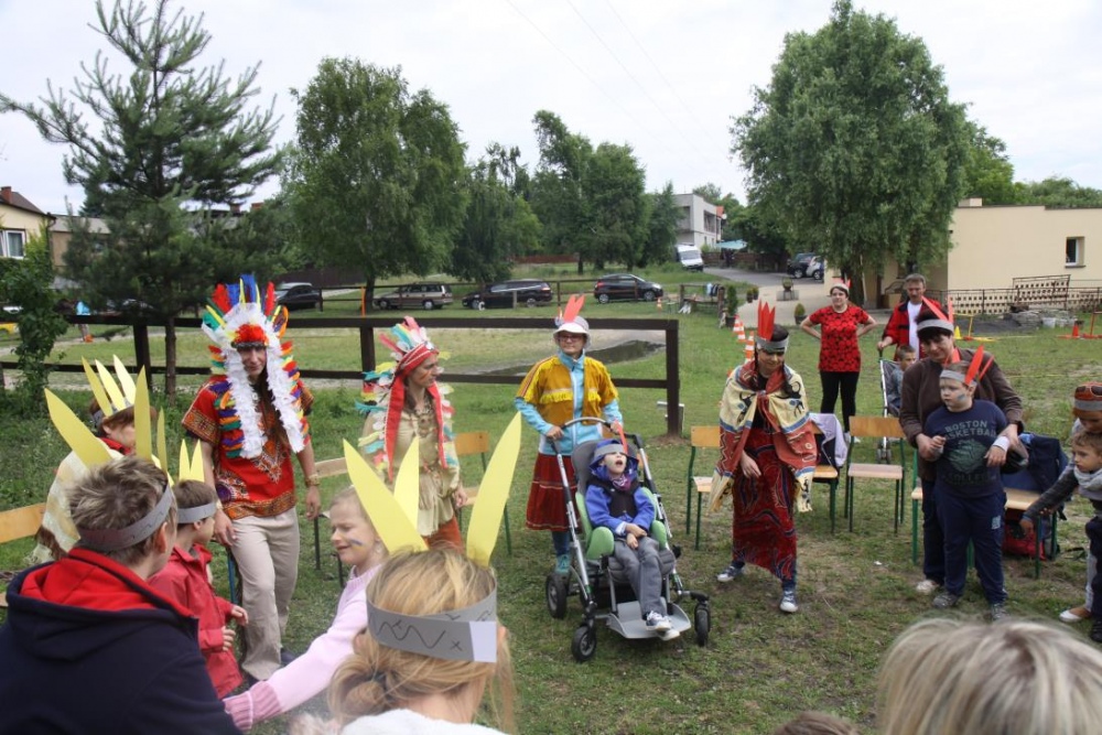 Przybyłych powitała Szara Sowa - szamanka plemienia, wyznaczona przez wodza do sprawdzenia indiańskich umiejętności naszych kandydatów. Było poszukiewnie piór, ozdabianie pióropuszy, malowanie twarzy. Nie obeszło się bez indiańkich okrzyków, pląsów, śpiewu i gry na instrumentach. Wszystkiemu bacznie przyglądał sięprzybyły na impezę Wódz Indiański. Dwa rywalizujące plemiona: Zółtych oraz Czerwonych Piór stoczyły nawet bitwę, po której mali indianie, z pomocą baniek mydlanych trenowali, "palenie fajki pokoju". Na zakończenie indiańskich zadań była oczywiście jazda na koniu, którą cały rok uczestnicy zajęć hipoterapii trenowali. Kilkoro uczniów musiało również sprostać niełatwemu zadaniu - przygotowaniu konika Kajtka do jazdy. Wszytkie dzieci rewelacyjnie poradziły sobie z tymi najtrudniejszymi próbami.