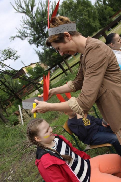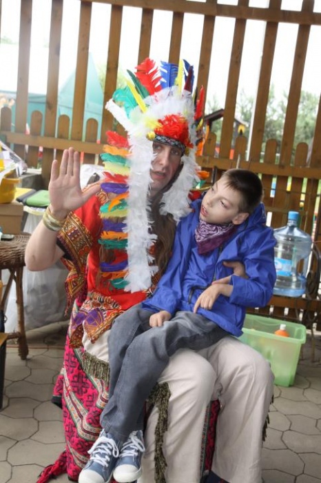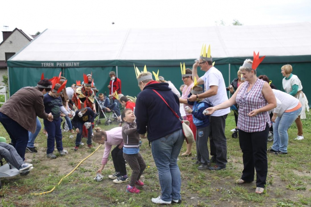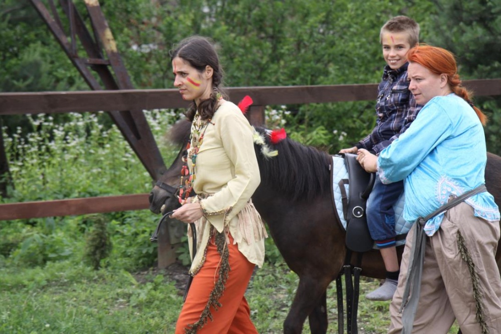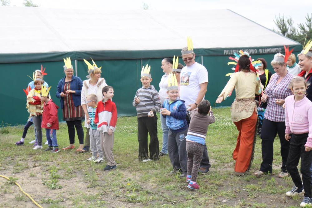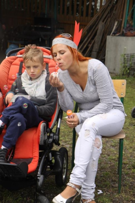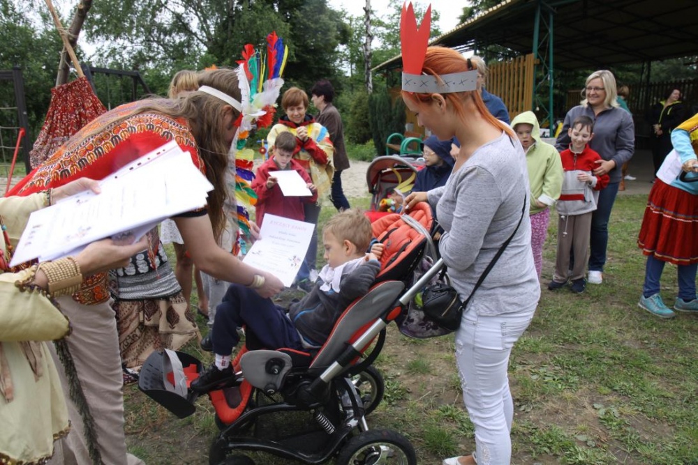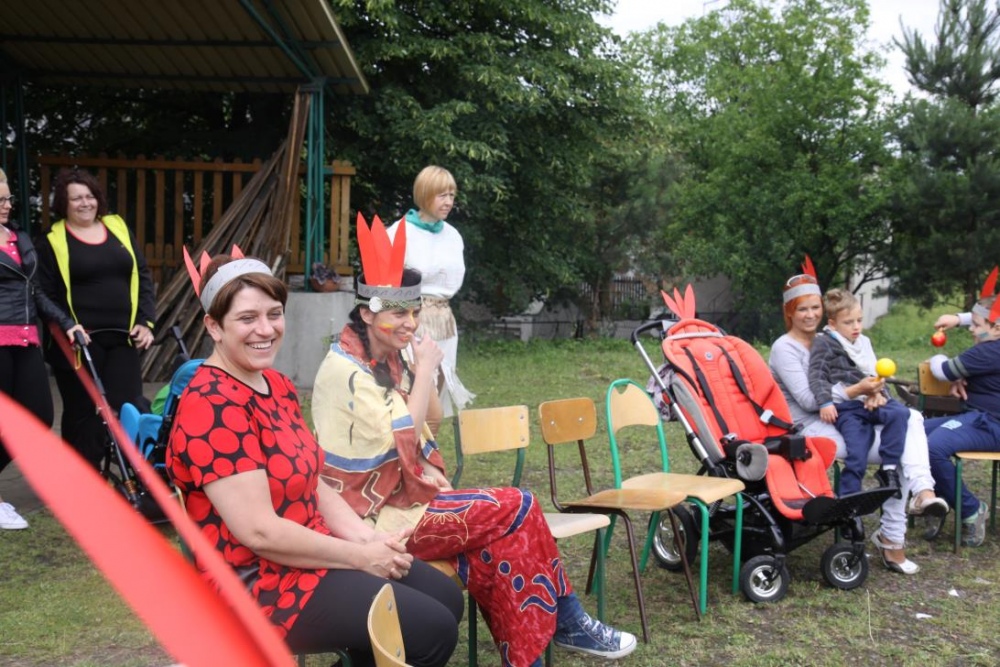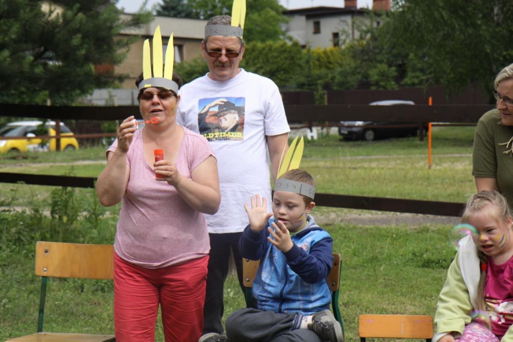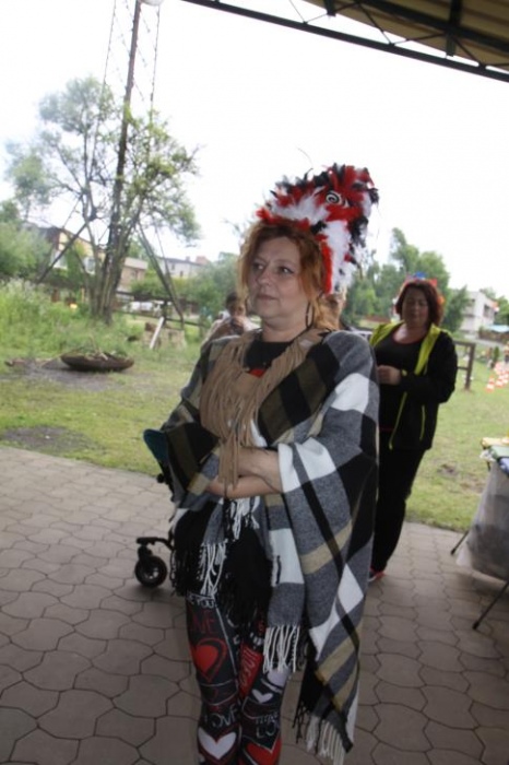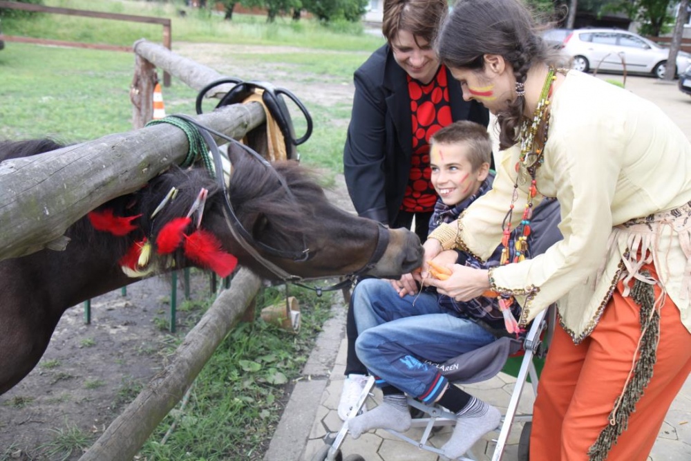 Przybyłych powitała Szara Sowa - szamanka plemienia, wyznaczona przez wodza do sprawdzenia indiańskich umiejętności naszych kandydatów. Było poszukiewnie piór, ozdabianie pióropuszy, malowanie twarzy. Nie obeszło się bez indiańkich okrzyków, pląsów, śpiewu i gry na instrumentach. Wszystkiemu bacznie przyglądał sięprzybyły na impezę Wódz Indiański. Dwa rywalizujące plemiona: Zółtych oraz Czerwonych Piór stoczyły nawet bitwę, po której mali indianie, z pomocą baniek mydlanych trenowali, "palenie fajki pokoju". Na zakończenie indiańskich zadań była oczywiście jazda na koniu, którą cały rok uczestnicy zajęć hipoterapii trenowali. Kilkoro uczniów musiało również sprostać niełatwemu zadaniu - przygotowaniu konika Kajtka do jazdy. Wszytkie dzieci rewelacyjnie poradziły sobie z tymi najtrudniejszymi próbami.