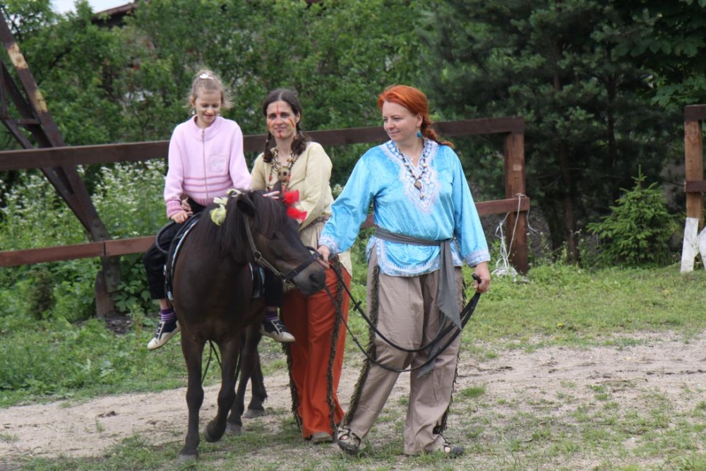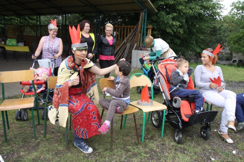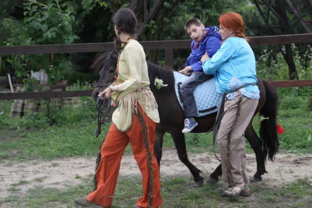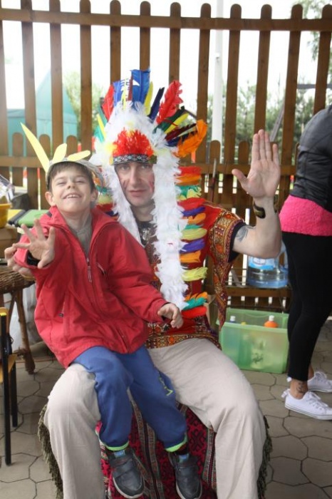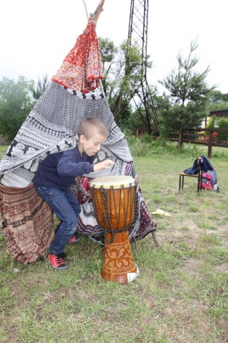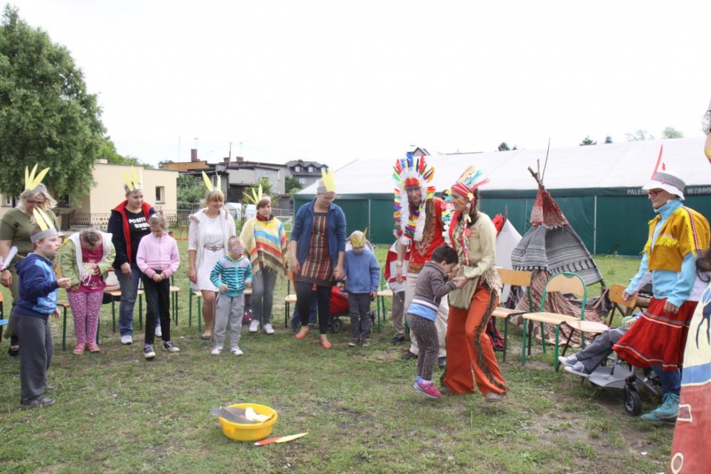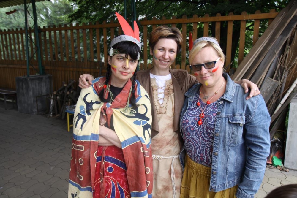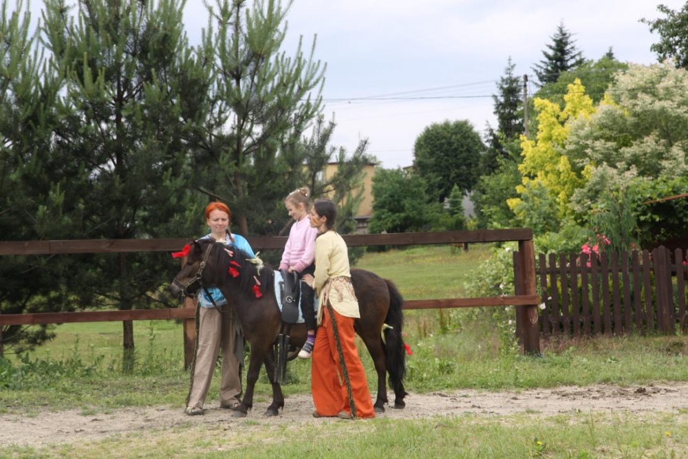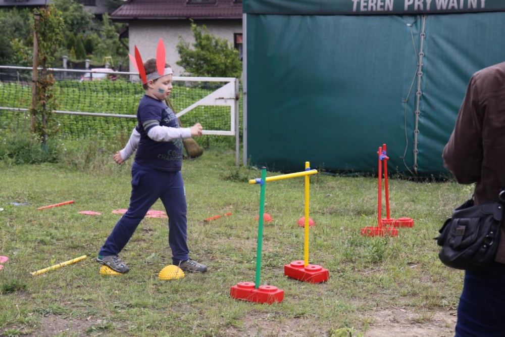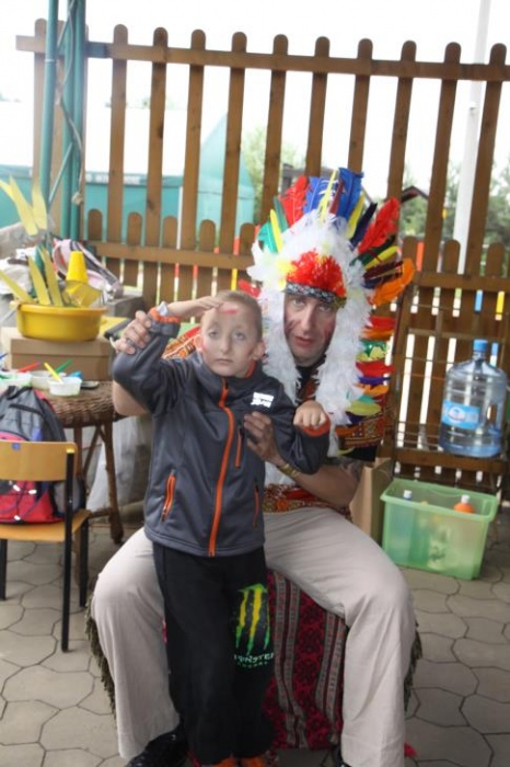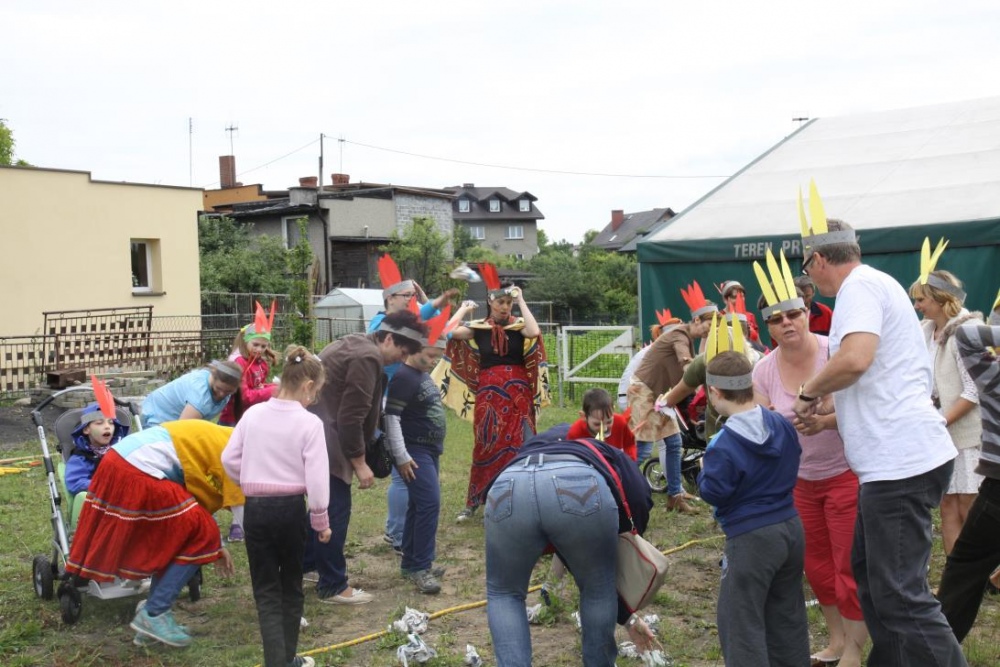 Przybyłych powitała Szara Sowa - szamanka plemienia, wyznaczona przez wodza do sprawdzenia indiańskich umiejętności naszych kandydatów. Było poszukiewnie piór, ozdabianie pióropuszy, malowanie twarzy. Nie obeszło się bez indiańkich okrzyków, pląsów, śpiewu i gry na instrumentach. Wszystkiemu bacznie przyglądał sięprzybyły na impezę Wódz Indiański. Dwa rywalizujące plemiona: Zółtych oraz Czerwonych Piór stoczyły nawet bitwę, po której mali indianie, z pomocą baniek mydlanych trenowali, "palenie fajki pokoju". Na zakończenie indiańskich zadań była oczywiście jazda na koniu, którą cały rok uczestnicy zajęć hipoterapii trenowali. Kilkoro uczniów musiało również sprostać niełatwemu zadaniu - przygotowaniu konika Kajtka do jazdy. Wszytkie dzieci rewelacyjnie poradziły sobie z tymi najtrudniejszymi próbami.