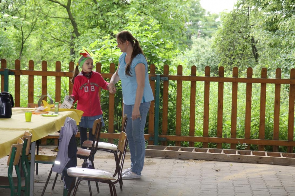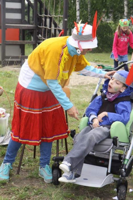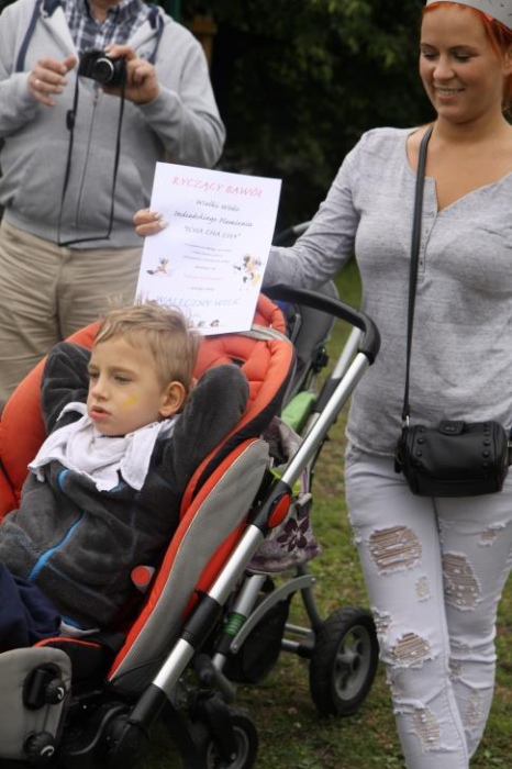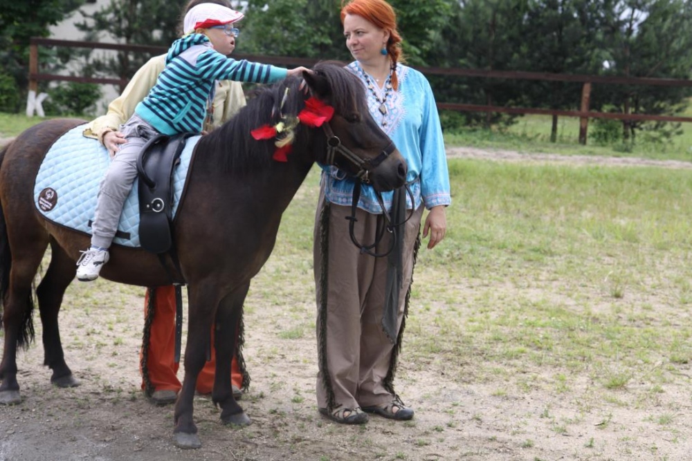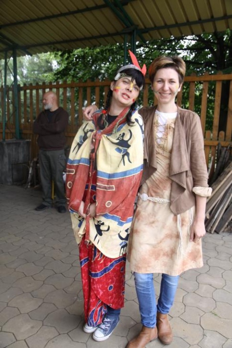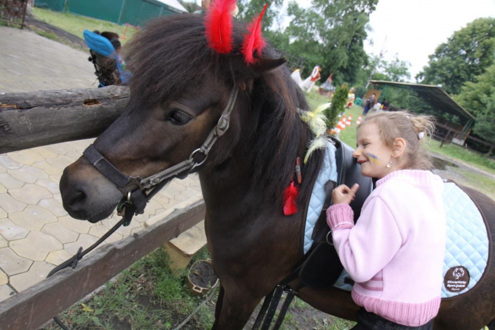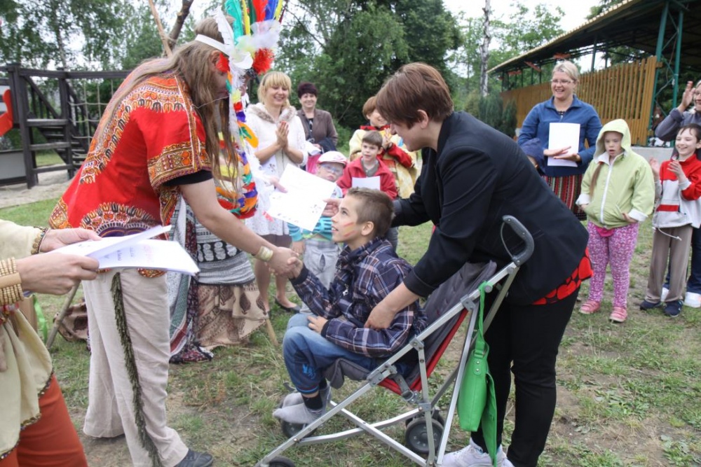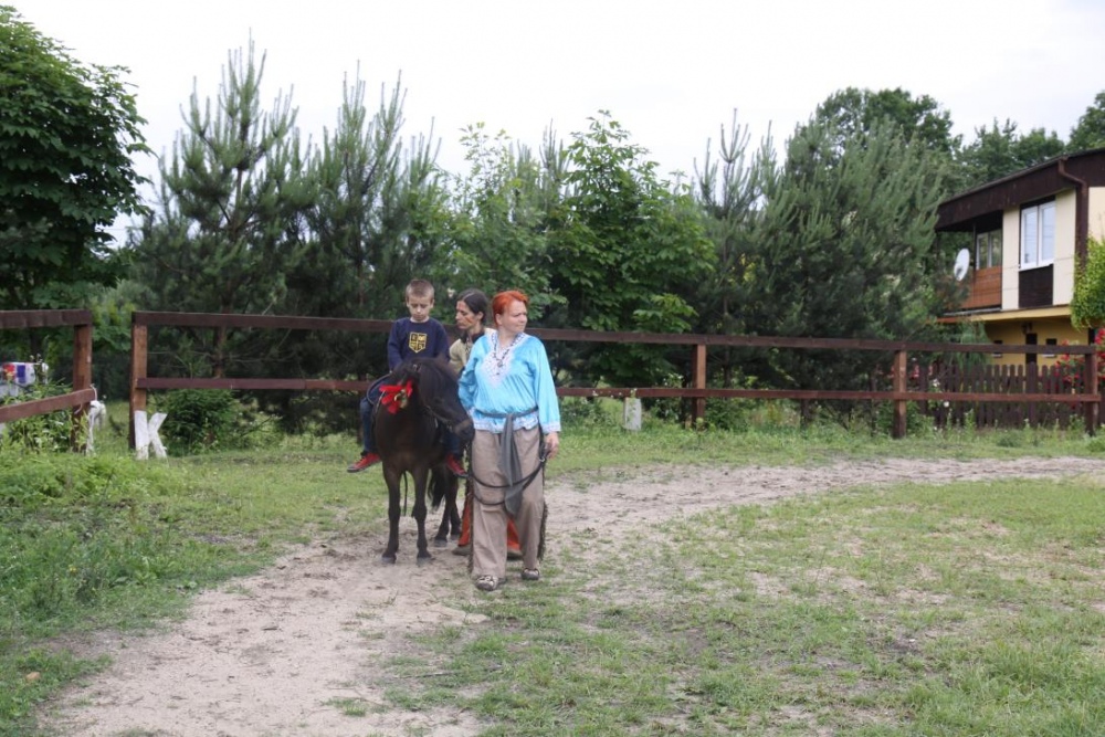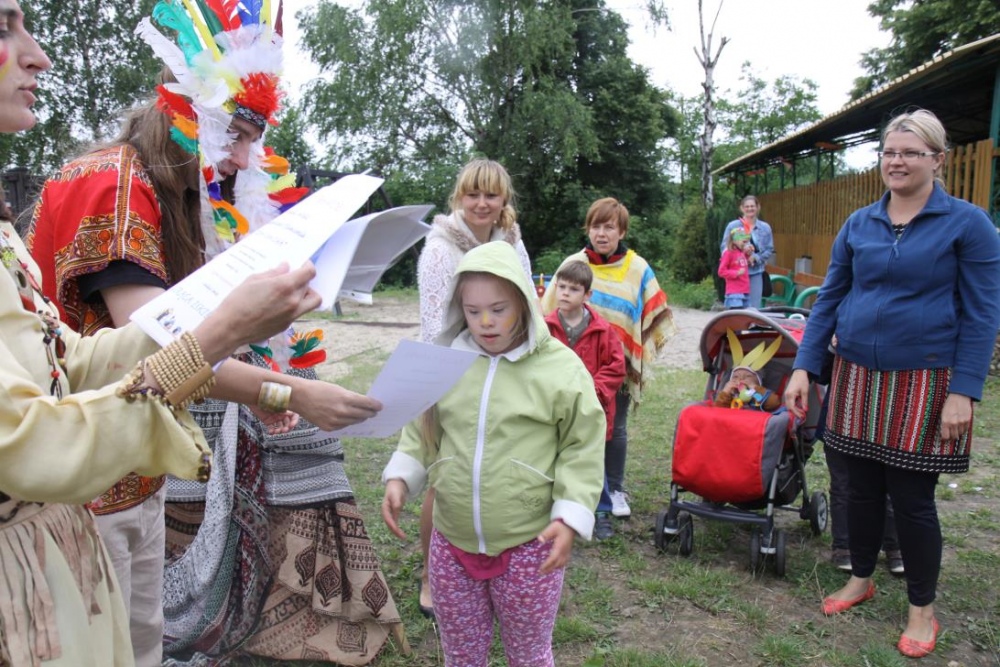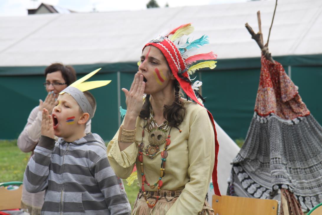 Przybyłych powitała Szara Sowa - szamanka plemienia, wyznaczona przez wodza do sprawdzenia indiańskich umiejętności naszych kandydatów. Było poszukiewnie piór, ozdabianie pióropuszy, malowanie twarzy. Nie obeszło się bez indiańkich okrzyków, pląsów, śpiewu i gry na instrumentach. Wszystkiemu bacznie przyglądał sięprzybyły na impezę Wódz Indiański. Dwa rywalizujące plemiona: Zółtych oraz Czerwonych Piór stoczyły nawet bitwę, po której mali indianie, z pomocą baniek mydlanych trenowali, "palenie fajki pokoju". Na zakończenie indiańskich zadań była oczywiście jazda na koniu, którą cały rok uczestnicy zajęć hipoterapii trenowali. Kilkoro uczniów musiało również sprostać niełatwemu zadaniu - przygotowaniu konika Kajtka do jazdy. Wszytkie dzieci rewelacyjnie poradziły sobie z tymi najtrudniejszymi próbami.