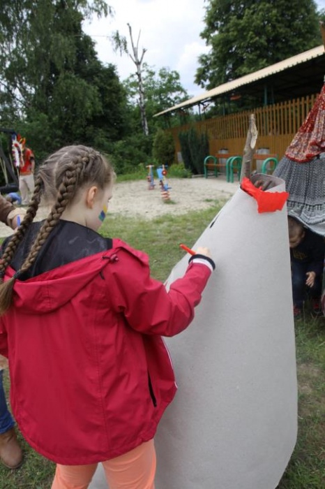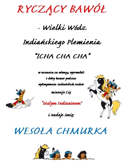 Podsumowaniem imprezy było mianowanie przez Indiańskiego Wodza wszystkich dzieci na: "Małych Indian" oraz nadanie im prawdziwych indiańskich imion:) Od tego momentu mamy: Wesołą Chmurkę, Pędzącą Strzałę, Rwącą Rzekę, Sokole Oko, Brykającego Żrebaka, Tańczącą Iskierkę i szereg inych Małych Indian:)