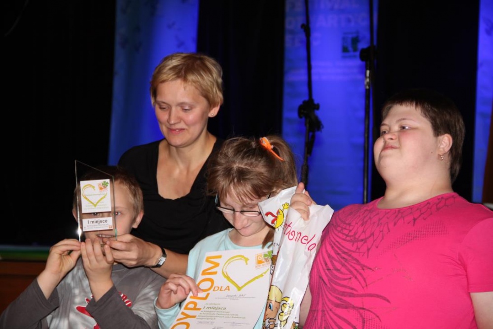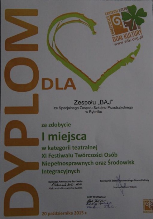 Dzień 20 października 2015 roku, był dla Zespołu BAJ świętem muzyki, tańca i teatru. W Starochorzowskim Domu Kultury w Chorzowie, odbył się Festiwal Otwartych Serc. Festiwal miał formę konkursu i promował twórczość artystyczną osób niepełnosprawnych, aby zapobiegać wykluczeniu społecznemu oraz upowszechniać terapię przez sztukę. Prezentacje uczestników oceniała Komisja Artystyczna, która wśród spektakli teatralnych najwyżej oceniła,,Przyjaciół z podwórka”, przyznając I MIEJSCE dla BAJ-u.