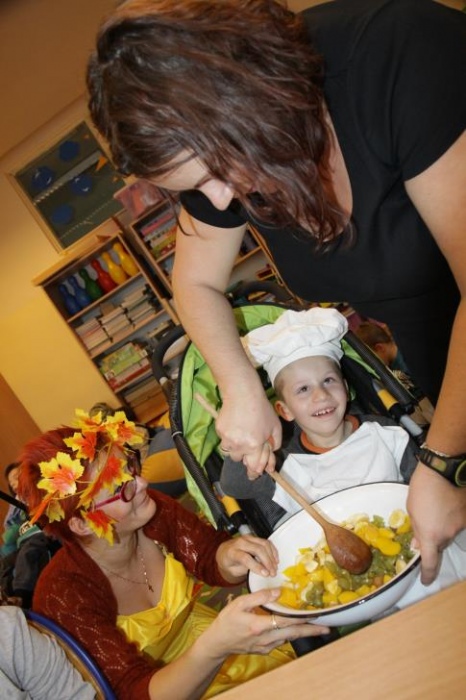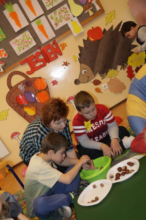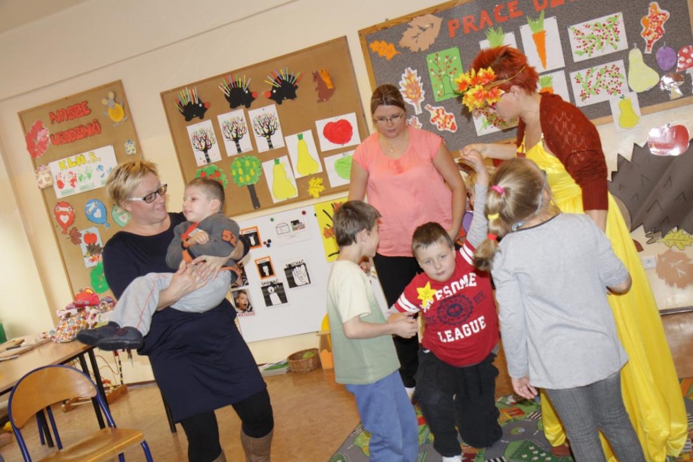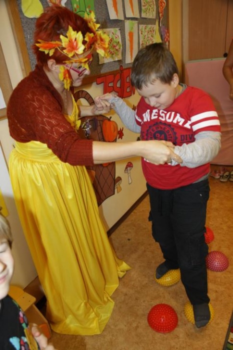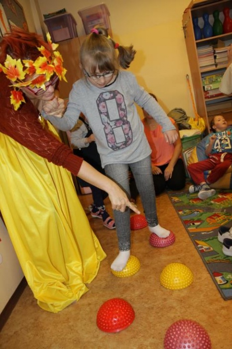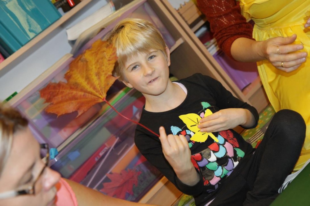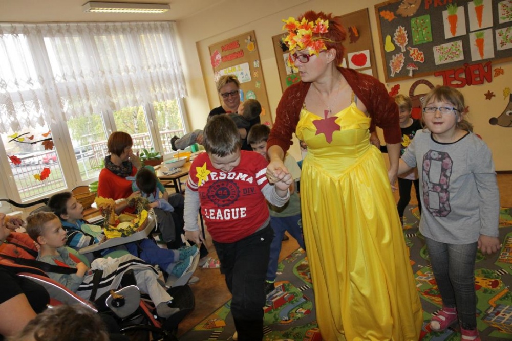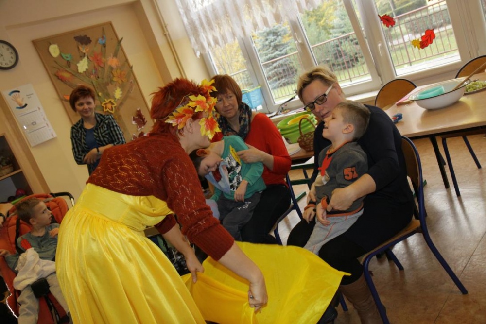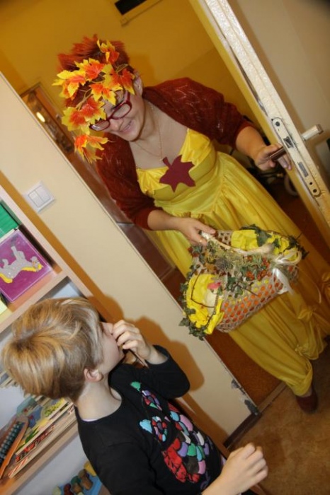 "Idzie jesień…”- śpiewem Przedszkolaki, pierwszoklasiści i drugoklasiści (kl. II bic) rozpoczęły konkurs z cyku "Cztery pory roku - JESIEŃ”. Dotknięcie różdżki i wspólnie wypowiedziane zaklęcie przemieniło wszystkie dzieci w kolorowe listki. Listki te wirowały, skakały, szumiały wraz z chustą Klanzy. Uczniowie mieli do wykonania również szereg zadań: układały liście według wielkości, segregowały i nazywały różne dary jesieni, pokonywały równoważnię "kłujące jeżyki". Ciekawa okazała się konkurencja ze „Zgaduj Zgadulą” z którą dzieci rozpoznawały dotykiem dłoni owoce. Jednak chyba najwięcej radości sprawiło dzieciom własnoręczne przygotowanie sałatki owocowej.