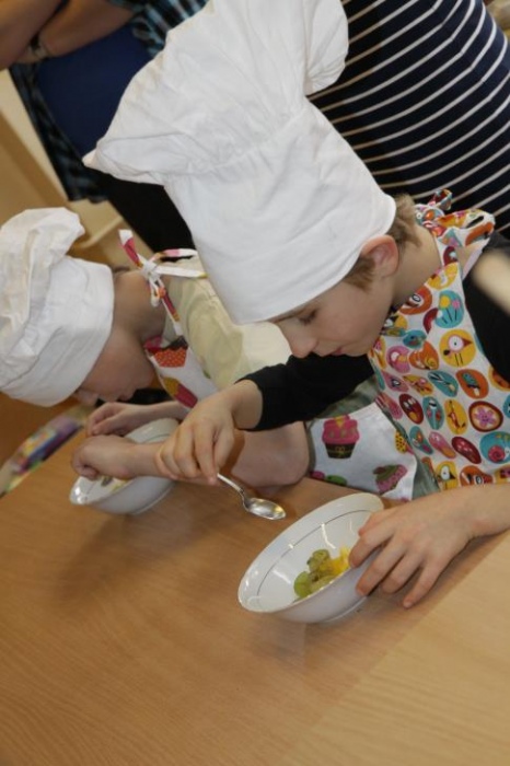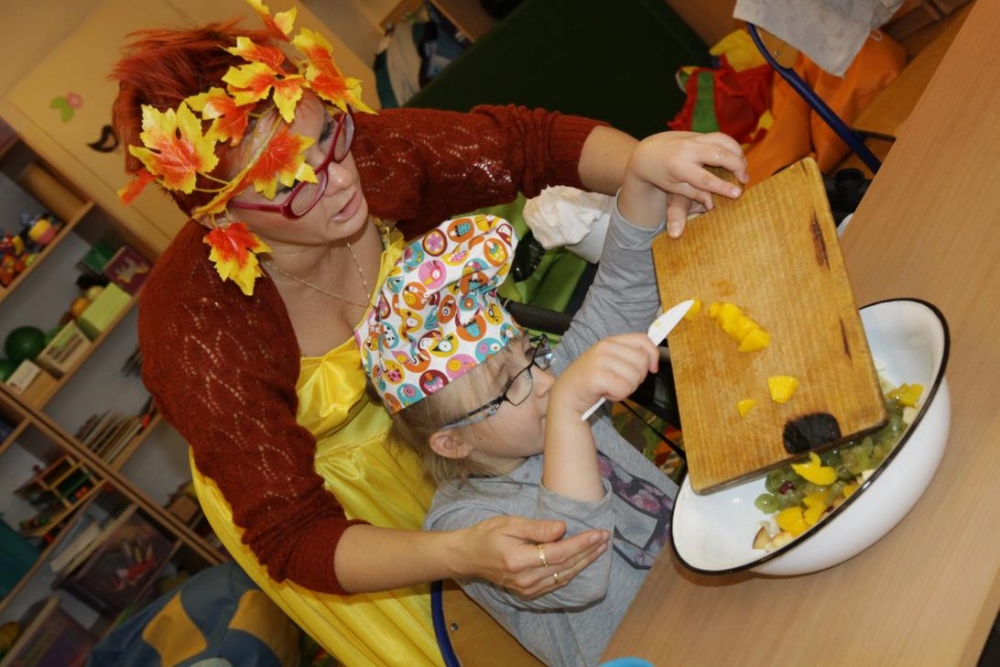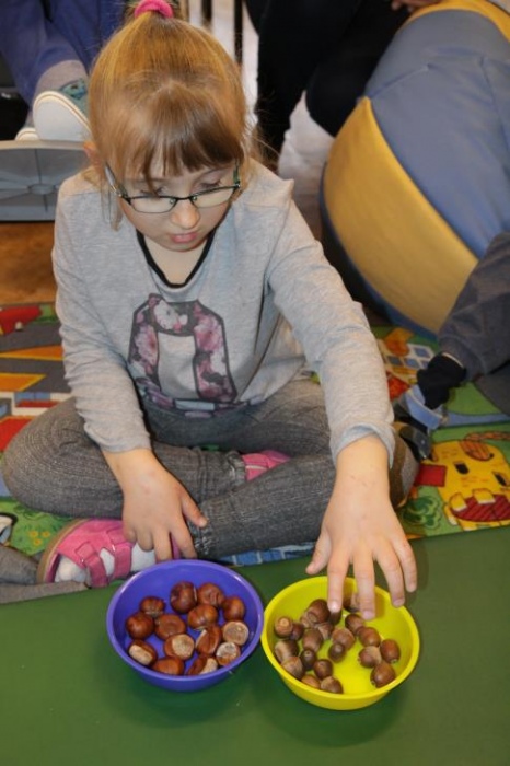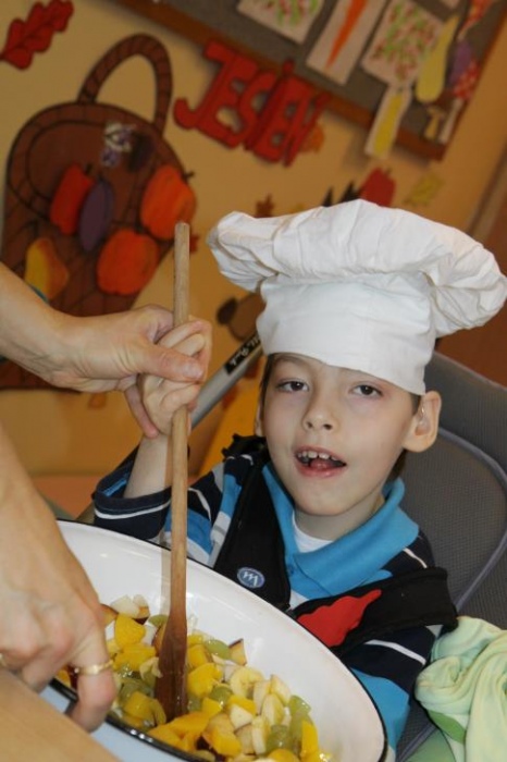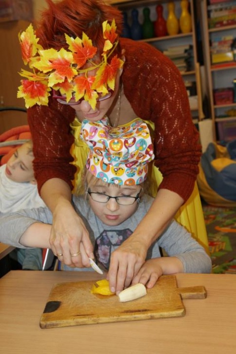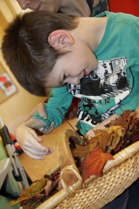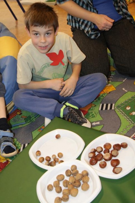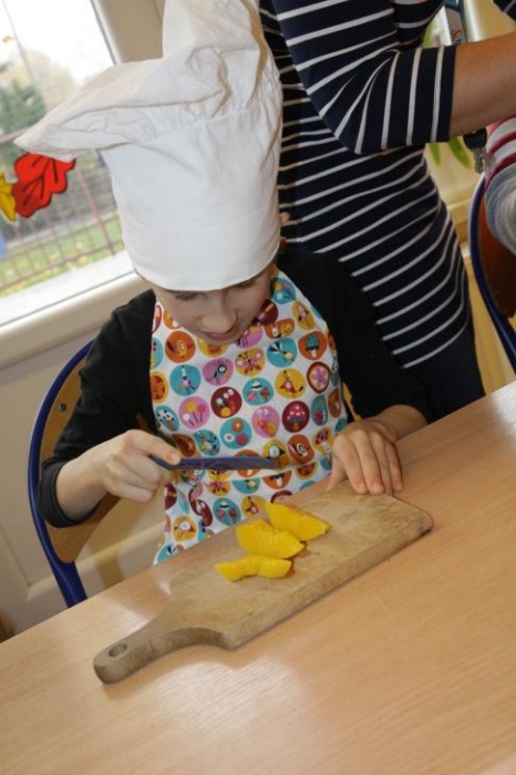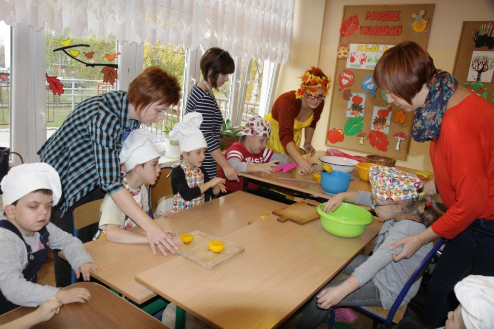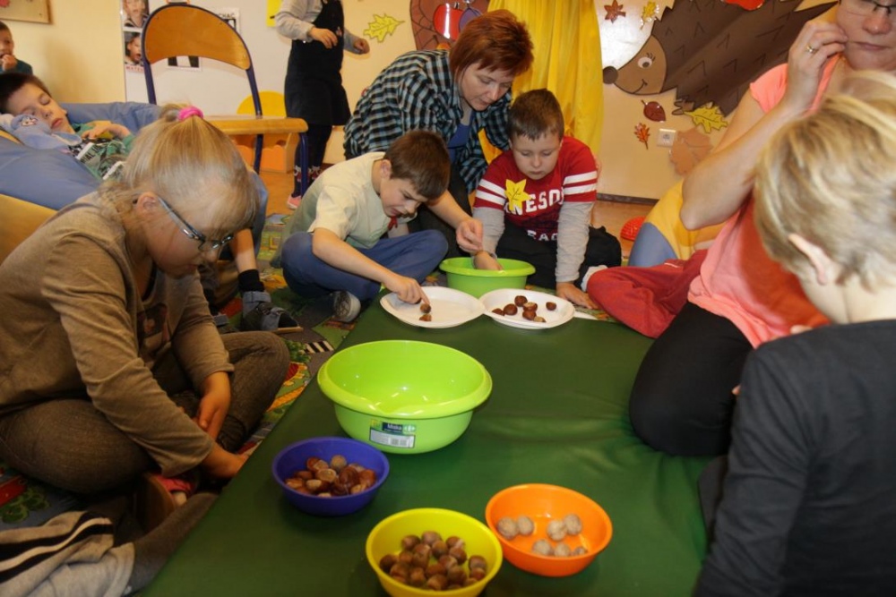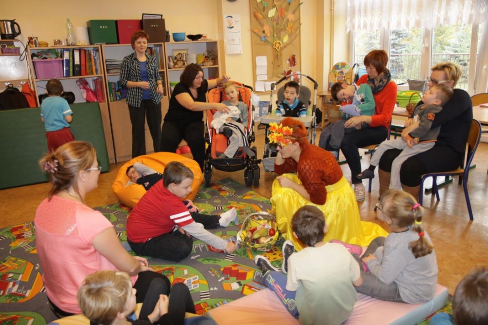 "Idzie jesień…”- śpiewem Przedszkolaki, pierwszoklasiści i drugoklasiści (kl. II bic) rozpoczęły konkurs z cyku "Cztery pory roku - JESIEŃ”. Dotknięcie różdżki i wspólnie wypowiedziane zaklęcie przemieniło wszystkie dzieci w kolorowe listki. Listki te wirowały, skakały, szumiały wraz z chustą Klanzy. Uczniowie mieli do wykonania również szereg zadań: układały liście według wielkości, segregowały i nazywały różne dary jesieni, pokonywały równoważnię "kłujące jeżyki". Ciekawa okazała się konkurencja ze „Zgaduj Zgadulą” z którą dzieci rozpoznawały dotykiem dłoni owoce. Jednak chyba najwięcej radości sprawiło dzieciom własnoręczne przygotowanie sałatki owocowej.
