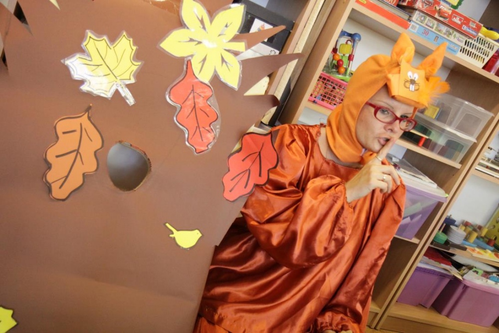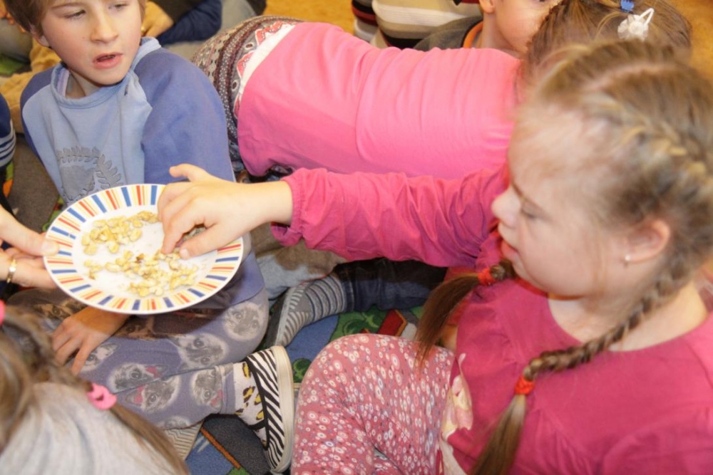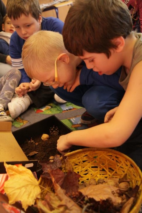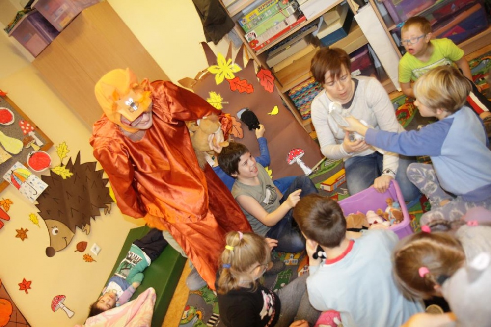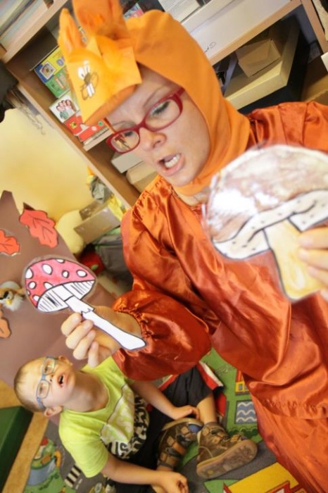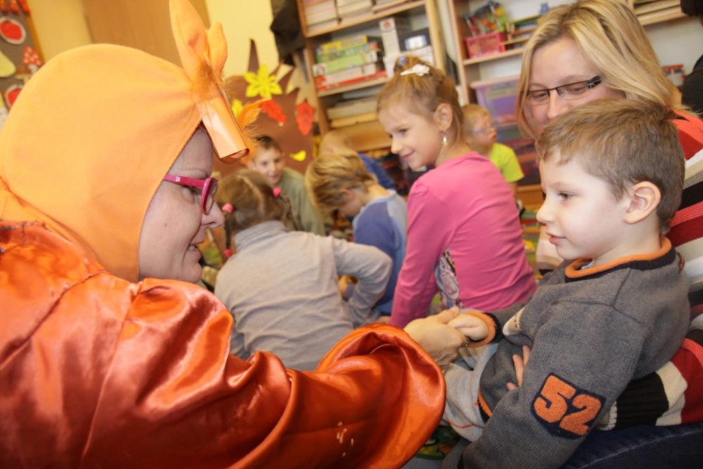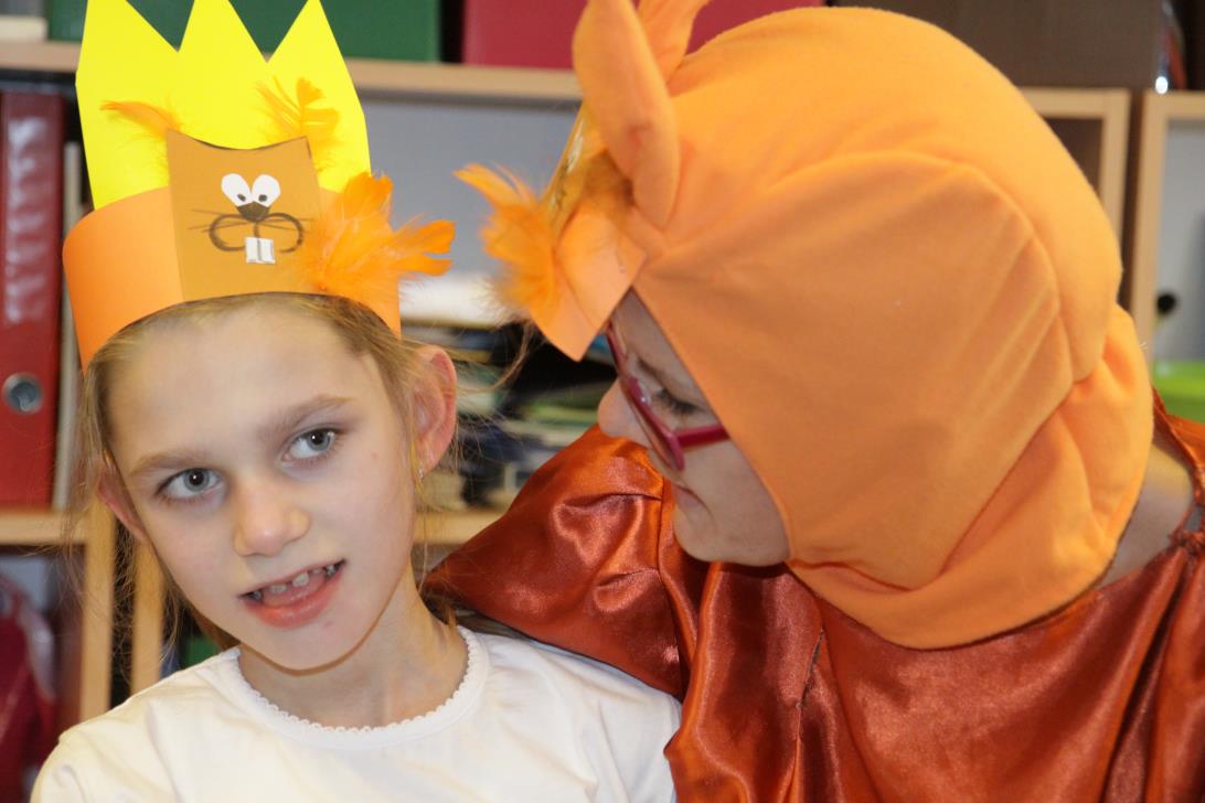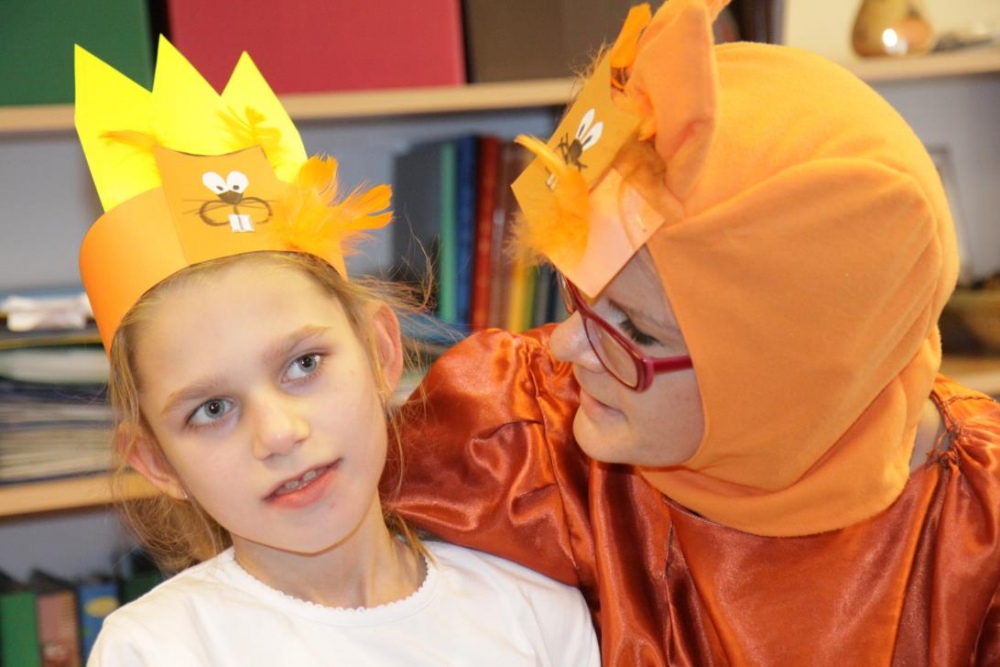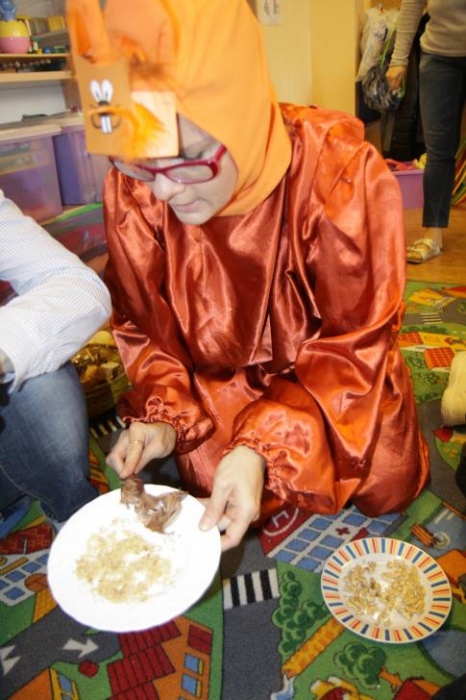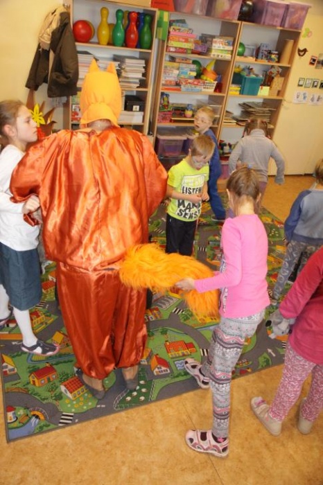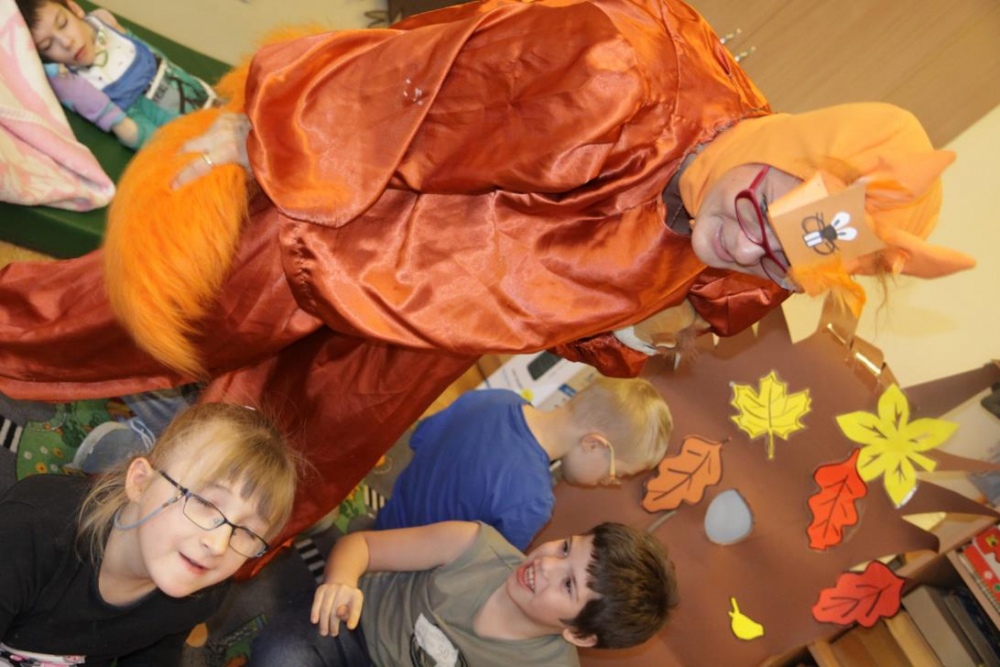 Przedszkolaki i uczniowie klas I i II w minioną środę pomagały robić zapasy wiewiórce Basi. Najpierw z zapartym tchem wysłuchały pouczającej bajki, a następnie wzięły się do pracy. Chętnie pomagały Basi w zakopywaniu zapasów w ziemi (orzechów, grzybów, żołędzi), utrwalając przy tym liczenie w zakresie 5. Był czas także na zabawę przy muzyce „Wiewióreczka mała...”. Jednak najwięcej radości sprawiła zabawa w tunelu - wielkiej dziupli, no i oczywiście poczęstunek, tym razem urodzinowowy, gdyż w tym dniu swoje 9 urodzinki obchodziła nasza koleżanka z kl. II b - Kinga.