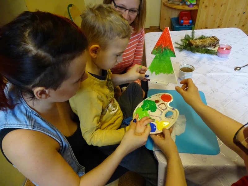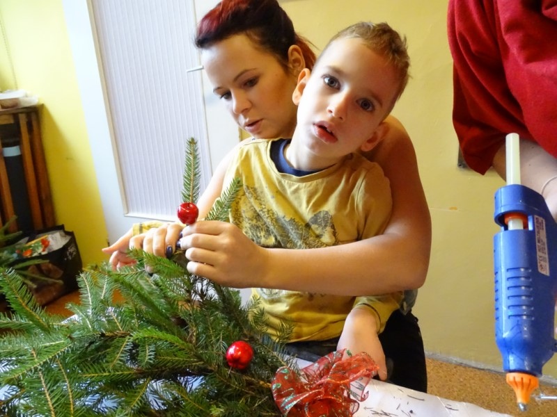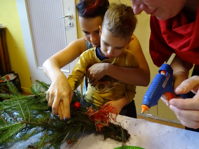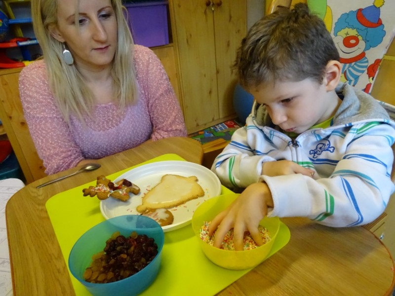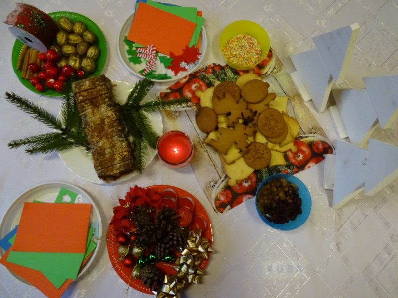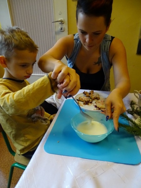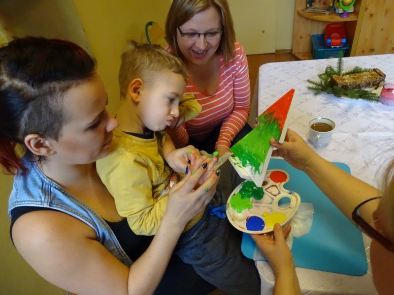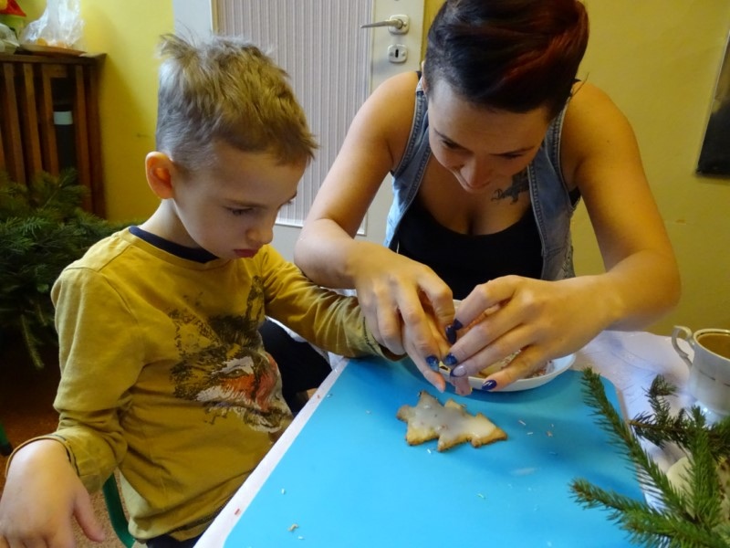10 grudnia odbyło się w grupie przedszkolnej świąteczne spotkanie rodziców połączone z miniwarsztatami, których celem było robienie świątecznych stroików, ozdabianie ciasteczek, choinek, wspólne wykonywanie kartek oraz integracja rodziców. Rodzice tworzyli razem z dziećmi stroiki z naturalnych gałązek choinkowych. Do ozdabiania pierniczków i kruchych ciasteczek wykorzystano własnoręcznie zrobiony lukier, rodzynki, żurawinę oraz kolorowe cukiernicze perełki. Dzieci z pomocą malowały uprzednio przygotowane drewniane choinki, które potem wzięły do domu. Przy stole dominował świąteczny nastrój wypełniony zapachem cynamonu, gozdzików, pomarańczy, ciasta piernikowego oraz świątecznymi melodiami.