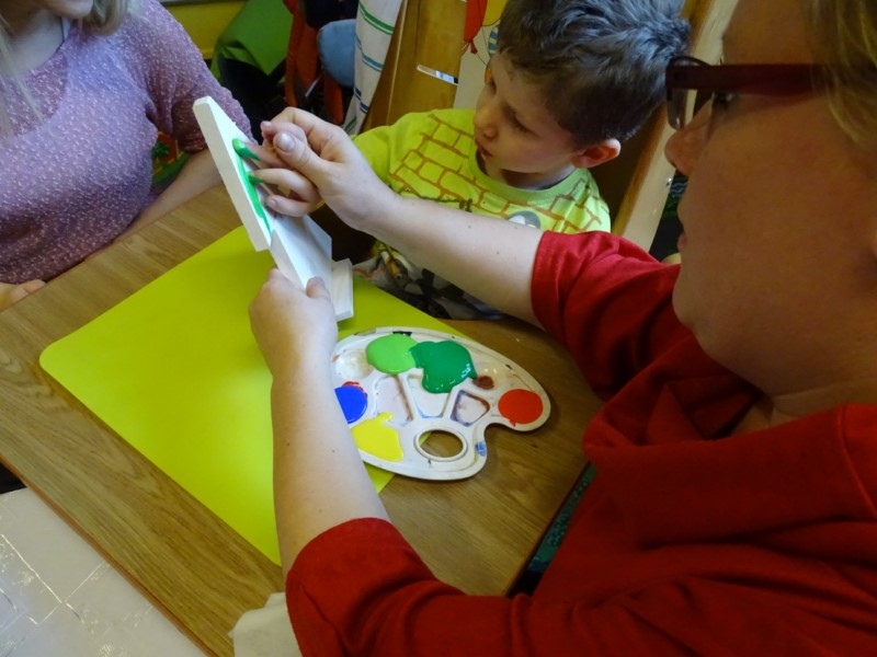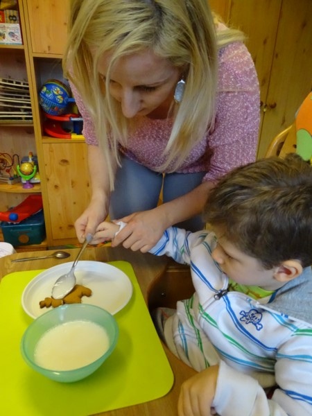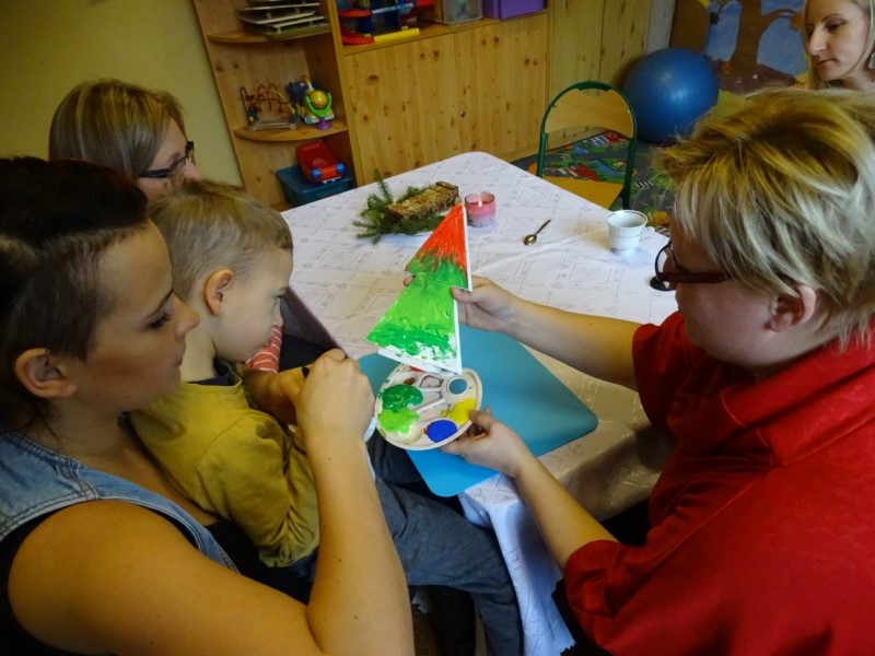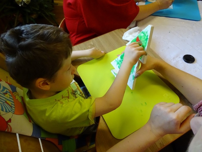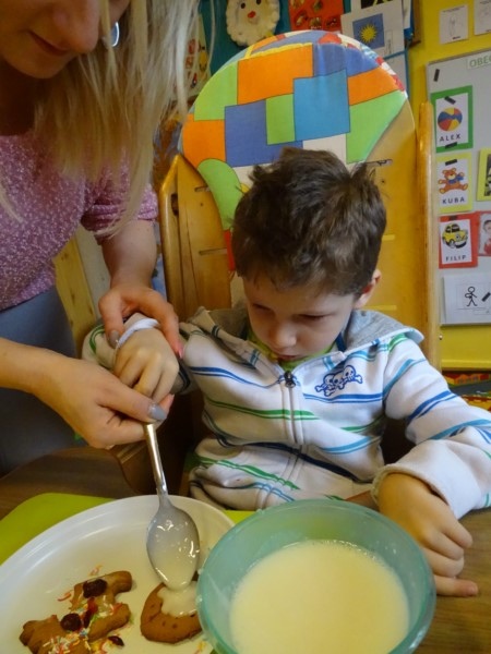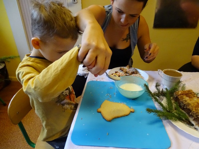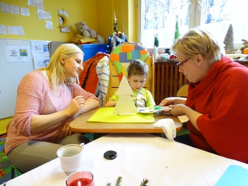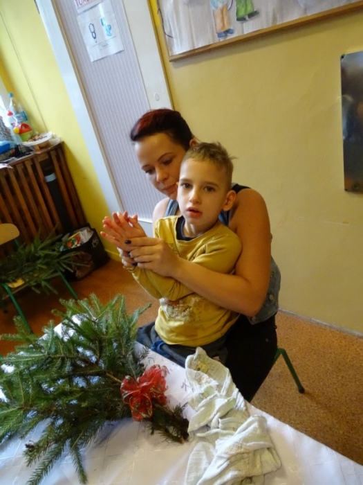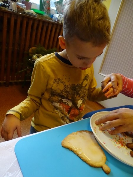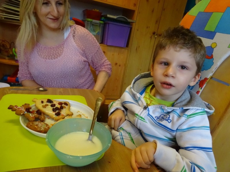 10 grudnia odbyło się w grupie przedszkolnej świąteczne spotkanie rodziców połączone z miniwarsztatami, których celem było robienie świątecznych stroików, ozdabianie ciasteczek, choinek, wspólne wykonywanie kartek oraz integracja rodziców. Rodzice tworzyli razem z dziećmi stroiki z naturalnych gałązek choinkowych. Do ozdabiania pierniczków i kruchych ciasteczek wykorzystano własnoręcznie zrobiony lukier, rodzynki, żurawinę oraz kolorowe cukiernicze perełki. Dzieci z pomocą malowały uprzednio przygotowane drewniane choinki, które potem wzięły do domu. Przy stole dominował świąteczny nastrój wypełniony zapachem cynamonu, gozdzików, pomarańczy, ciasta piernikowego oraz świątecznymi melodiami.