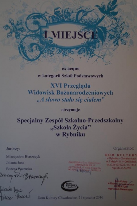 21 stycznia 2016 roku, na sali widowiskowej Domu Kultury w Rybniku - Chwałowicach, odbył się koncert laureatów. Przed ogłoszeniem wyników zostaliśmy wyróżnieni występem przed licznie zgromadzoną widownią.Jury w składzie - Mieczysław Błaszczyk, Jolanta Jona, Bożena Paczuska ocenili: dobór repertuaru, opracowanie dramaturgiczne, reżyserię, kulturę mowy, oprawę artystyczną czyli kostiumy i rekwizyty, oprawę muzyczną i ogólny wyraz artystyczny. Z wielką radością przyjęliśmy werdykt jury: