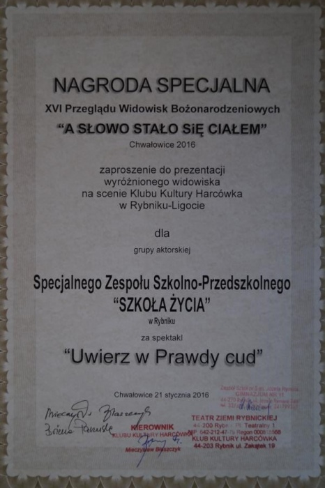 21 stycznia 2016 roku, na sali widowiskowej Domu Kultury w Rybniku - Chwałowicach, odbył się koncert laureatów.Przed ogłoszeniem wyników zostaliśmy wyróżnieni występem przed licznie zgromadzoną widownią.Jury w składzie - Mieczysław Błaszczyk, Jolanta Jona, Bożena Paczuska ocenili: dobór repertuaru, opracowanie dramaturgiczne, reżyserię, kulturę mowy, oprawę artystyczną czyli kostiumy i rekwizyty, oprawę muzyczną i ogólny wyraz artystyczny. Z wielką radością przyjęliśmy werdykt jury: