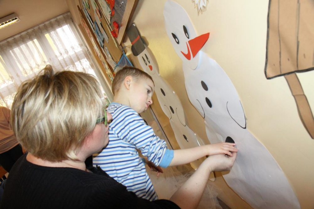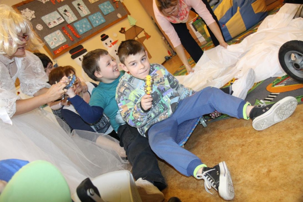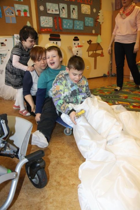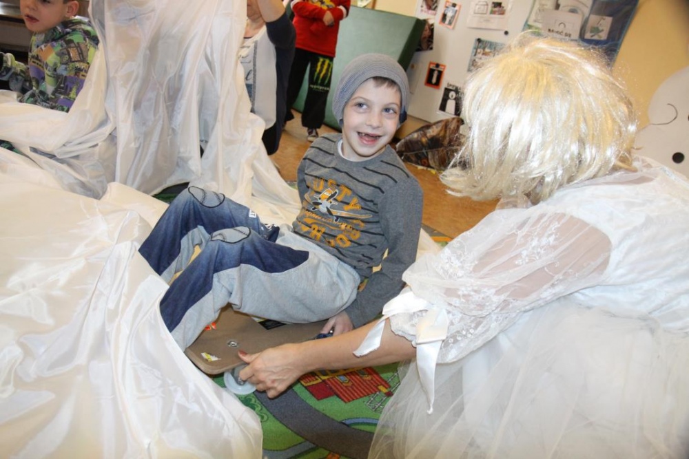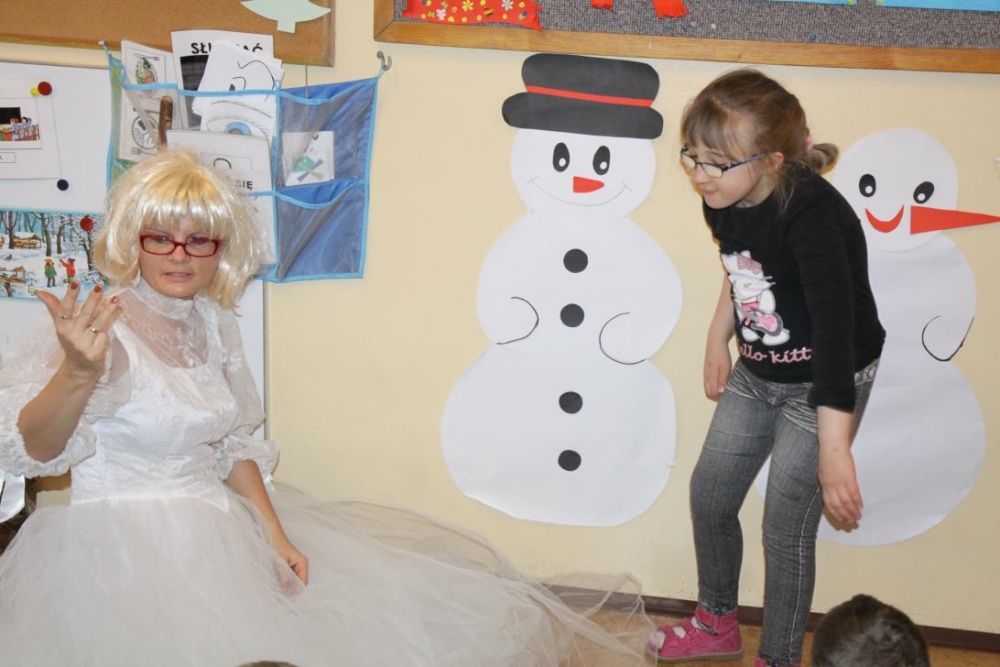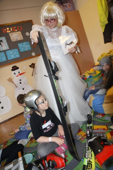 Tegoroczny ZIMOWY KONKURS edukacyjny dla najmłodszych poprowadziła Pani ZIMA we własnej osobie (w tej roli pani Ola). Zaproponowała dzieciom szereg zabaw i zadań związanych z zimową aurą i zimowymi aktywnościami. Doświadczanie dotyku zimnego lodu, zabawa białą chustą, jazda na deskorolkach terapeutycznych, "lepienie" papierowych śnieżek oraz bałwana sprawiły uczniom sporo frajdy, szczególnie w czasie, gdy prawdziwa zima skąpi nam "zimowych doświadczeń". Uczestnicy konkursu mieli również możliwość przymierzać kaski narciarskie oraz łyżwy. Pomiędzy konkurencjami odbył się "kulig" przy dźwiękach pioesnki i dzwoneczków.