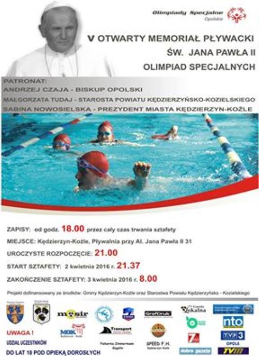 W rocznicę śmierci Papieża Polaka- dnia 2 kwietnia 2016r. na krytej pływalni w Kędzierzynie - Koźlu całonocnym pływaniem po raz kolejny uczczono pamięć naszego wielkiego rodaka. W tegorocznym całonocnym maratonie pływackim ku czci Ojcaa Świętego Jana Pława II wzięło udział ponad 300 osób. Wśród niezwykłych sędziów tego wydarzenia znalazł się prezez ZAKS-y Kędzierzyn Koźle Sebastian Świderski:)