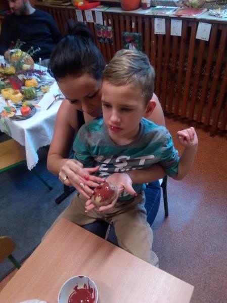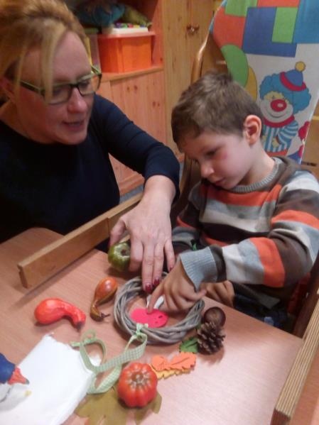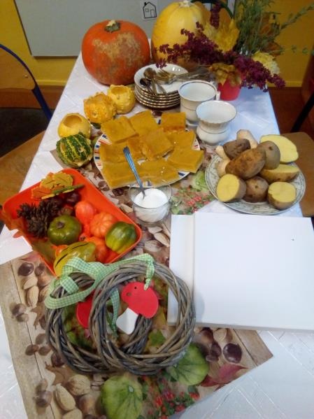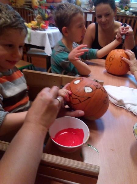 27 października odbyły się w grupie przedszkolnej zajęcia otwarte dla rodziców i koleżeństwa (obecnością swoją zaszczyciła nas pani Ola Kawczyńska), których celem było robienie jesiennych stroików na drzwi, dekoracji z mini dyni - lampionów, malowanie śmiesznych dyniek, własnoręcznie malowanych obrazów na „płótnie” oaz wykonanie grzybków z warzyw. Przy stole dominował radosny nastrój okraszony zapachem ciasta dyniowego, kawy z cynamonem i goździkami oraz unoszącą się w tle nieśmiało muzyką Vivaldiego „Cztery pory roku - jesień”.