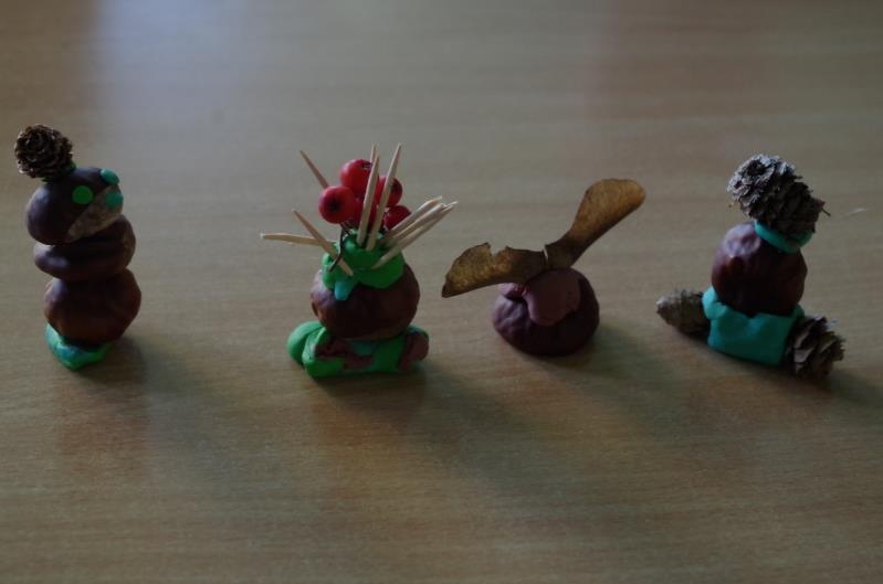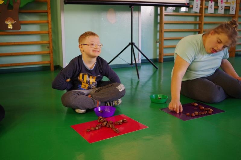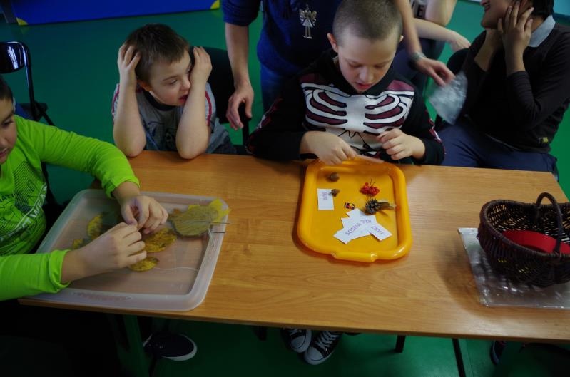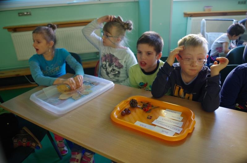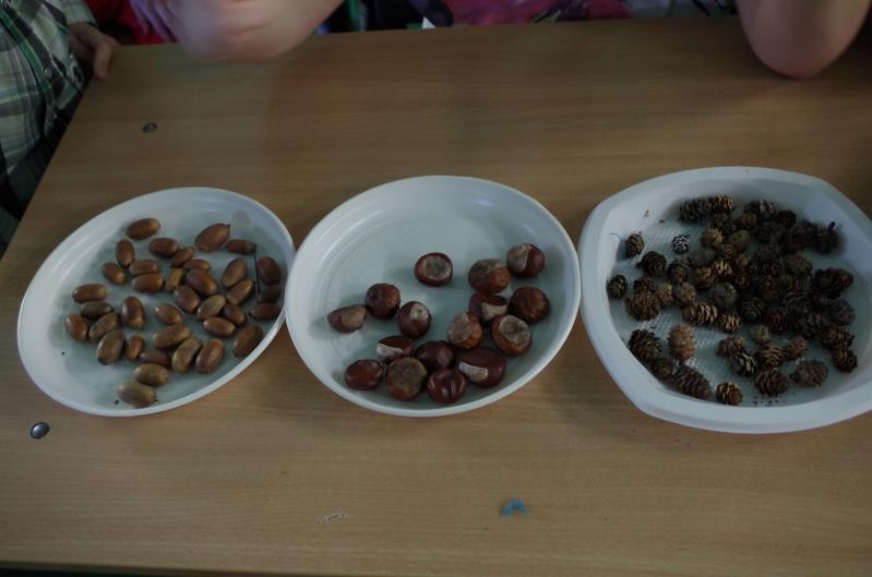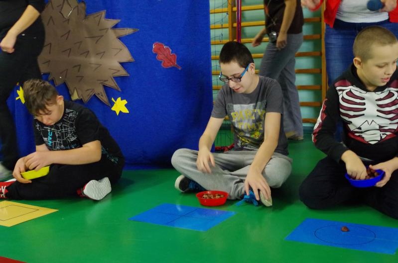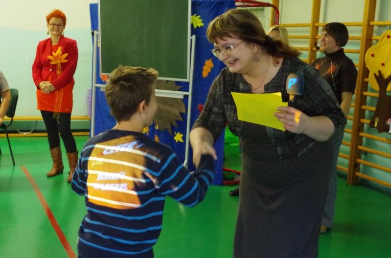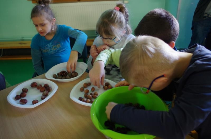 Tak jak zwykle było rozpoznawanie, nazywanie, liczenie, segregowanie i układanie wzorów. Tym razem uczniowie ćwiczyli te umiejętności z wykorzystaniem jesiennych leśnych skarbów tj. kolorowych liści, żołędzi, kasztanów, jarzębiny, bukowych orzeszków, szyszek itp. Uczestnicy konkursu przypomnieli sobie jak trzeba ubrać się na jesienny spacer, a także jakie zwierzęta można zobaczyć w lesie. Na pamiątkę wszystkim klasom zostały jesienne „ludziki”.