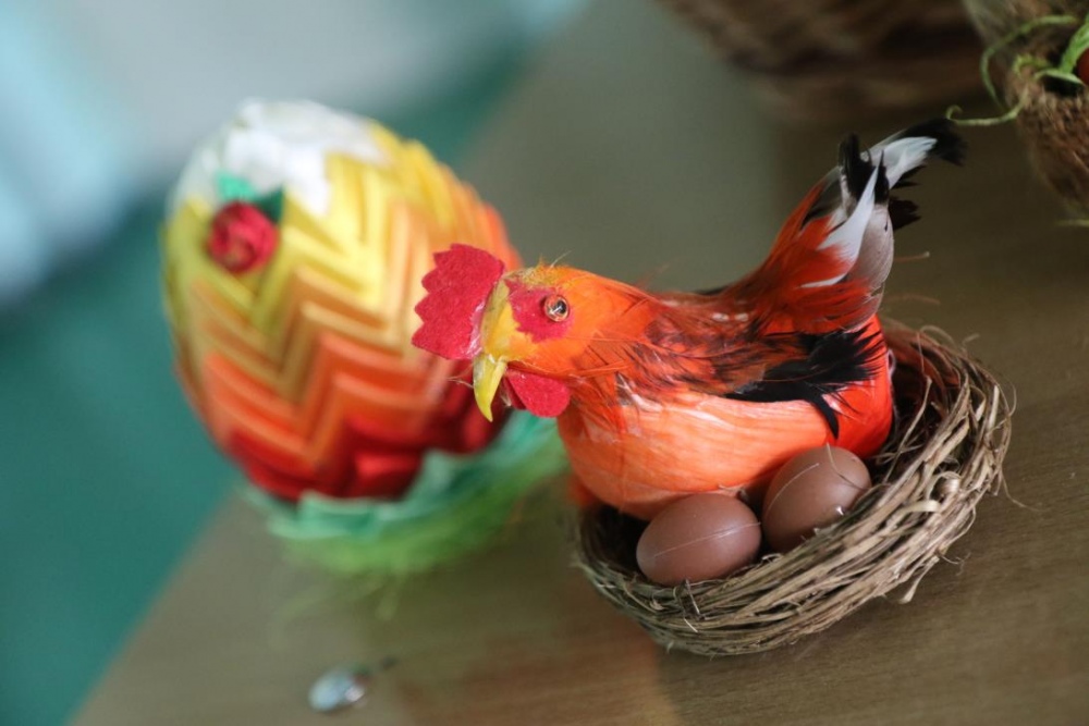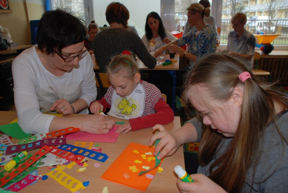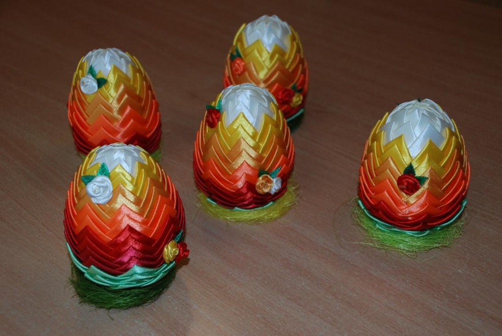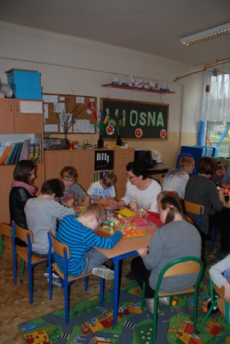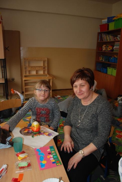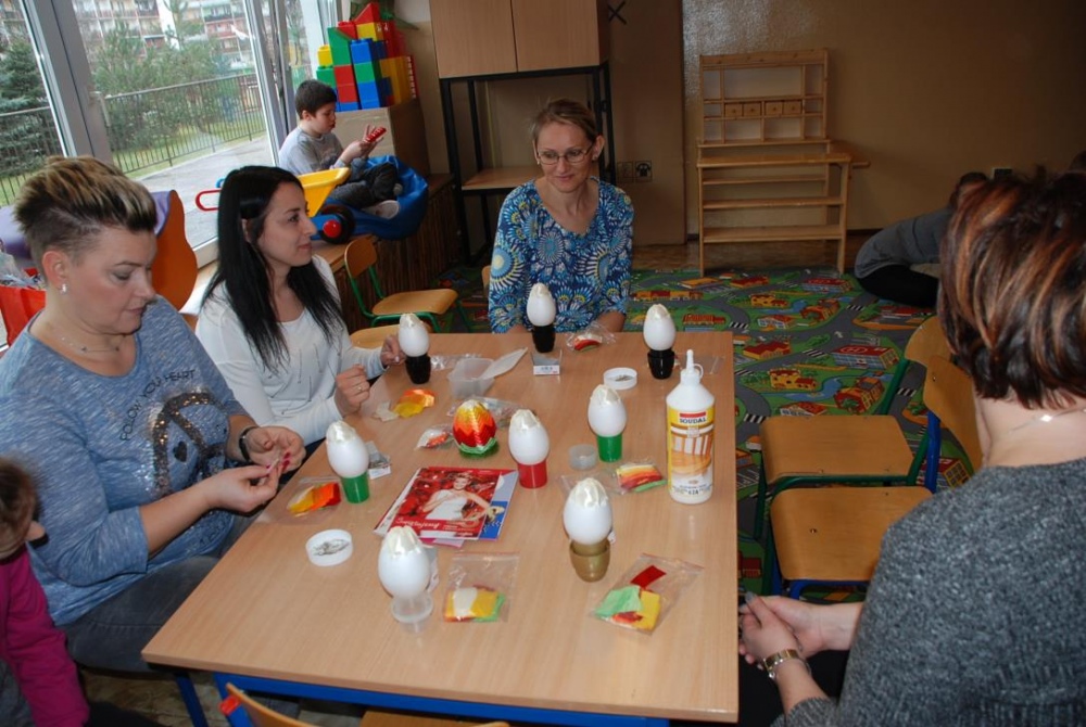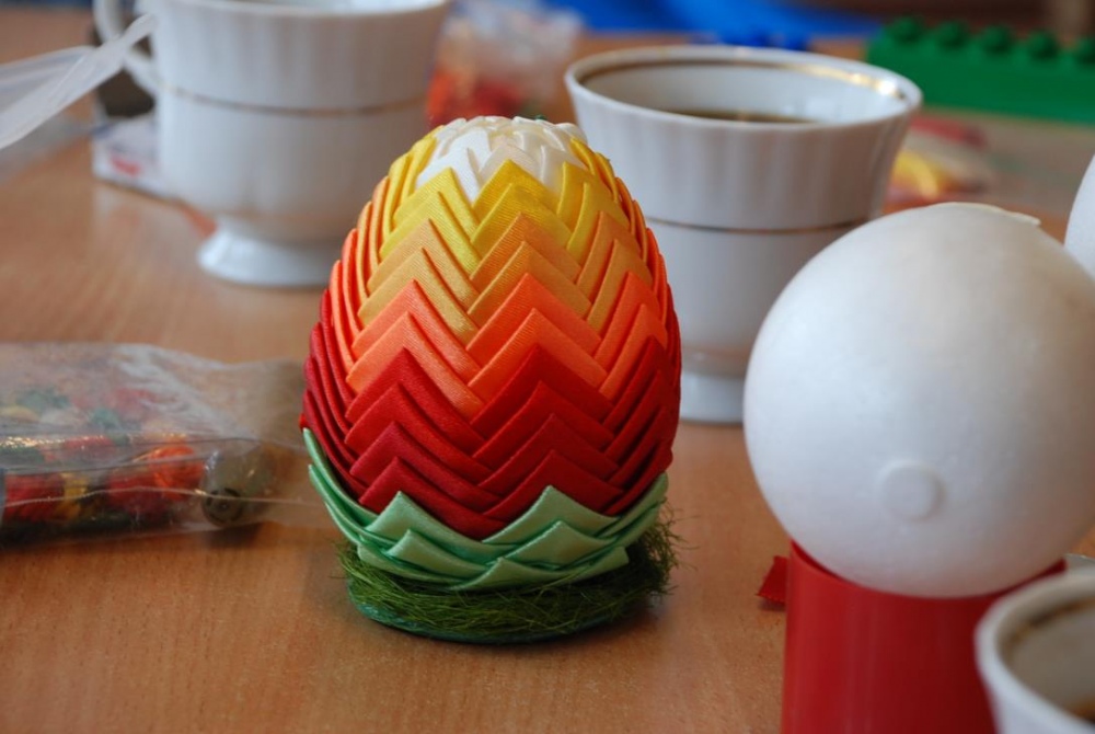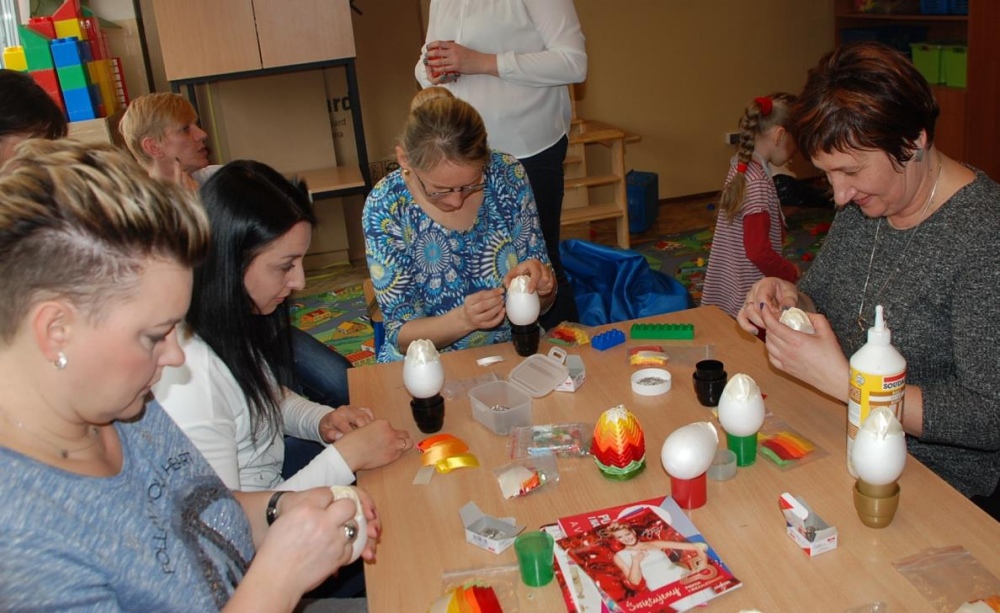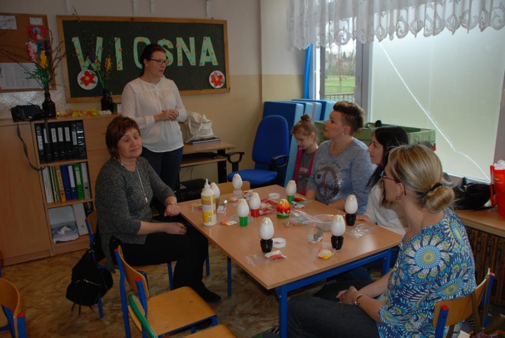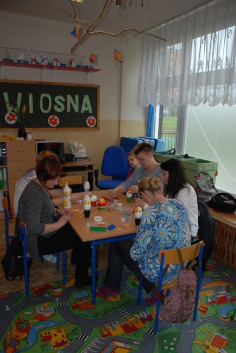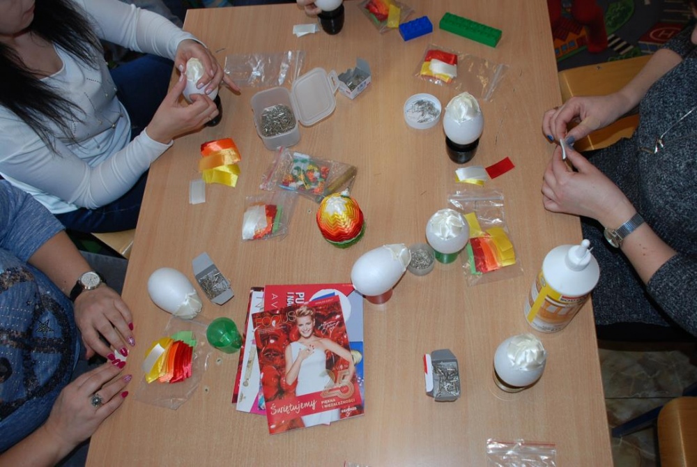 Grupa mam naszych najmłodszych uczniów miała okazję nauczyć się tej metody ozdabiania styropianowych jaj za pomocą wstążek. W roli prowadzącej te mini warszaty - mama Piotrusia.