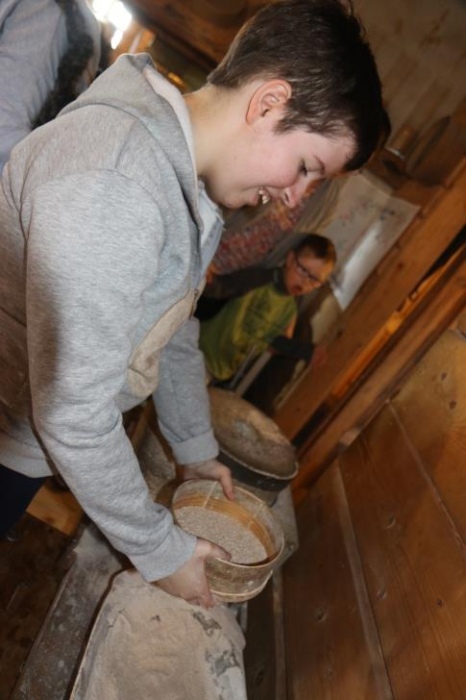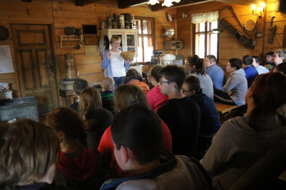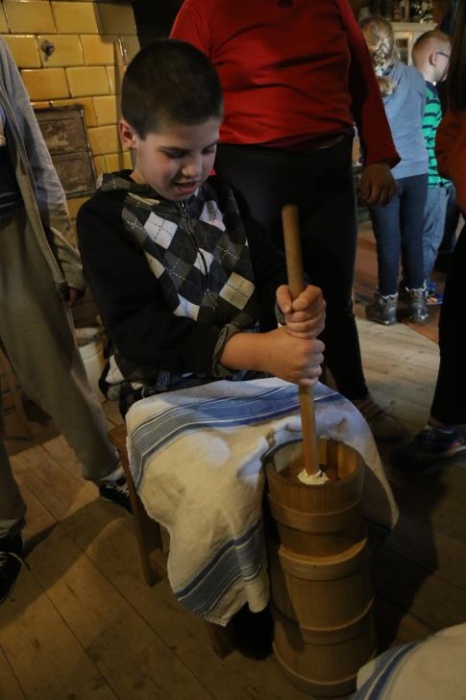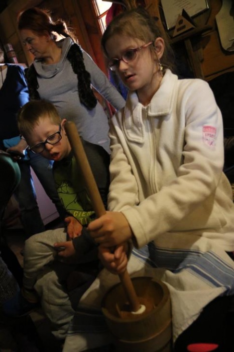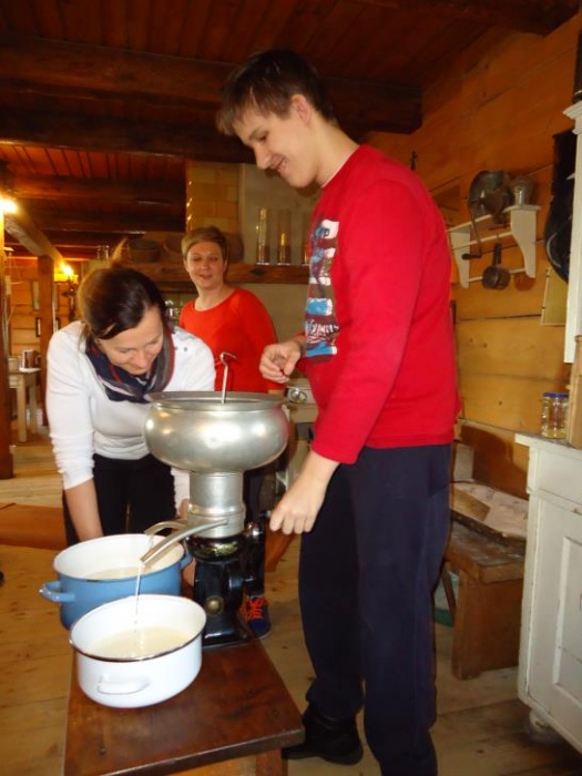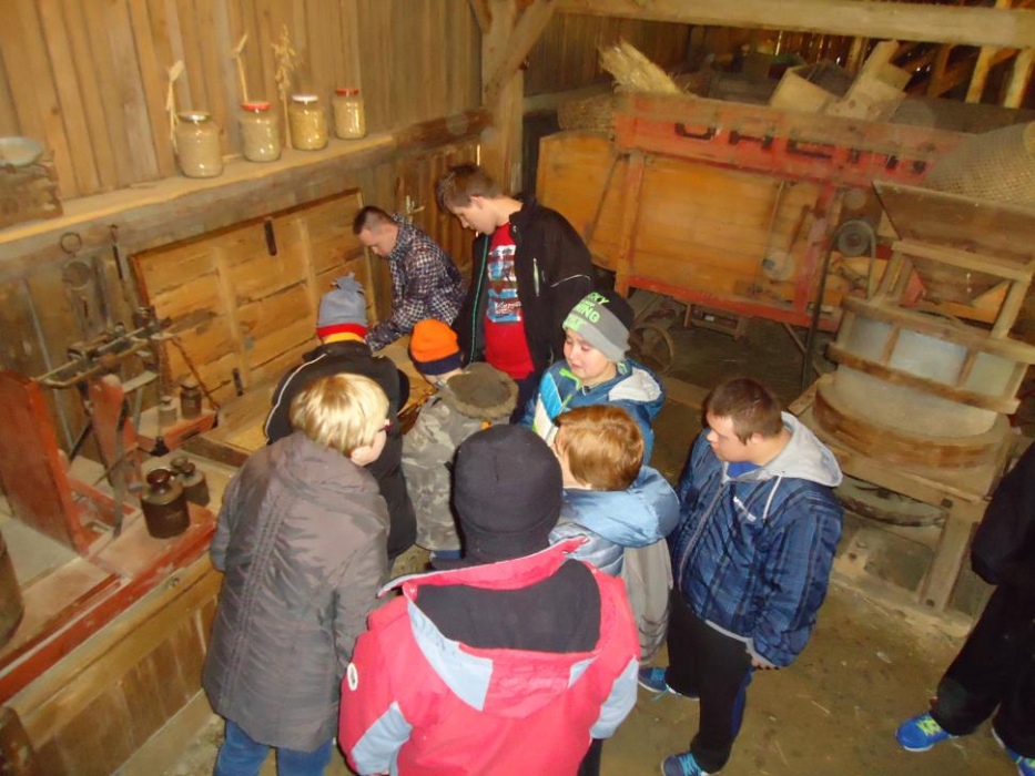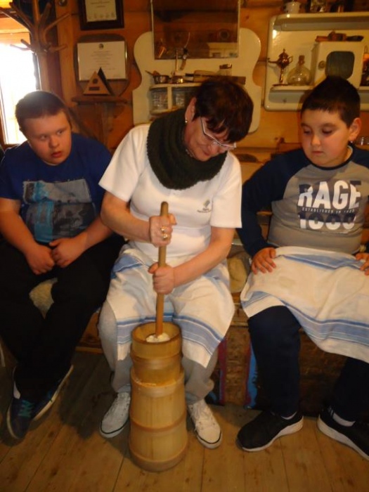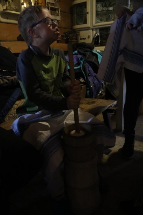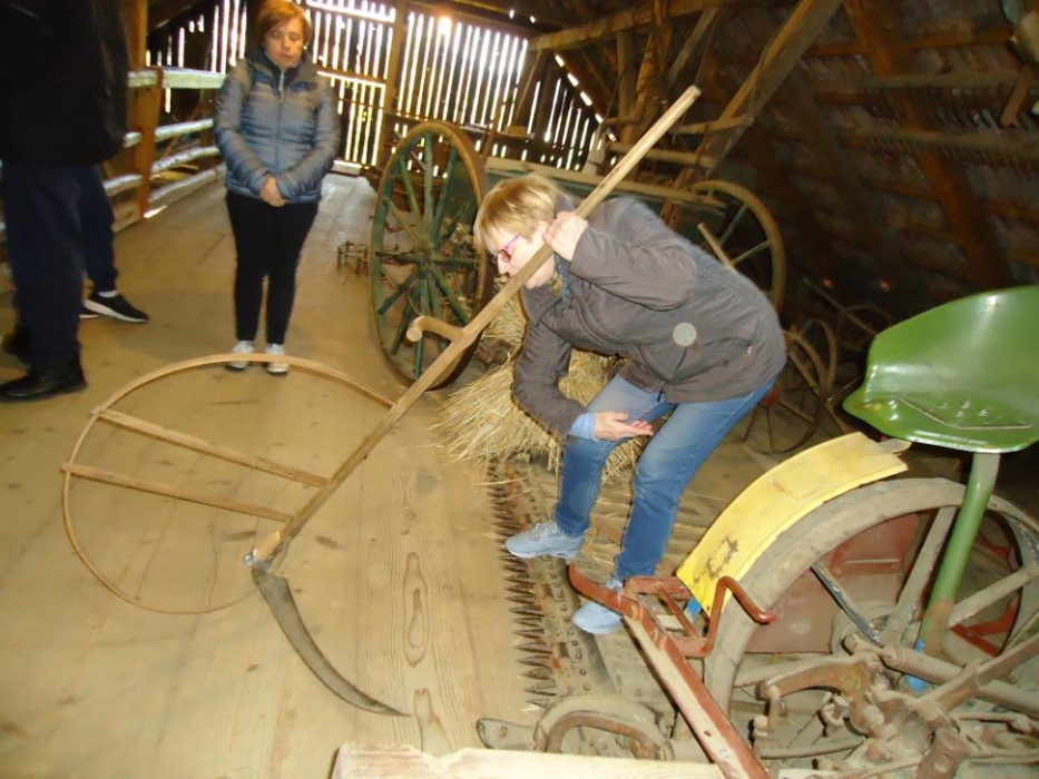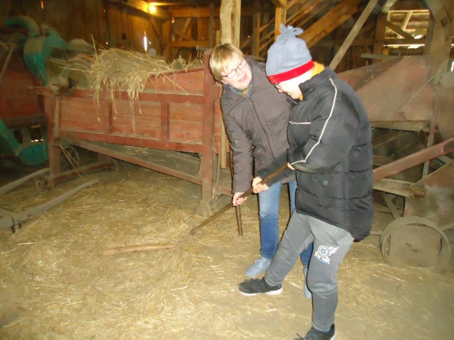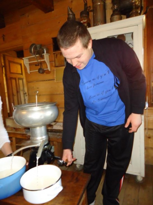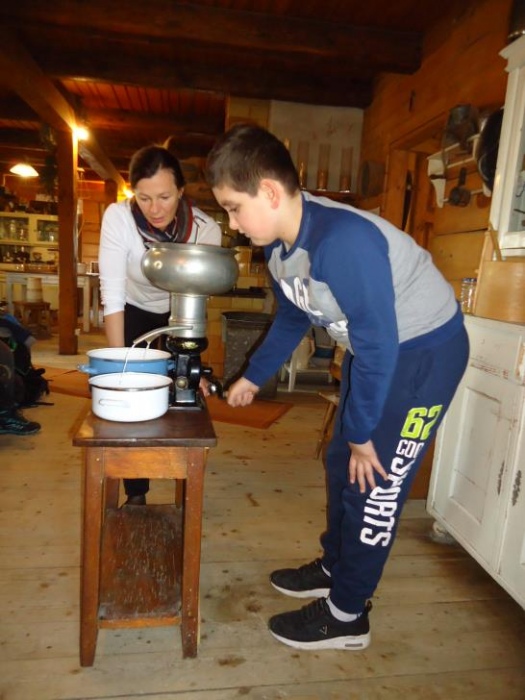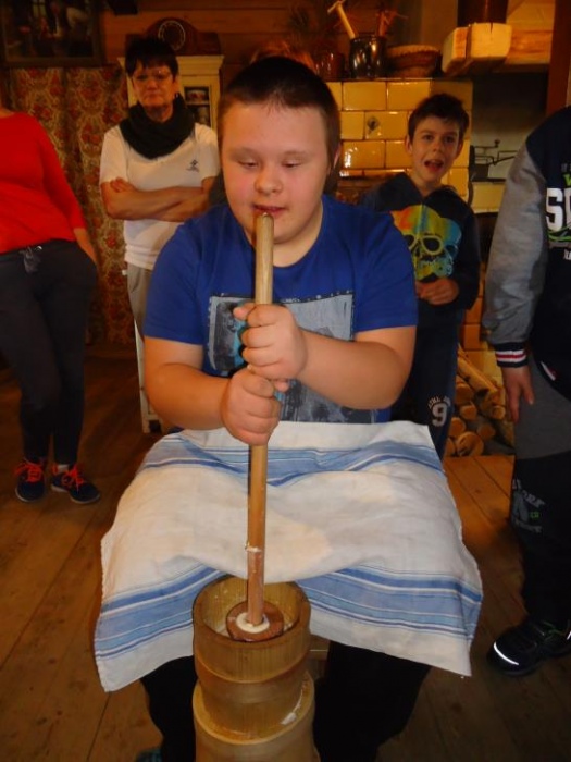 Po obiedzie z kolei czekała nas spora atrakcja - wycieczka do CHLEBOWEJ CHATY. Tam mogliśmy posłuchać, poobserwować, ale najważniejsze - doświadczyć szeregu bardzo ciekawych rzeczy związanych z wyrobem chleba, wyrobem produktów nabiałowych z wykorzystaniem dawnych sprzętów, czy z powstawaniem miodu. I tak nasi uczniowie: oddzielali śmietankę od mleka, ubijali i formowali masło, osiewali mąkę, wypiekali podpłomyki, degustowali wypieki i kawę zbożową, próbowali także czynności związanych z młóceniem cepami, mielili zboże na żarnach, siadali "za kierownicą" traktorów:)