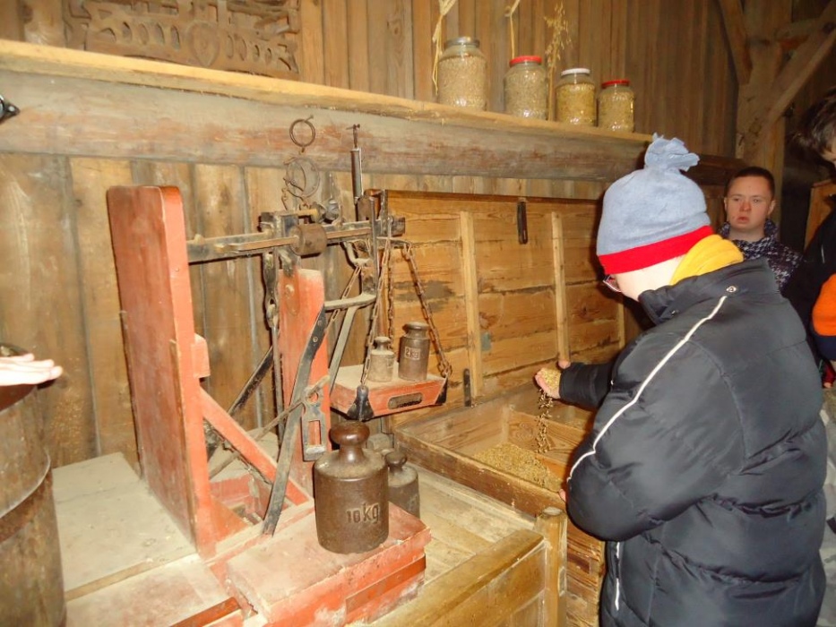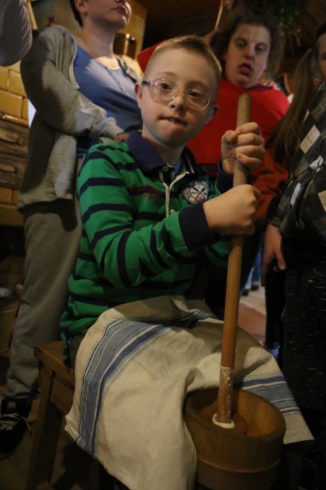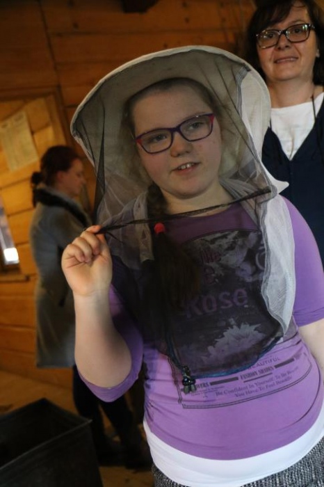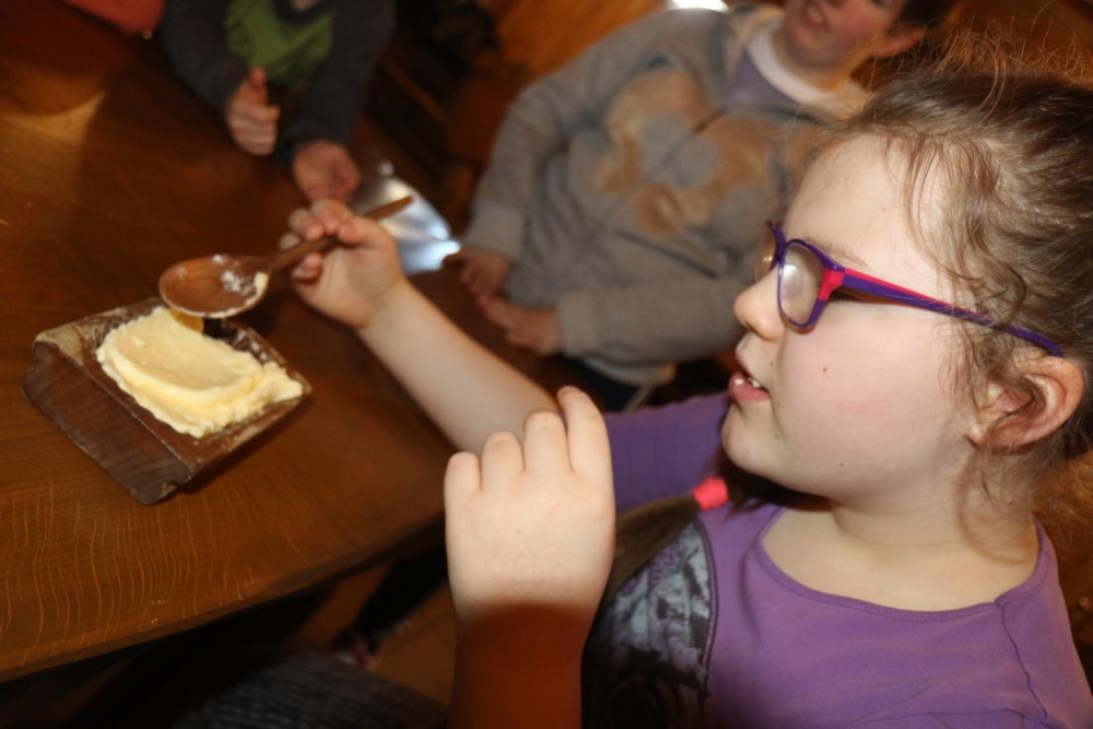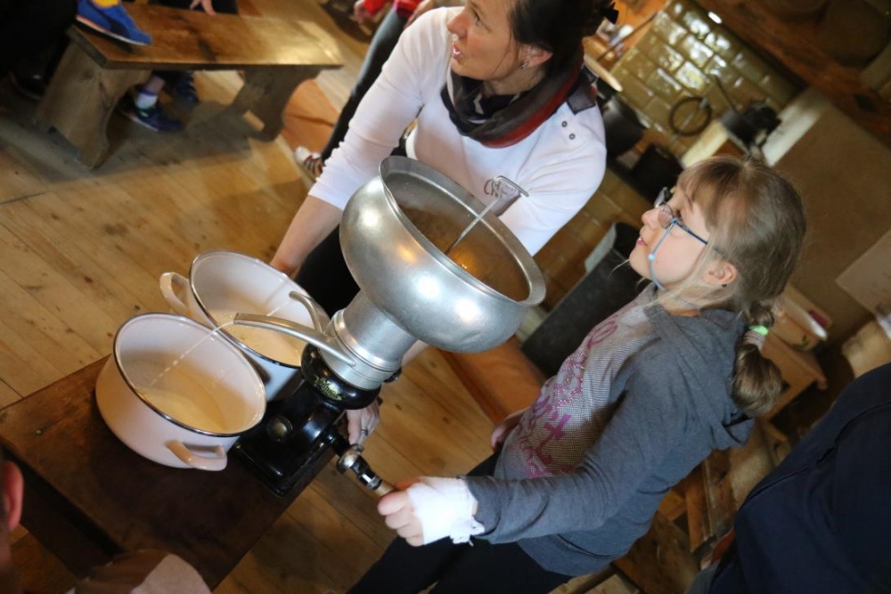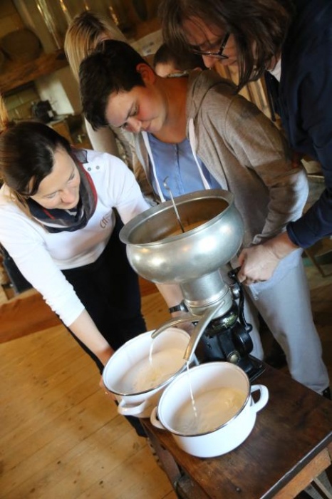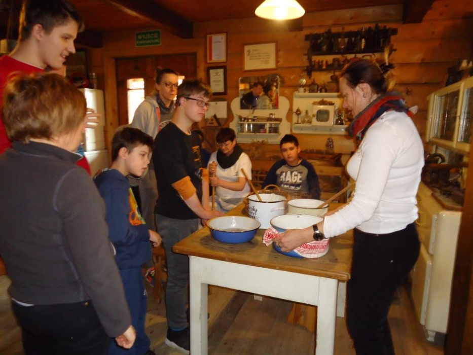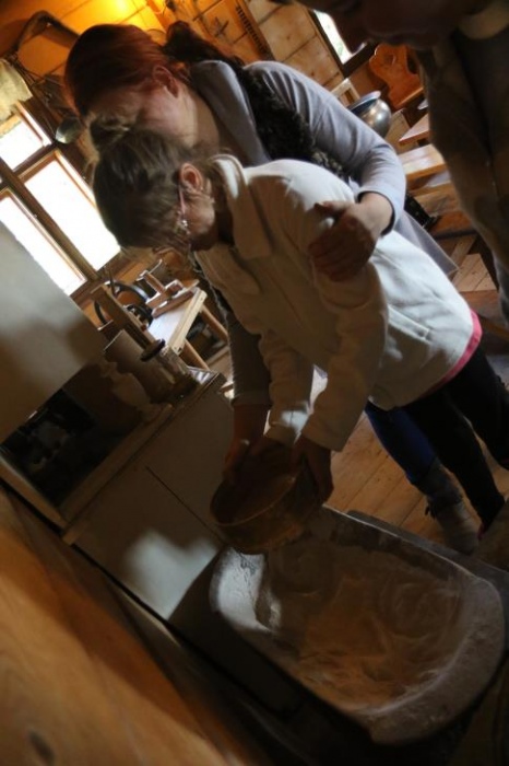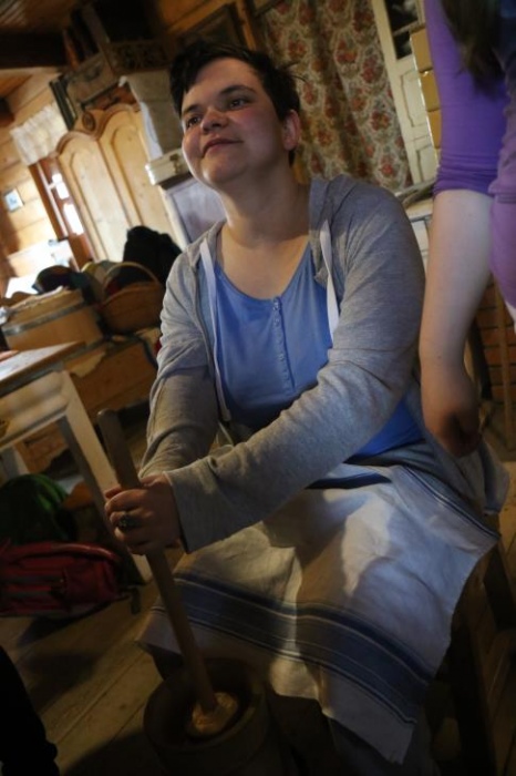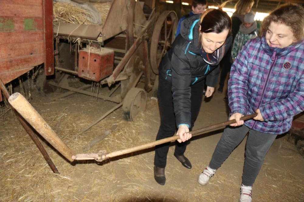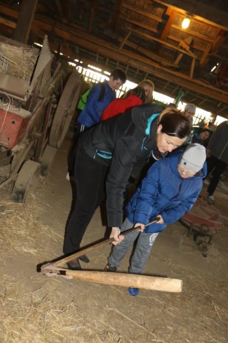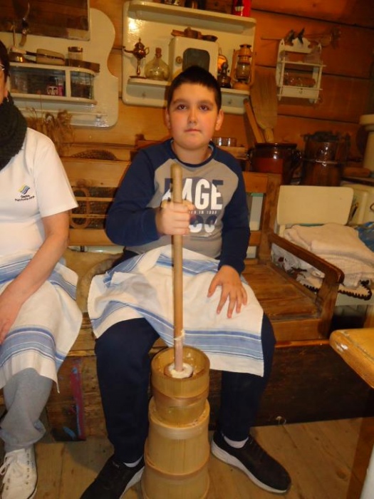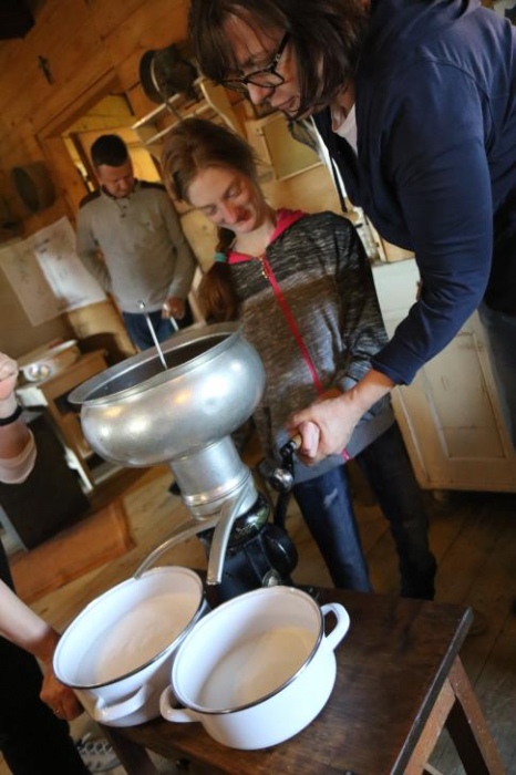 Po obiedzie z kolei czekała nas spora atrakcja - wycieczka do CHLEBOWEJ CHATY. Tam mogliśmy posłuchać, poobserwować, ale najważniejsze - doświadczyć szeregu bardzo ciekawych rzeczy związanych z wyrobem chleba, wyrobem produktów nabiałowych z wykorzystaniem dawnych sprzętów, czy z powstawaniem miodu. I tak nasi uczniowie: oddzielali śmietankę od mleka, ubijali i formowali masło, osiewali mąkę, wypiekali podpłomyki, degustowali wypieki i kawę zbożową, próbowali także czynności związanych z młóceniem cepami, mielili zboże na żarnach, siadali "za kierownicą" traktorów:)
