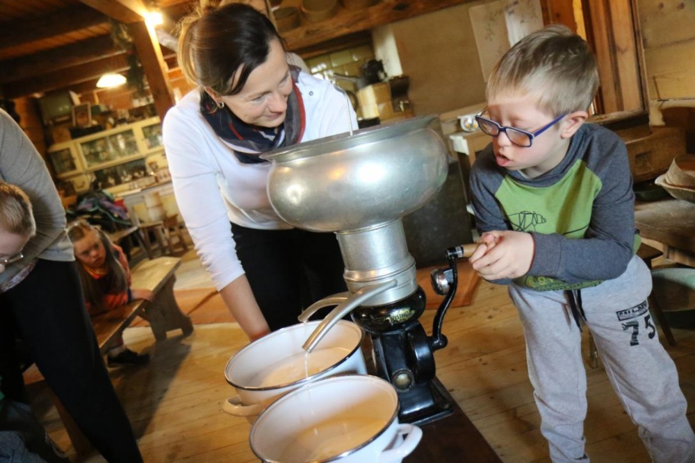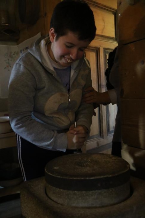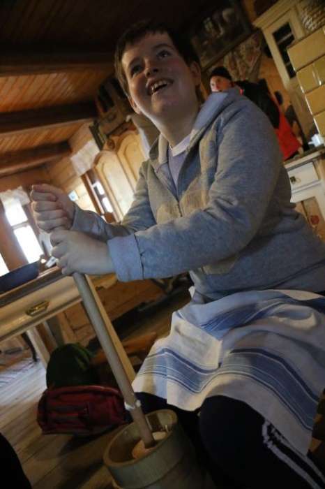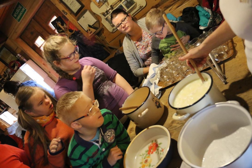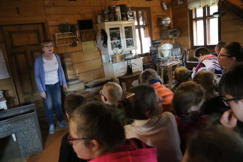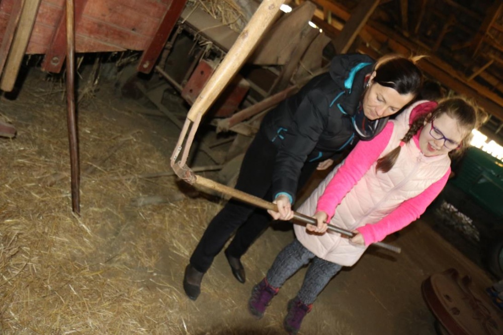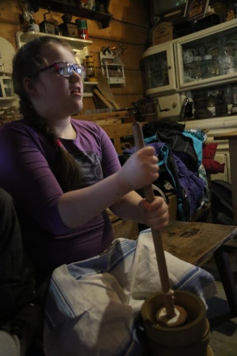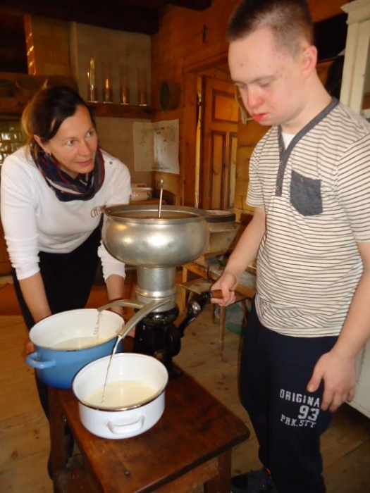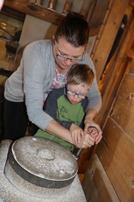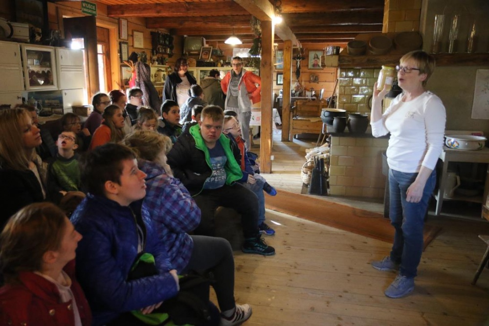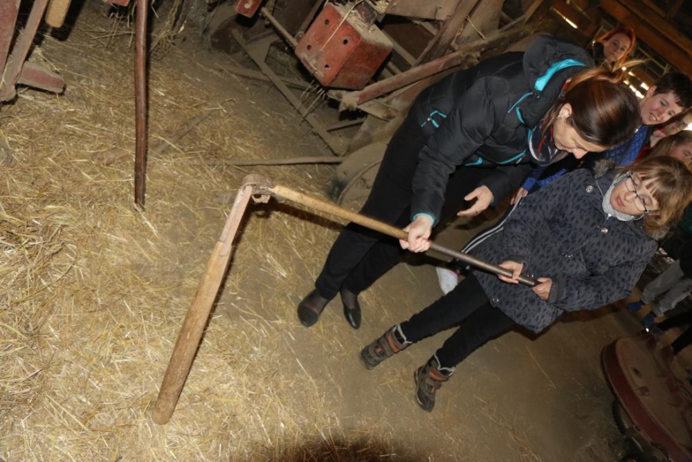 Po obiedzie z kolei czekała nas spora atrakcja - wycieczka do CHLEBOWEJ CHATY. Tam mogliśmy posłuchać, poobserwować, ale najważniejsze - doświadczyć szeregu bardzo ciekawych rzeczy związanych z wyrobem chleba, wyrobem produktów nabiałowych z wykorzystaniem dawnych sprzętów, czy z powstawaniem miodu. I tak nasi uczniowie: oddzielali śmietankę od mleka, ubijali i formowali masło, osiewali mąkę, wypiekali podpłomyki, degustowali wypieki i kawę zbożową, próbowali także czynności związanych z młóceniem cepami, mielili zboże na żarnach, siadali "za kierownicą" traktorów:)