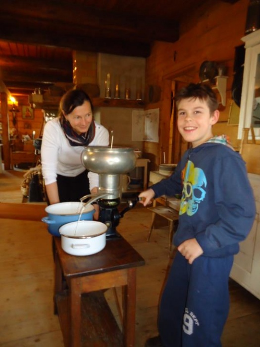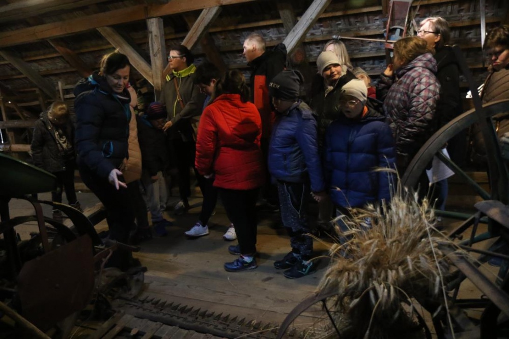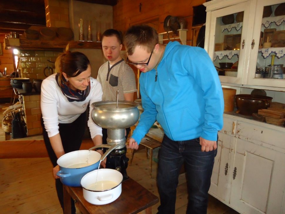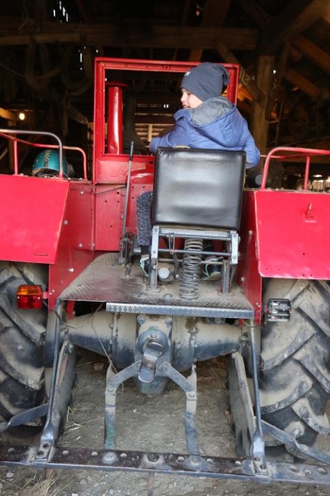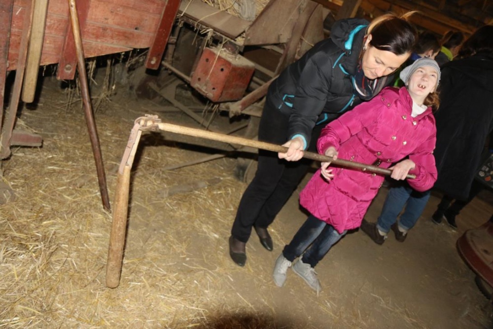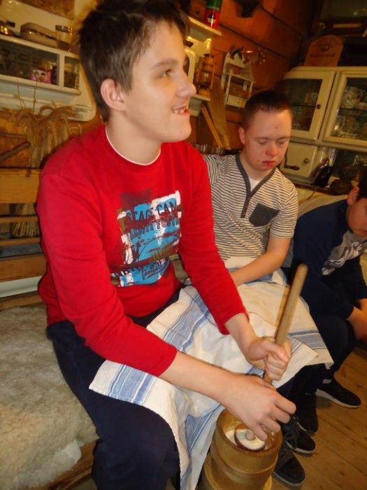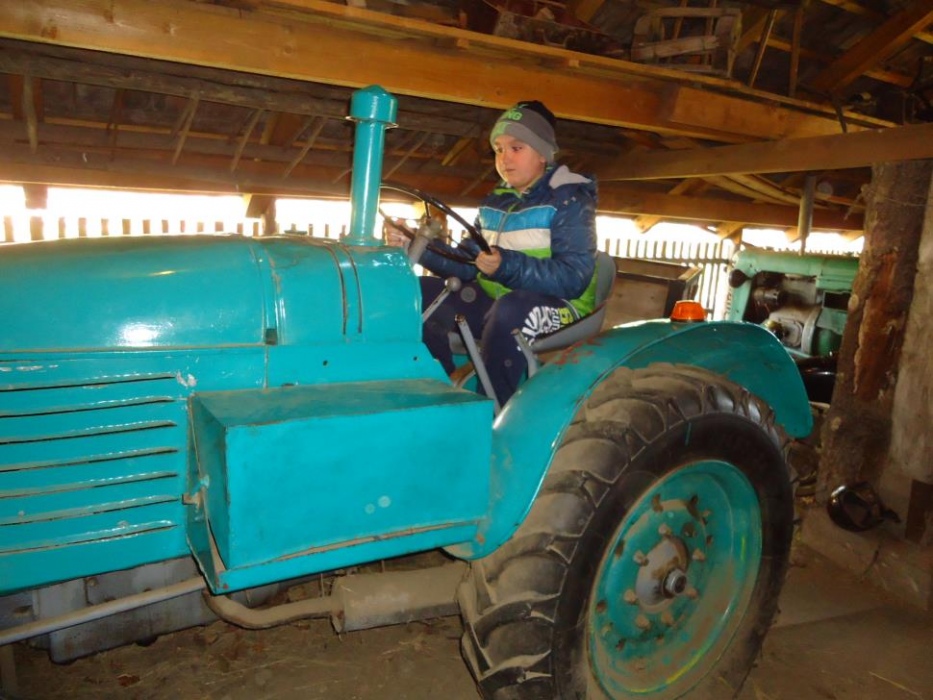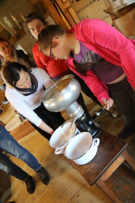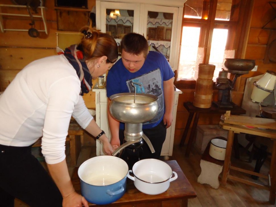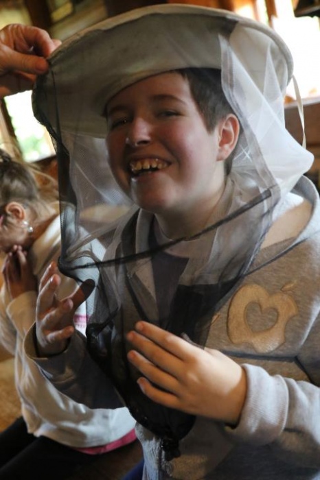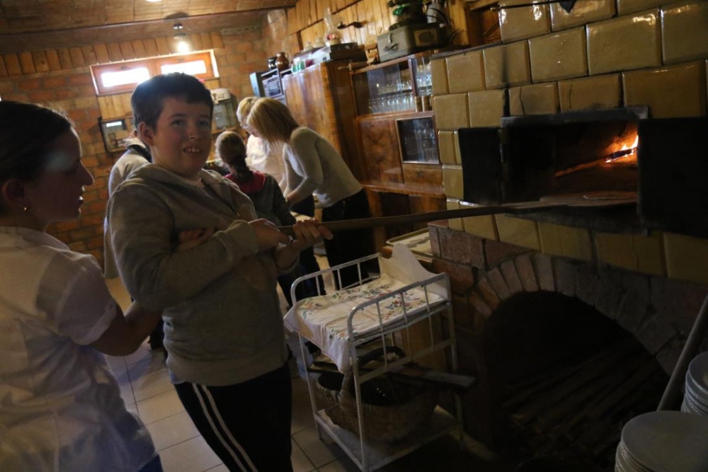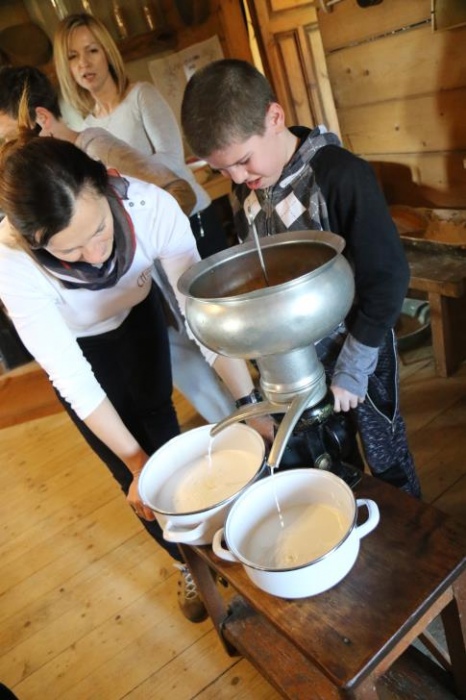 Po obiedzie z kolei czekała nas spora atrakcja - wycieczka do CHLEBOWEJ CHATY. Tam mogliśmy posłuchać, poobserwować, ale najważniejsze - doświadczyć szeregu bardzo ciekawych rzeczy związanych z wyrobem chleba, wyrobem produktów nabiałowych z wykorzystaniem dawnych sprzętów, czy z powstawaniem miodu. I tak nasi uczniowie: oddzielali śmietankę od mleka, ubijali i formowali masło, osiewali mąkę, wypiekali podpłomyki, degustowali wypieki i kawę zbożową, próbowali także czynności związanych z młóceniem cepami, mielili zboże na żarnach, siadali "za kierownicą" traktorów:)