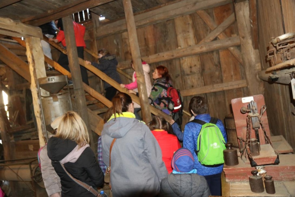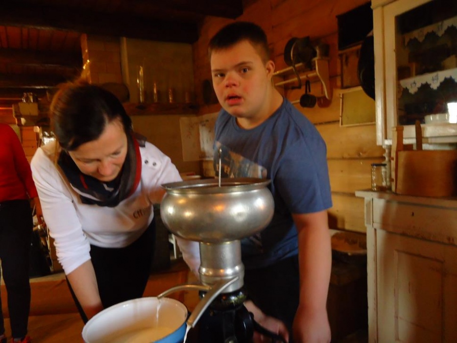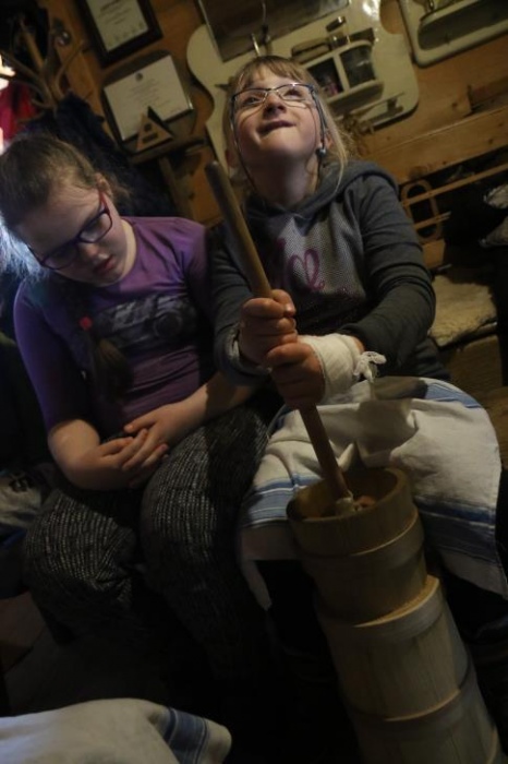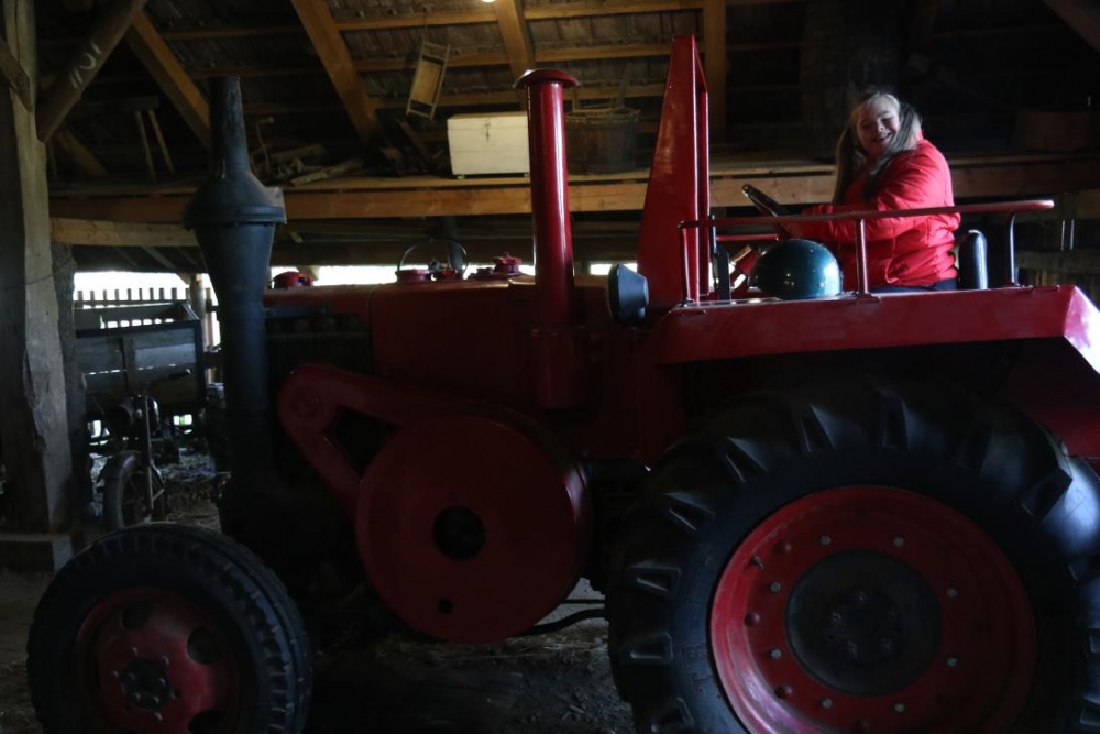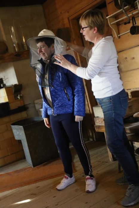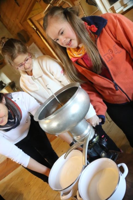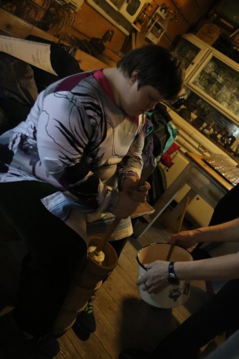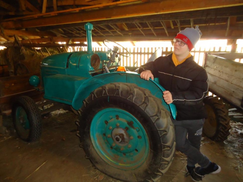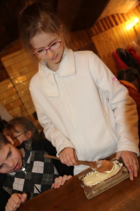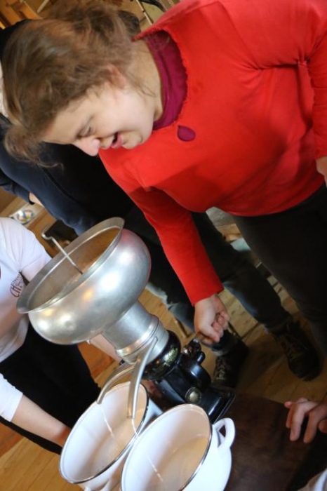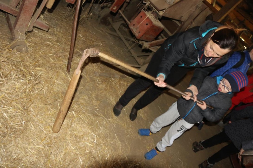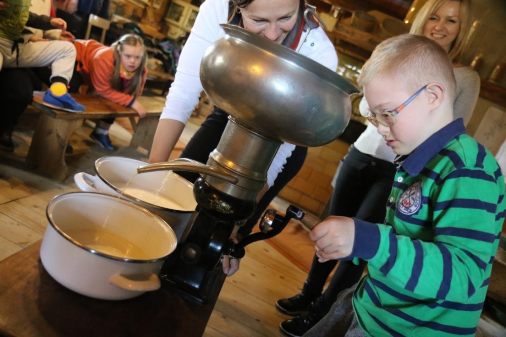 Po obiedzie z kolei czekała nas spora atrakcja - wycieczka do CHLEBOWEJ CHATY. Tam mogliśmy posłuchać, poobserwować, ale najważniejsze - doświadczyć szeregu bardzo ciekawych rzeczy związanych z wyrobem chleba, wyrobem produktów nabiałowych z wykorzystaniem dawnych sprzętów, czy z powstawaniem miodu. I tak nasi uczniowie: oddzielali śmietankę od mleka, ubijali i formowali masło, osiewali mąkę, wypiekali podpłomyki, degustowali wypieki i kawę zbożową, próbowali także czynności związanych z młóceniem cepami, mielili zboże na żarnach, siadali "za kierownicą" traktorów:)