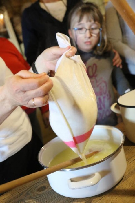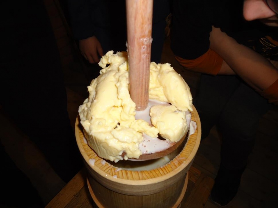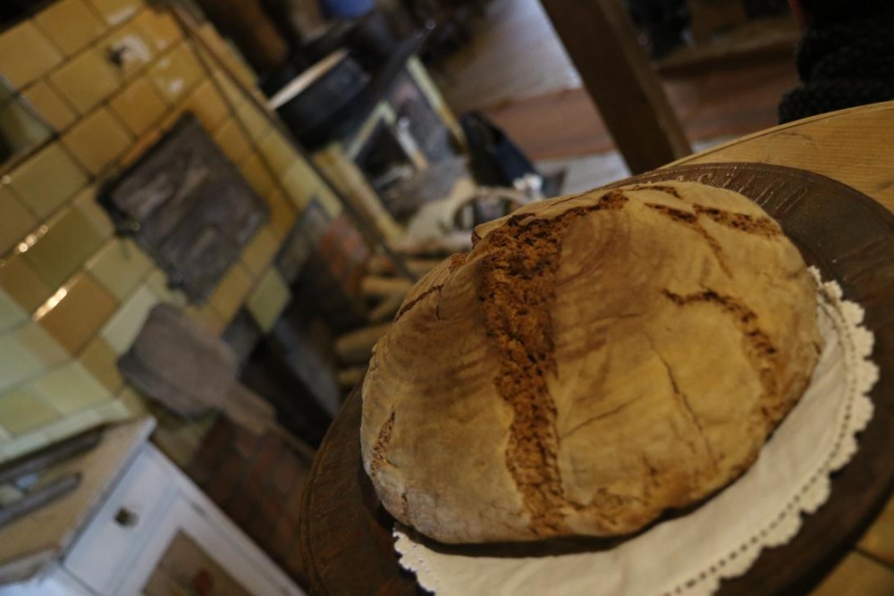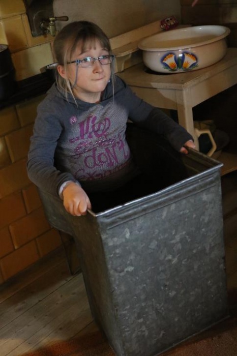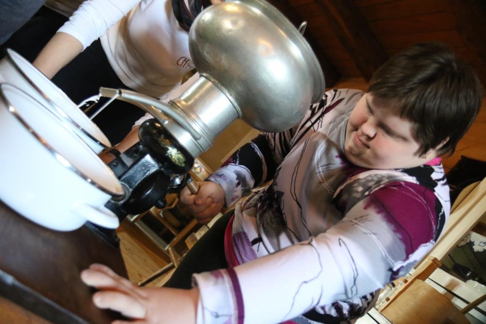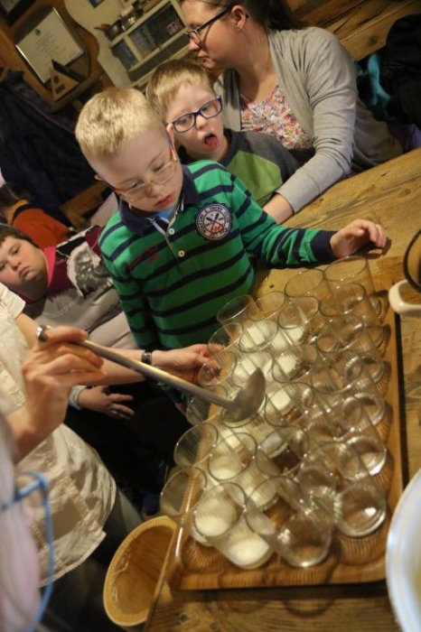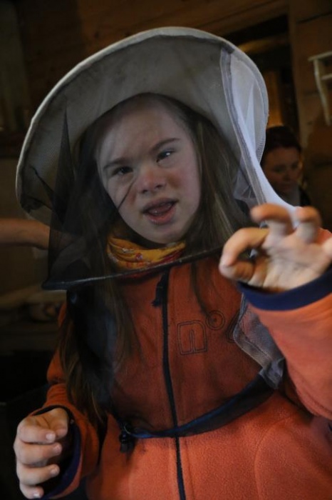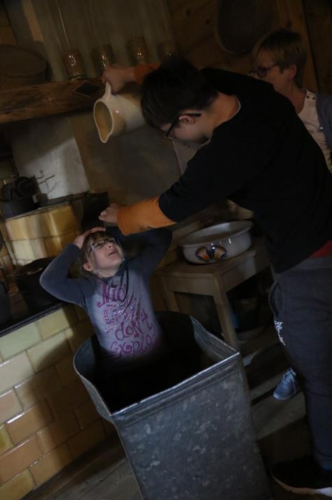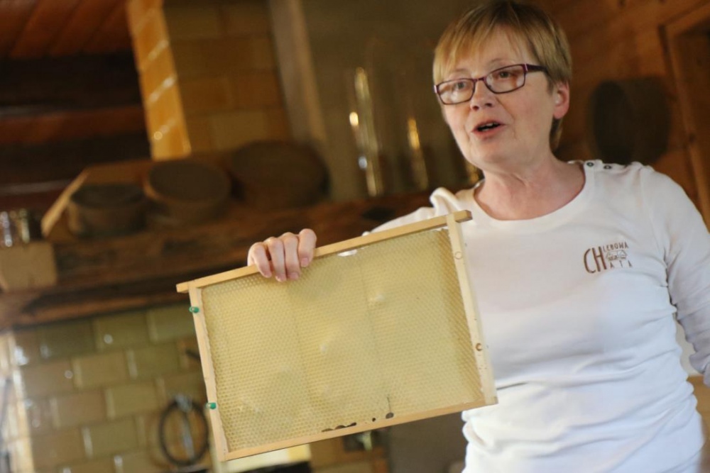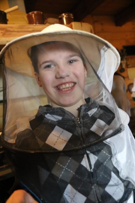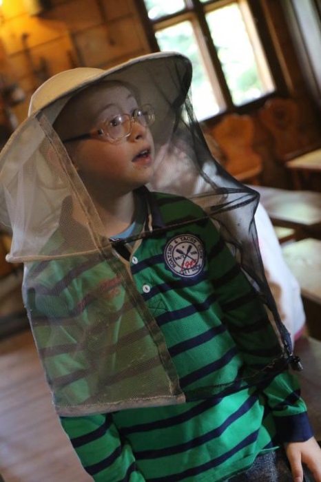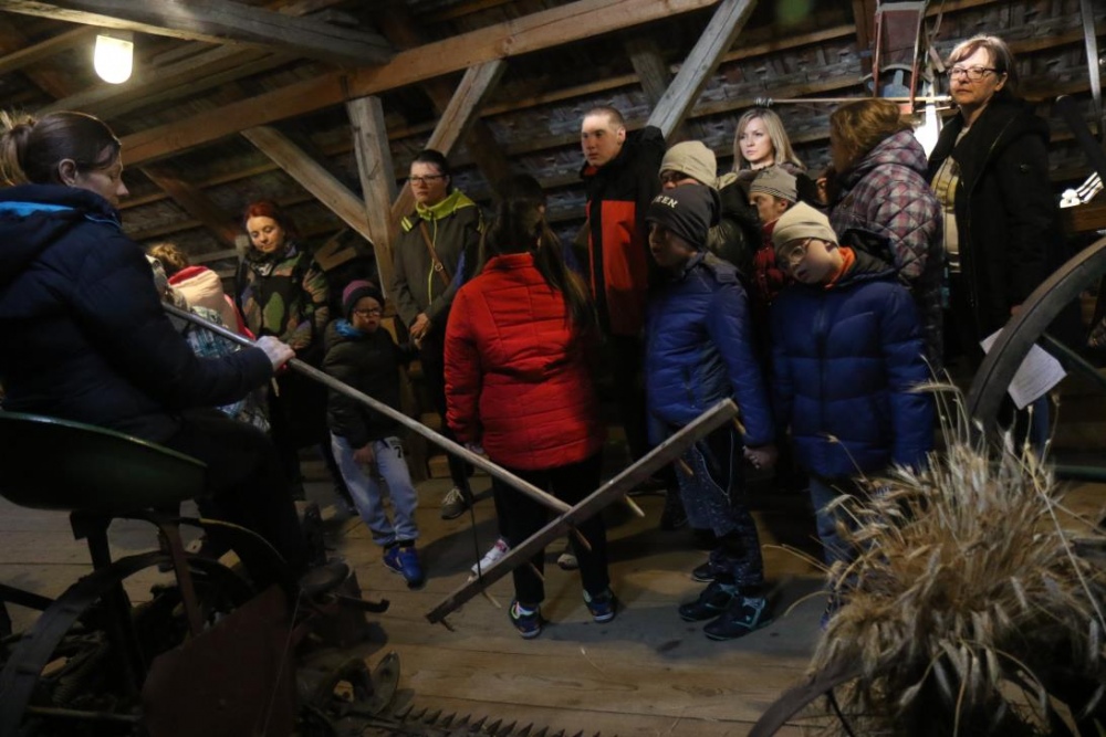 Po obiedzie z kolei czekała nas spora atrakcja - wycieczka do CHLEBOWEJ CHATY. Tam mogliśmy posłuchać, poobserwować, ale najważniejsze - doświadczyć szeregu bardzo ciekawych rzeczy związanych z wyrobem chleba, wyrobem produktów nabiałowych z wykorzystaniem dawnych sprzętów, czy z powstawaniem miodu. I tak nasi uczniowie: oddzielali śmietankę od mleka, ubijali i formowali masło, osiewali mąkę, wypiekali podpłomyki, degustowali wypieki i kawę zbożową, próbowali także czynności związanych z młóceniem cepami, mielili zboże na żarnach, siadali "za kierownicą" traktorów:)