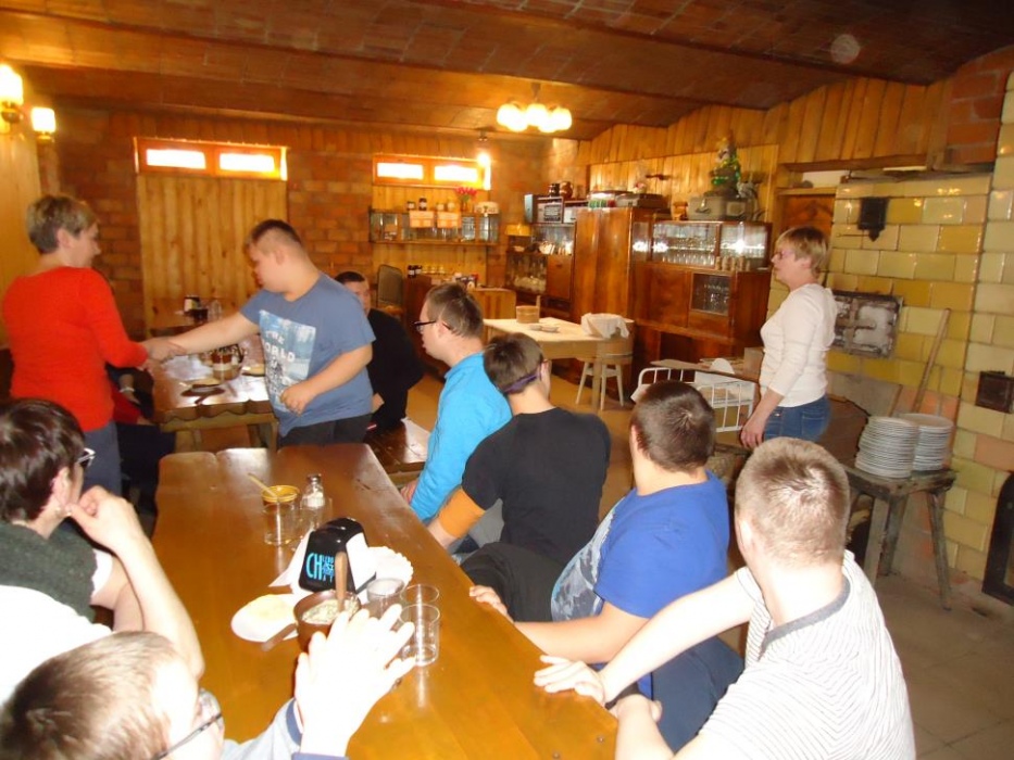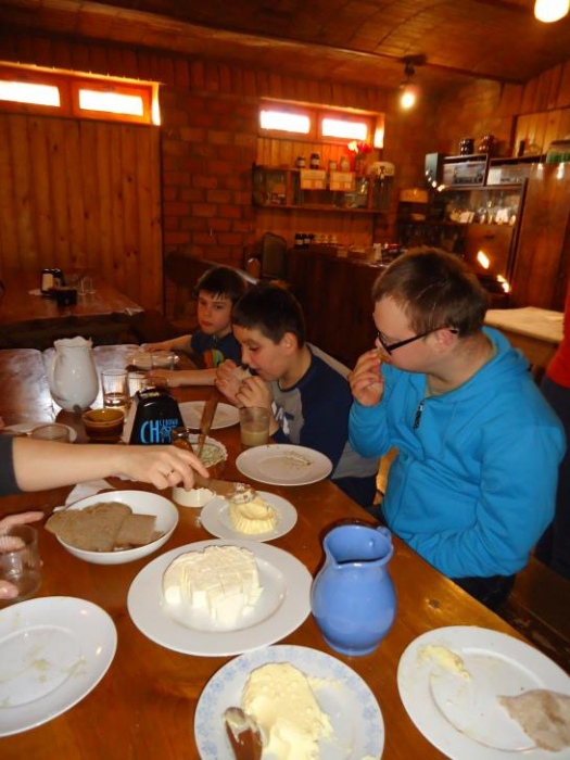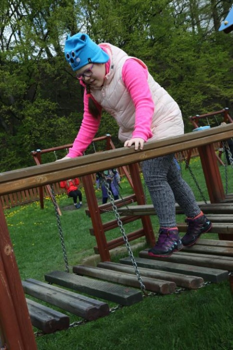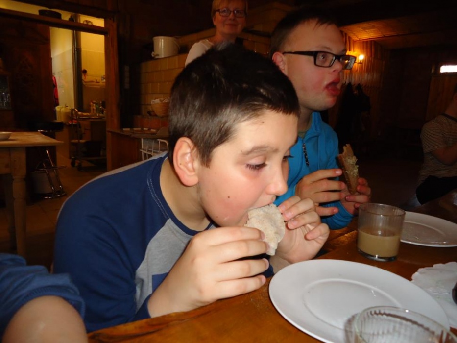 III DZIEŃ - PONIEDZIAŁEK - 24 kwietnia 2017r. - to poranne zajęcia w podgrupach. Podzieliliśmy się na dwie ekipy. Pierwsza miała okazję wspólnie uczyć się lub doskonalić w sztuce lepienia pierogów w ośrodkowej stołówce. Pod okiem pań kucharek oraz naszych opiekunów z pracy rąk naszych uczniów wyszły przepyszne pierowgi z truskawkami:). Zajęcia kończyła degustacja własnych wyrobów. Uczniowie tej grupy udali się także do pobliskiej zagrody. Mogli tam poobserwować i nakarmić sympatyczne koniki, a także zajrzeć do kurnika, a że mieli szczęście udało im się zebrać troszkę jajek:) Druga grupa w tym czasie spędzała czas nie mniej aktywnie z tym, że na sali gimnastycznej realizując zajęcia ruchowe z elementami integracji sensorycznej. Obie ekipy jeszcze przed obiadem znalazły czas i energię, by wybrać się na spacer. Odwiedziliśmy przy okazji pobliską siłownię pod "chmurką" oraz plac zabaw.