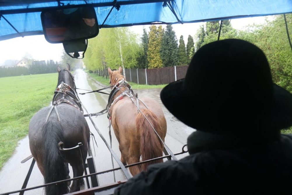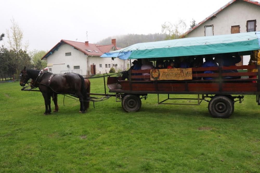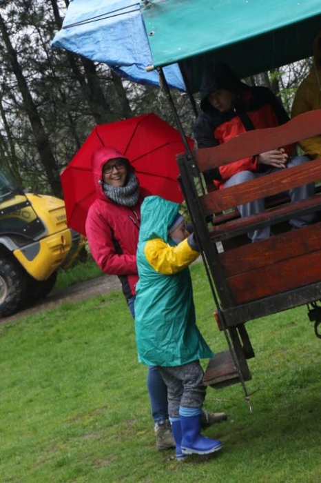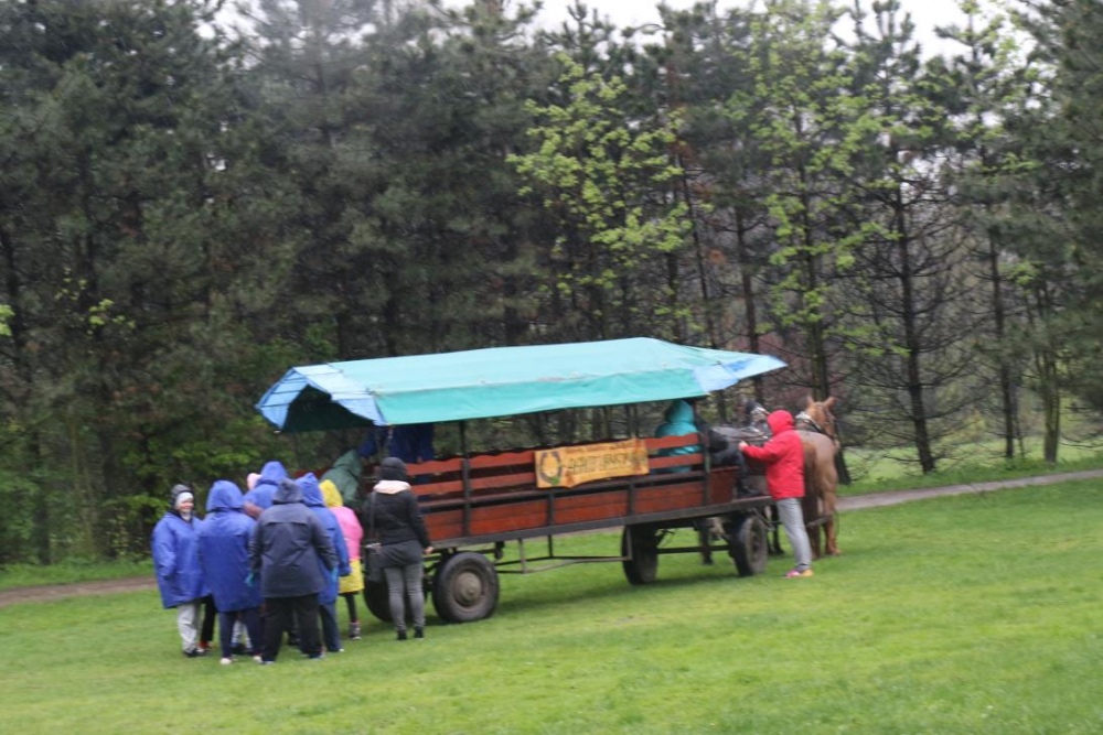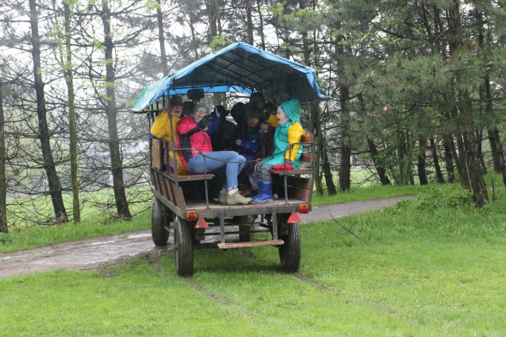 VI DZIEŃ - CZWARTEK - 27.04.2017r. - dzisiaj przywitał nas niestety deszcz:(... ale my, nie zrezygnowaliśmy z naszych planów - przejażdżki wozem konnym. Otrzymaliśmy bowiem informację, że wóz jest na to przygotowany i ma zainstalowany daszek:), no i w końcu z cukru nie jesteśmy:) Zaopatrzeni w kurtki przeciwdeszczowe, odbyliśmy krótkie przejażdżki po okolicy, ku uciesze wszystkich uczniów. Jeszcze przed obiadem część grupy wybrała się na salkę gimnastyczną, by się pogimnastykować. Ćwiczenia zakończyła zabawa z wstążkami przy muzyce. Było niezwykle wesoło i kolorowo.