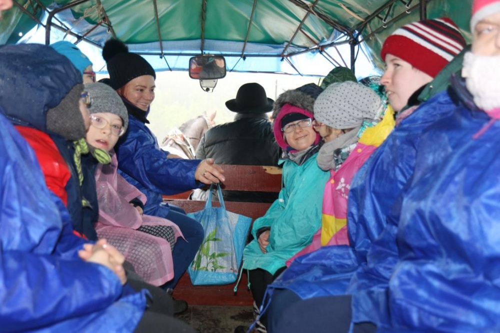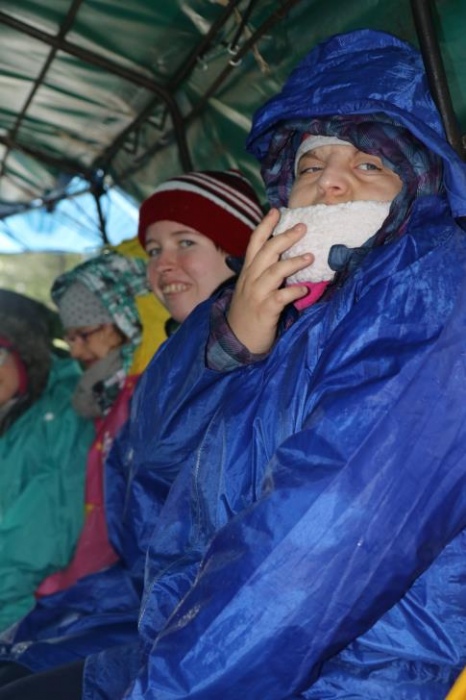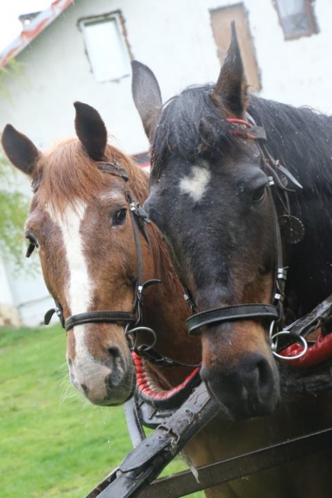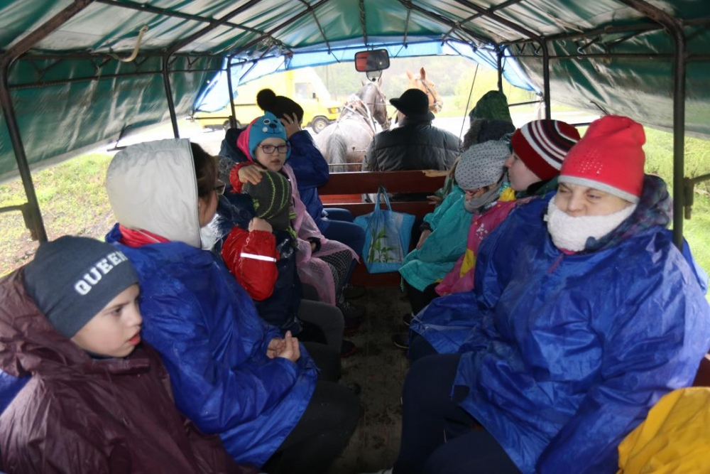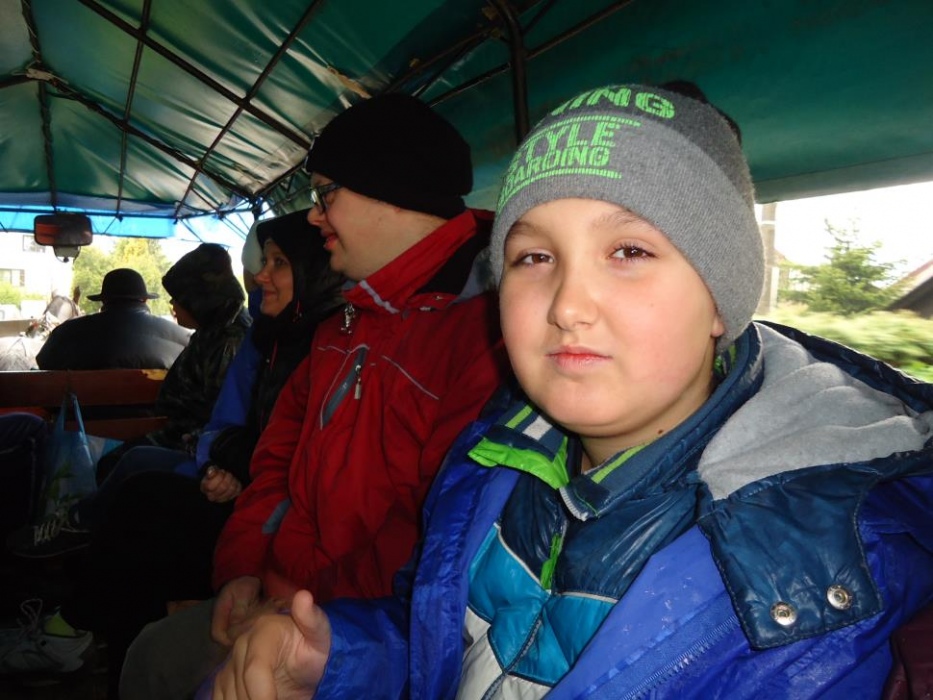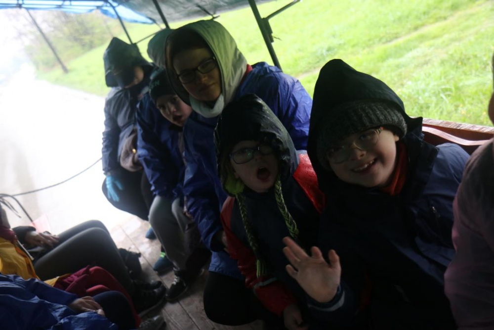 VI DZIEŃ - CZWARTEK - 27.04.2017r. - dzisiaj przywitał nas niestety deszcz:(... ale my, nie zrezygnowaliśmy z naszych planów - przejażdżki wozem konnym. Otrzymaliśmy bowiem informację, że wóz jest na to przygotowany i ma zainstalowany daszek:), no i w końcu z cukru nie jesteśmy:) Zaopatrzeni w kurtki przeciwdeszczowe, odbyliśmy krótkie przejażdżki po okolicy, ku uciesze wszystkich uczniów. Jeszcze przed obiadem część grupy wybrała się na salkę gimnastyczną, by się pogimnastykować. Ćwiczenia zakończyła zabawa z wstążkami przy muzyce. Było niezwykle wesoło i kolorowo.