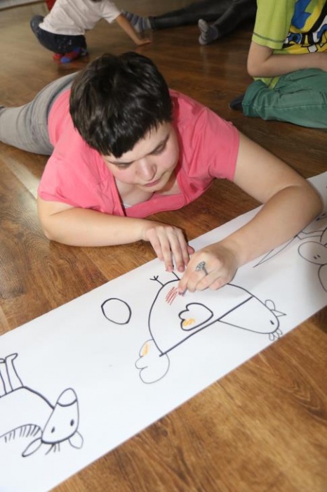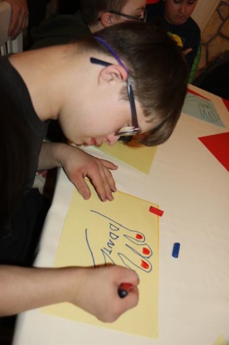 Popołudniu poszliśmy pospacerować, natomiast po kolacji było "dla każdego coś miłego" - wielbiciele muzyki i tańca mogli popląsać przy ulubionych hitach, tu warto dodać, że kierownictwo Zespołu BAJ nie musi sie obawiać, że z powodu tygodniowego zawieszenia prób nowego przedstawienia uczniowie zapomną utwory i choreografię, ponieważ nawet na Zielonej Szkole "trenują":). Wieczór zakończyły zajęcia plastyczne, tu szczególnie miłośnicy malowania mogli sie wykazać. Na przygotowanej przez opiekunów planszy widniały kontury obrazów związanych z naszym wyjazdem do Górek Wielkich. Wszyscy chętni mogli wybrać interesujący go motyw i według własnego uznania, samodzielnie lub z pomocą pokolorować.