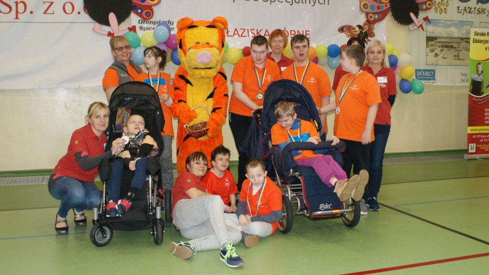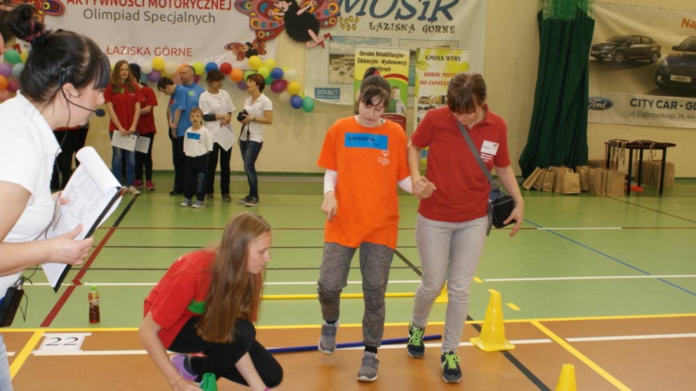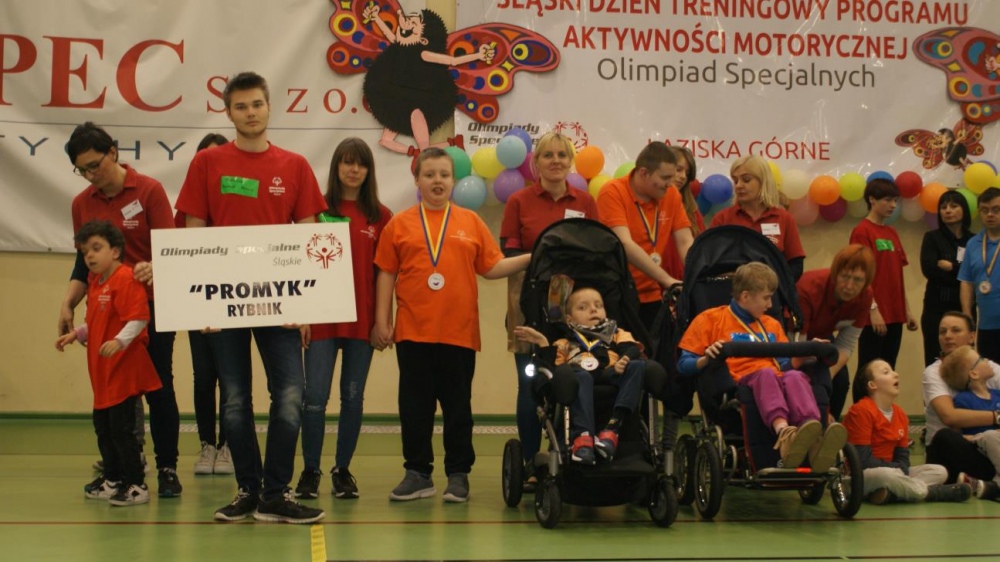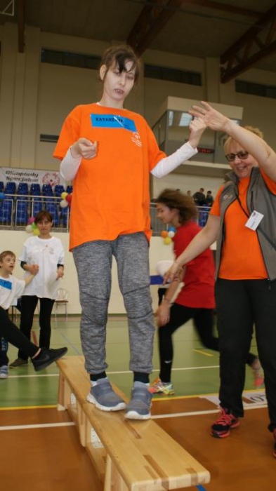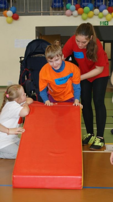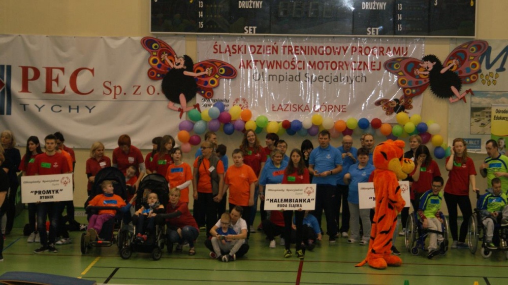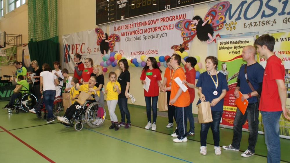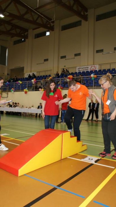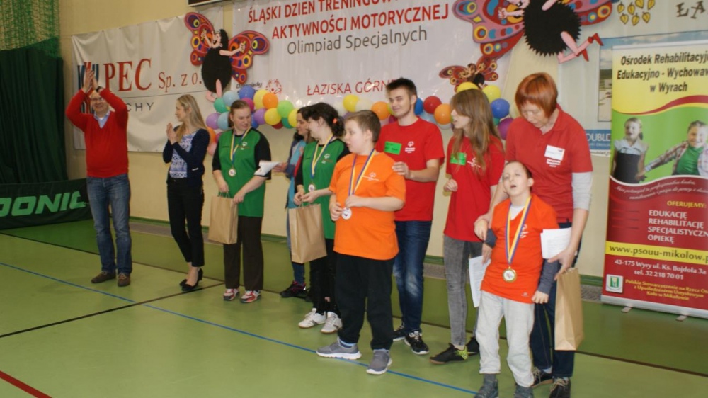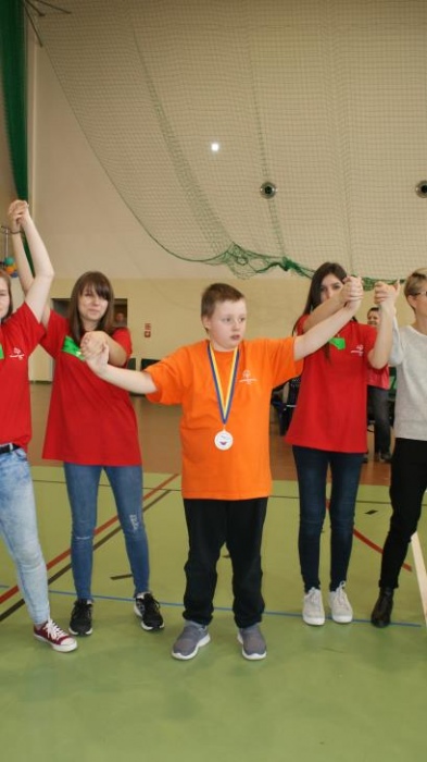 Nasza ekipa w składzie: Katarzyna Kroker, Patrycja Głodel, Paulina Jeszka, Daniel Kramer, Artur Czypiruk, Kuba Szczepankowki oraz Adrian Stebel podczas XXIII Śląskiego Dnia Treningowego Programu Aktywności Motorycznej Olimpiad Specjalnych Łaziska Górne 27.04.2017.