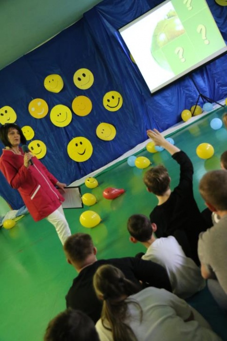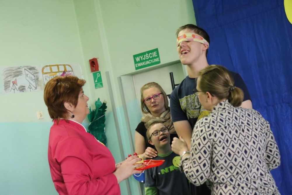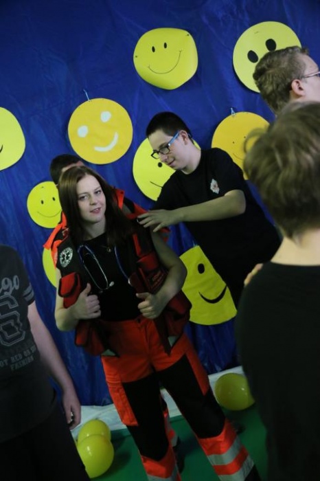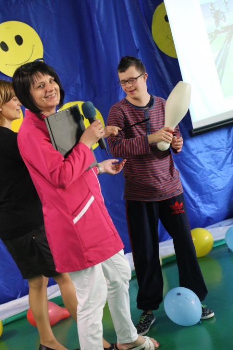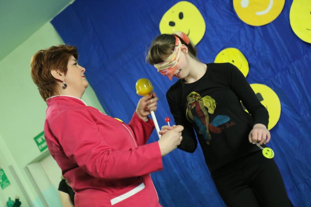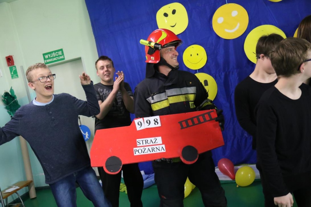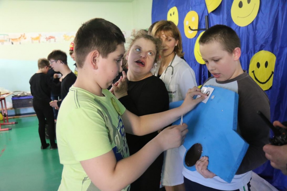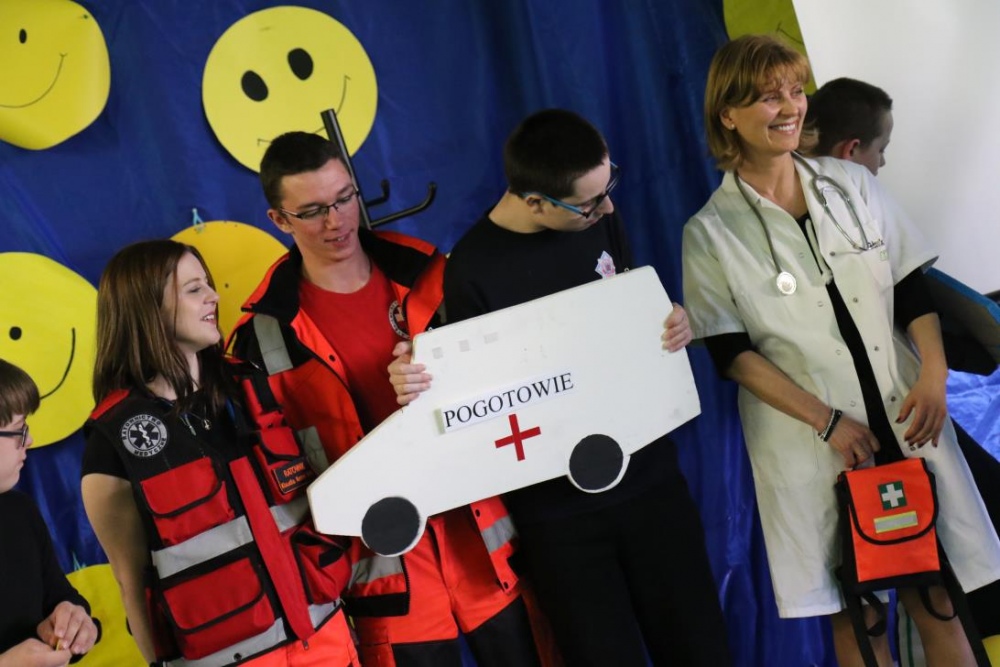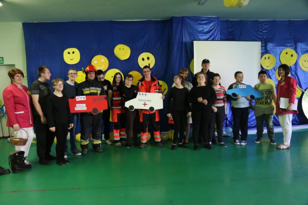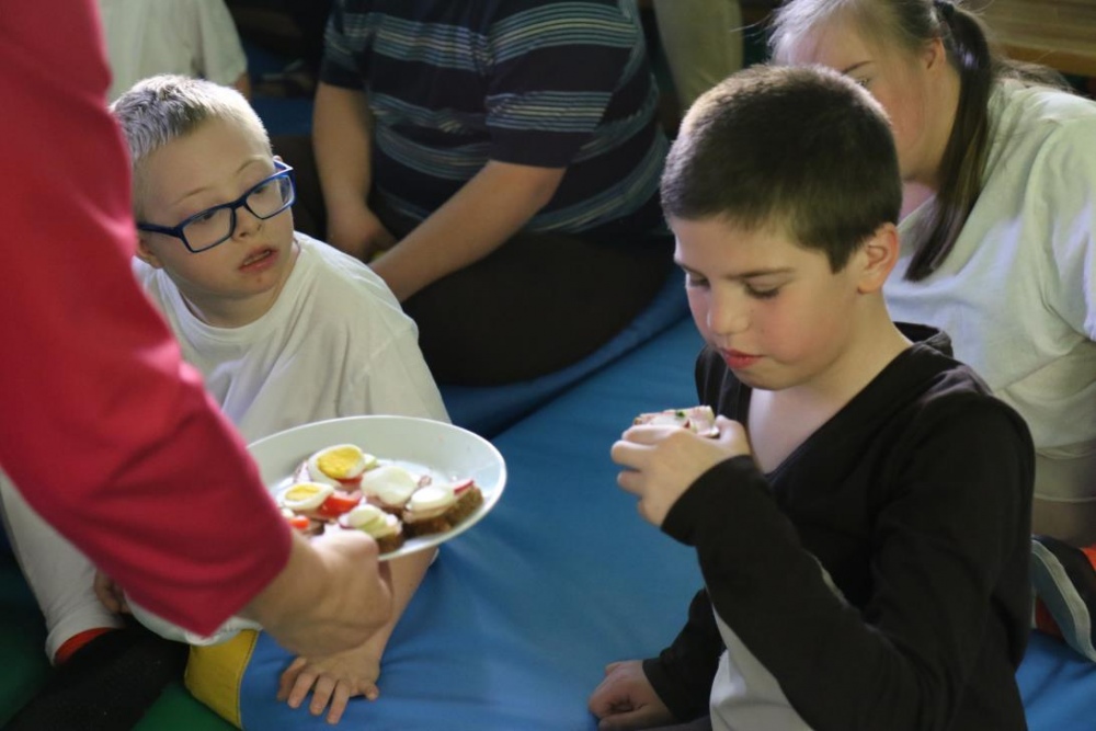 Po przedstawieniu – znikły smutne minki, a uśmiech zagościł nawet na dekoracji:) W tak dobrym nastroju rozpoczęły się zmagania uczniów w różnych konkurencjach dotyczących zdrowia i bezpieczeństwa: prawidłowego odżywiania, higieny, znajomości różnych dyscyplin sportowych, wiedzy z zakresu ruch drogowego, w tym znajomości numerów alarmowych. W trakcie konkursu nastąpiła degustacja zdrowych kanapek, a uczniowie głębiej niepełnosprawni smakowali miksy zdrowych produktów. Całość przeplatana była tematycznymi piosenkami i ćwiczeniami ruchowymi prowadzonymi przez nauczycieli panie: Joannę Sobik i Agnieszkę Malinowską.