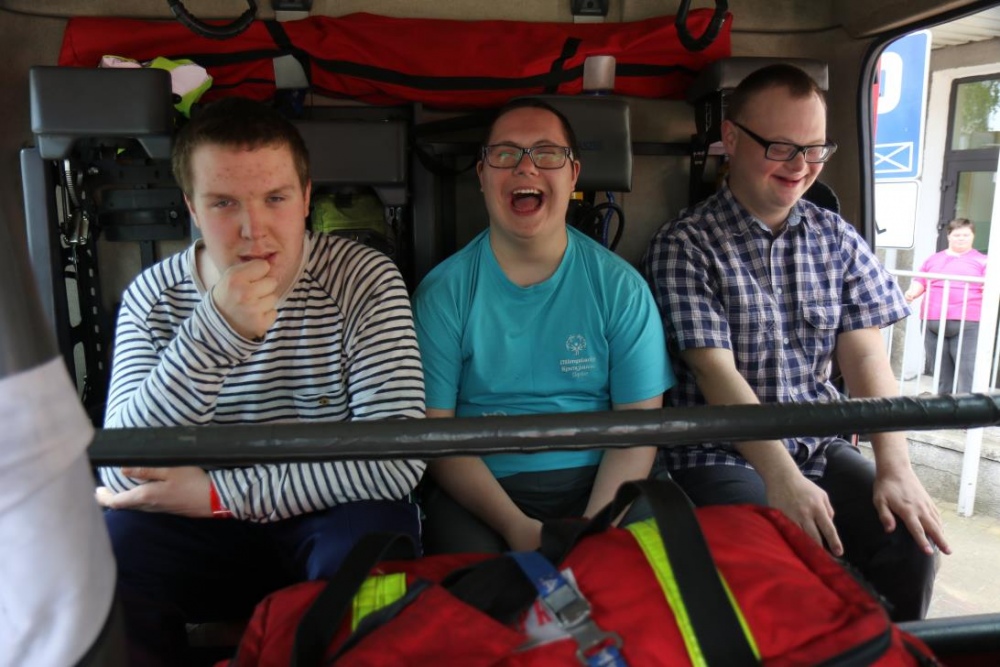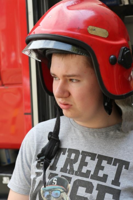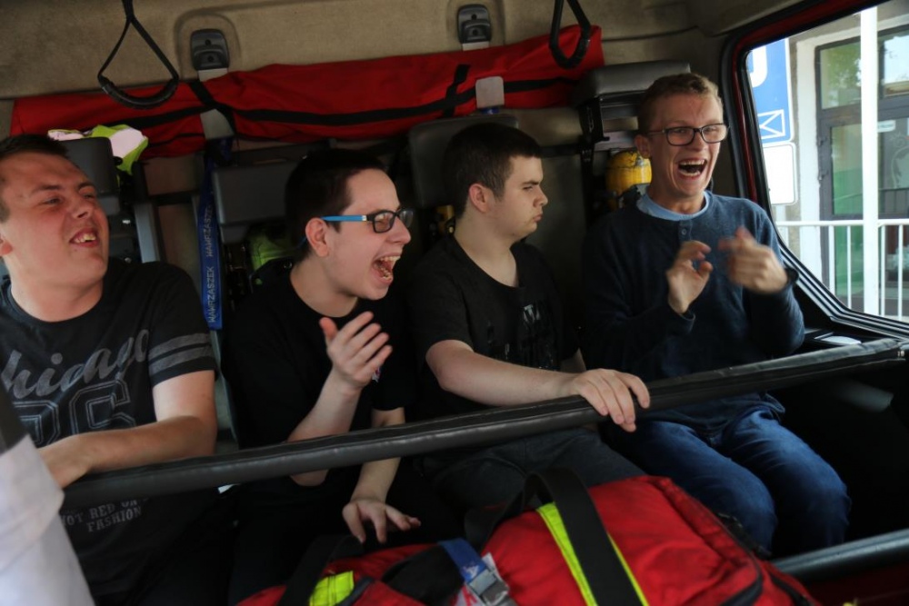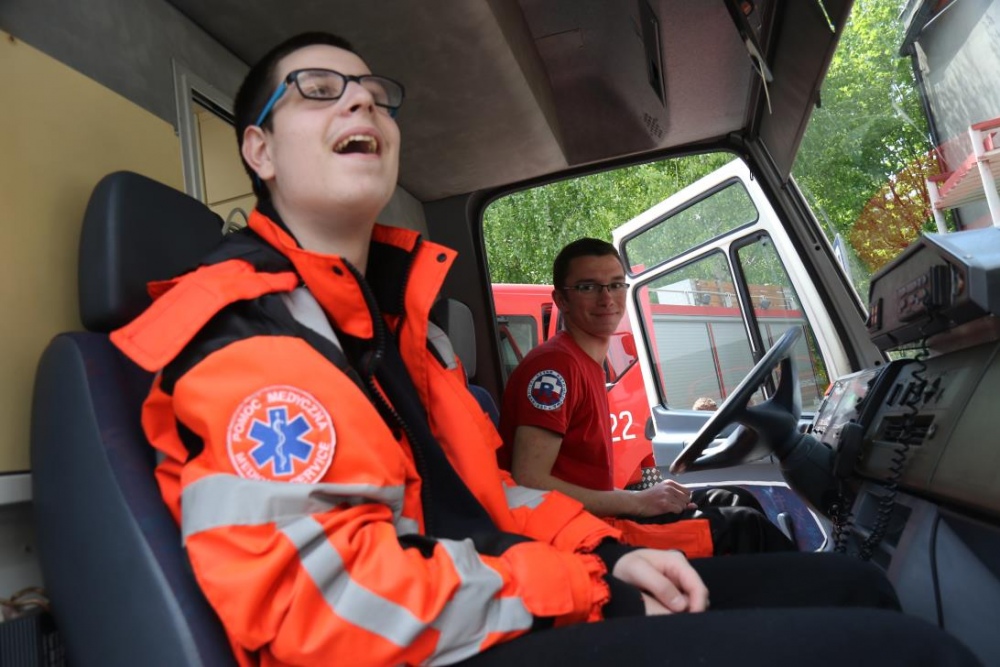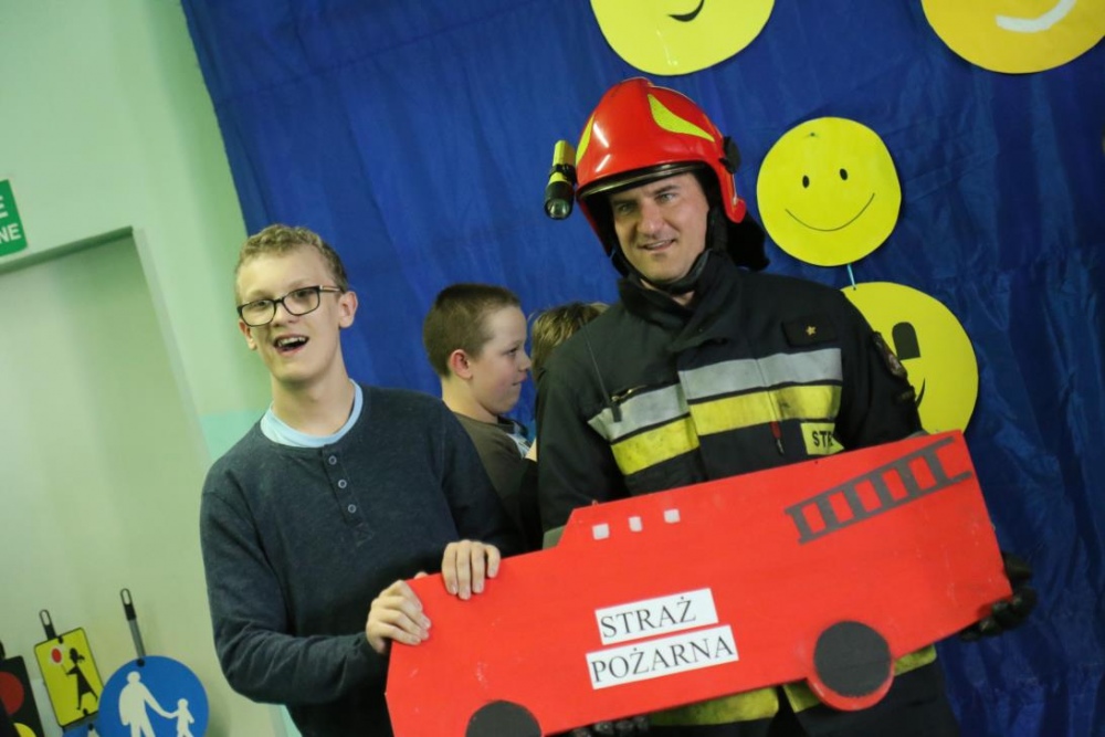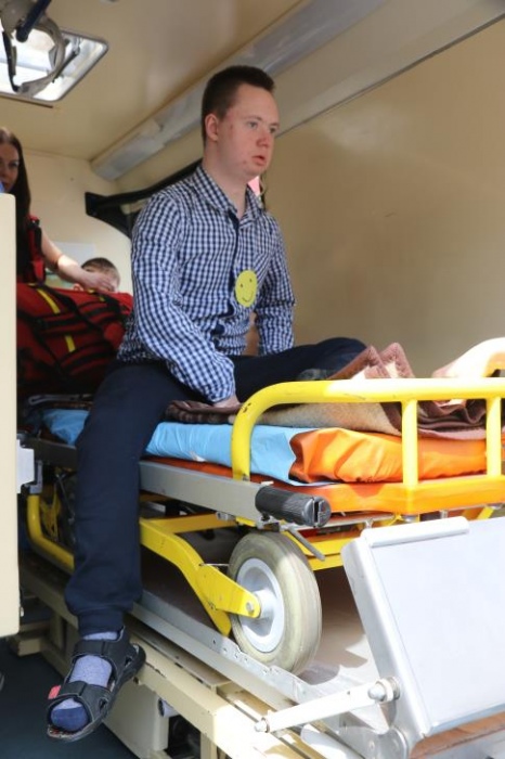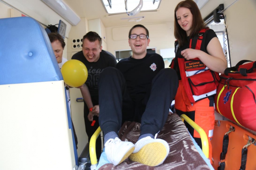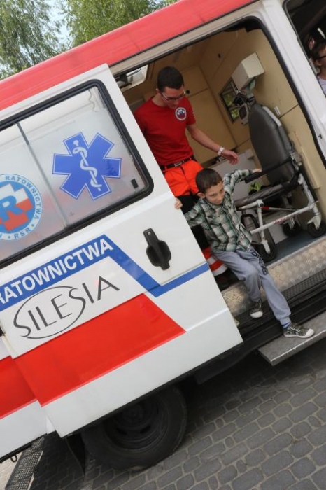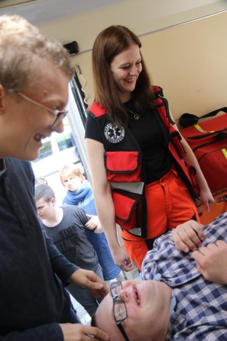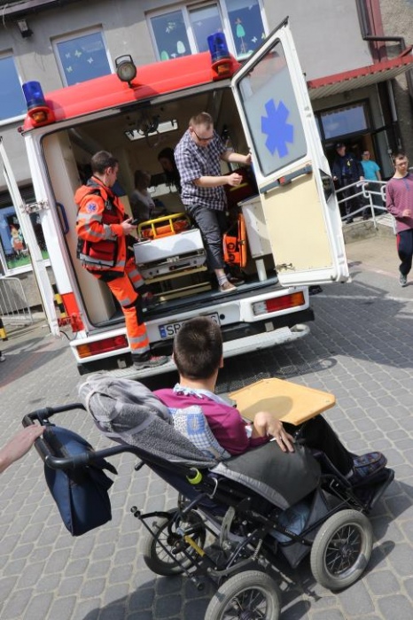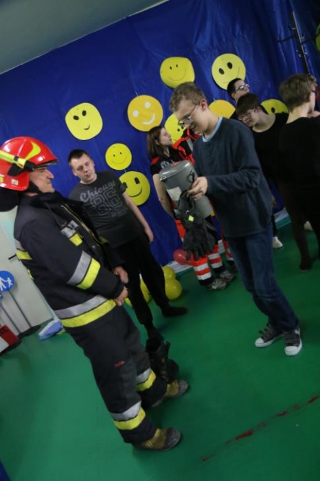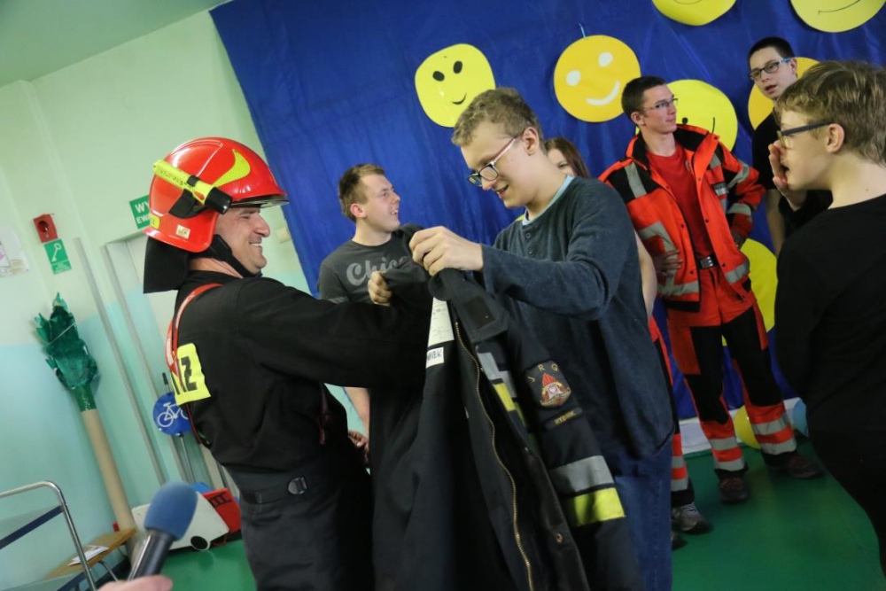 Po zakończonym konkursie uczniowie wyszli na podwórko by od wewnątrz zobaczyć :karetkę, samochód policyjny i wóz strażacki. Mogli wszystkiego dotknąć, położyć się na noszach, nałożyć hełm, usłyszeć głos syren. Radość była ogromna;)