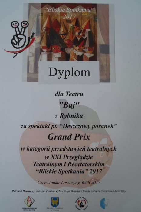 Zespół BAJ za spektakl ,,Deszczowy poranek” otrzymał Grand Prix. Przedstawiciele zespołu, odebrali nagrody oraz puchar Dyrektora MOK w Czerwionce – Leszczynach.