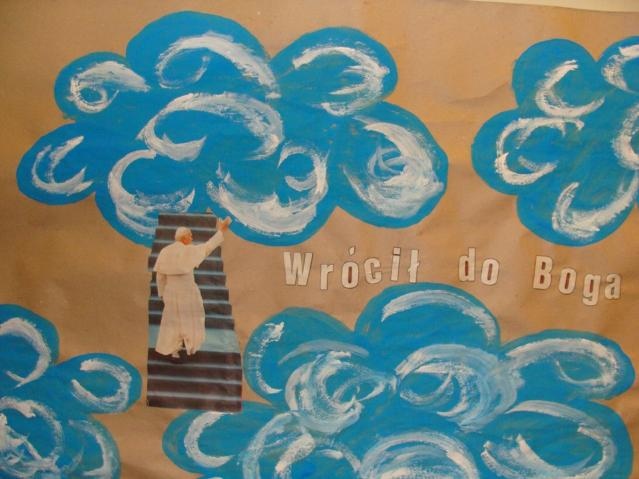 Uczniowie naszej szkoły wraz ze swoimi wychowawcami, także chcą wyrazić swoje podziękowanie. Zorganizowano galerię prac plastycznych pt.: „Po śladach Jana Pawła II do nieba”. W większości są to prace zbiorowe wykonane przez zespoły klasowe, a także indywidualne prace. Kilka z przedstawionych prac wzięło udział w Ogólnopolskim Konkursie plastycznym pt.: „Błogosławiony Jan Paweł II” zorganizowany przez Specjalny Ośrodek Szkolno-Wychowawczy dla Dzieci Słabo Widzących i Niewidomych im. Zofii Książek-Bregułowej w Dąbrowie Górniczej (czekamy na wyniki).