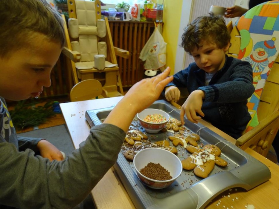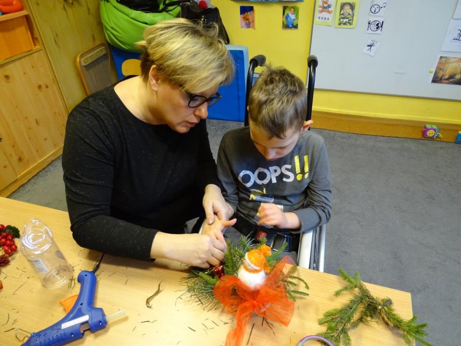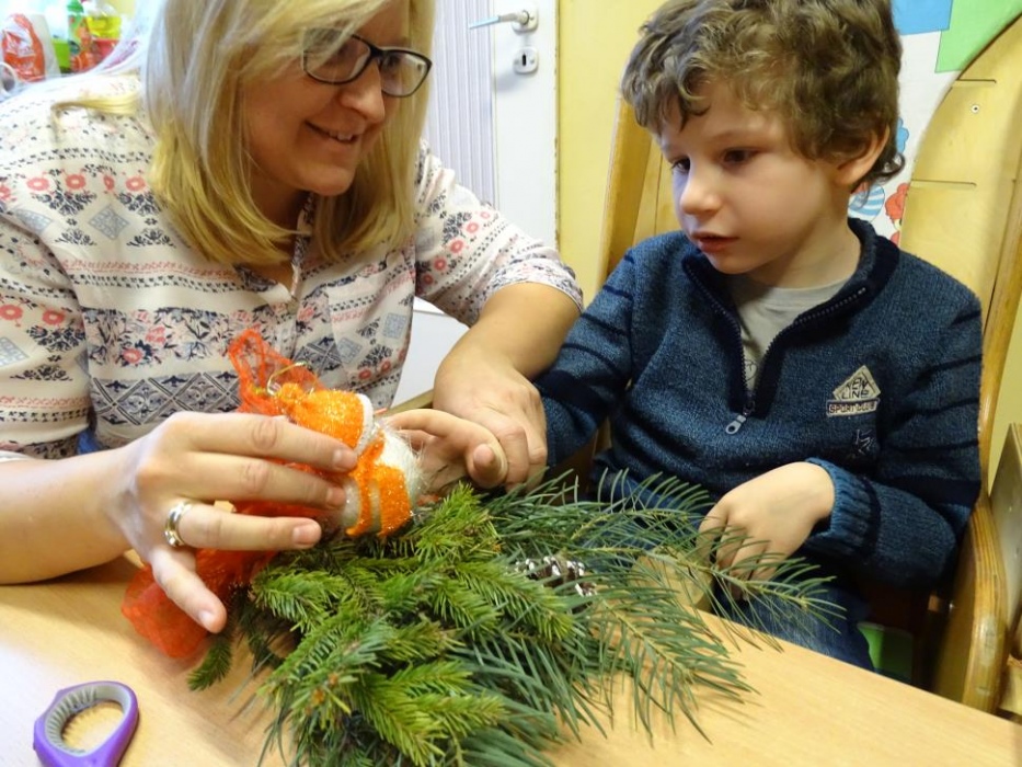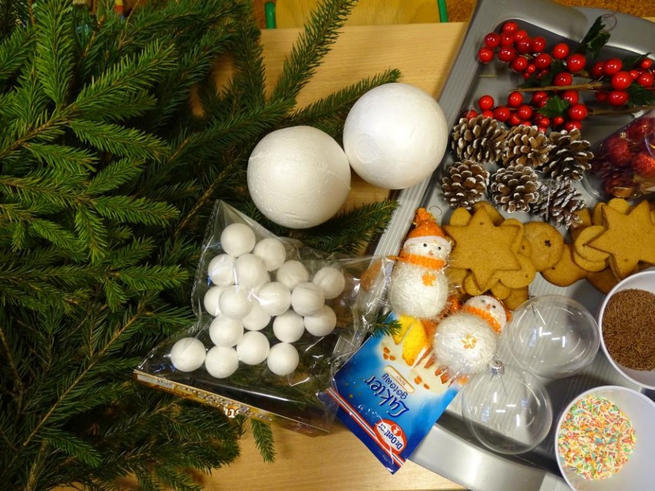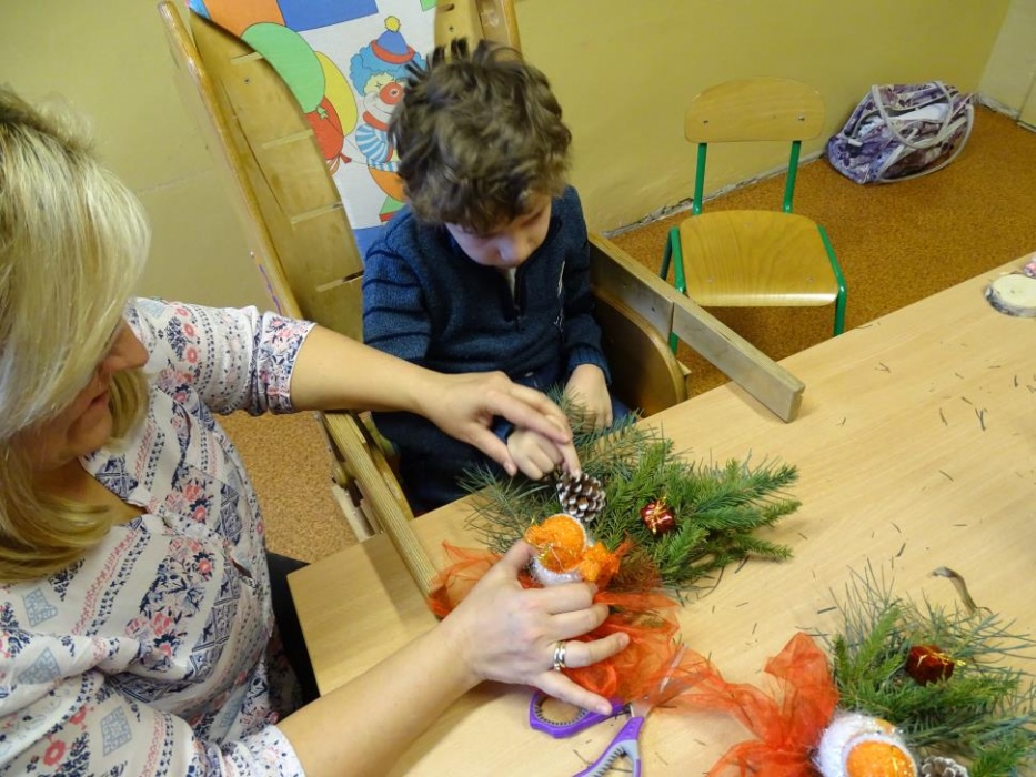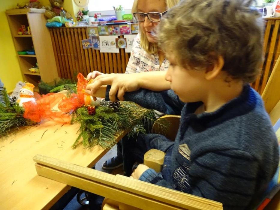 08 grudnia 2017r. w grupie przedszkolnej odbyły się zajęcia otwarte owiane świąteczną atmosferą i super zabawą, w czasie której wykonywaliśmy razem śliczne stroiki z pięknie pachnących choinkowych gałązek, których zapach unosił się w całej sali mieszając się z zapachem piernikowych ludzików i gwiazdek,ozdabianych przez dzieci lukrem i kolorowymi cukierkami. Dzieci z pomocą malowały duże styropianowe bombki ,ozdabiały je brokatem oraz uzupełniały kuleczkami styropianowymi plastikowe kule, które potem razem ze stoikami i piernikami wzięły do domu. Przy stole dominował świąteczny nastrój wypełniony bożonarodzeniowymi melodiami, zapachem cynamonu, goździków, pomarańczy i ciasta piernikowego.